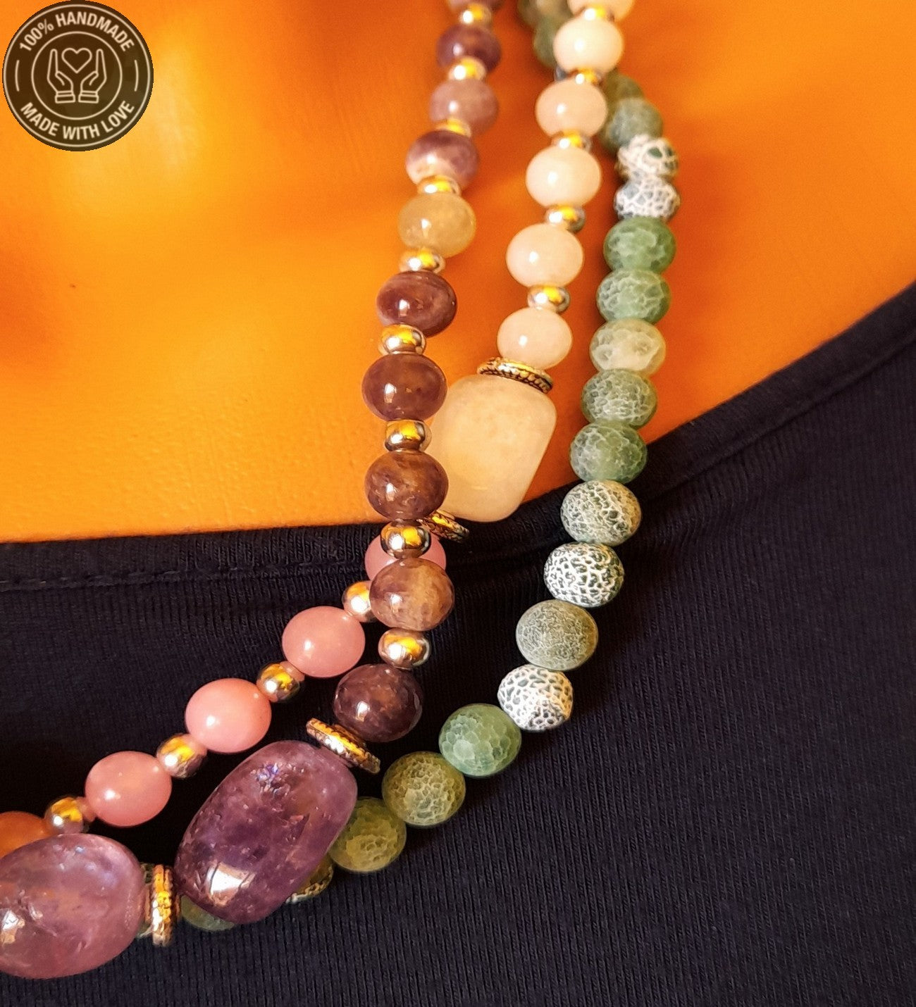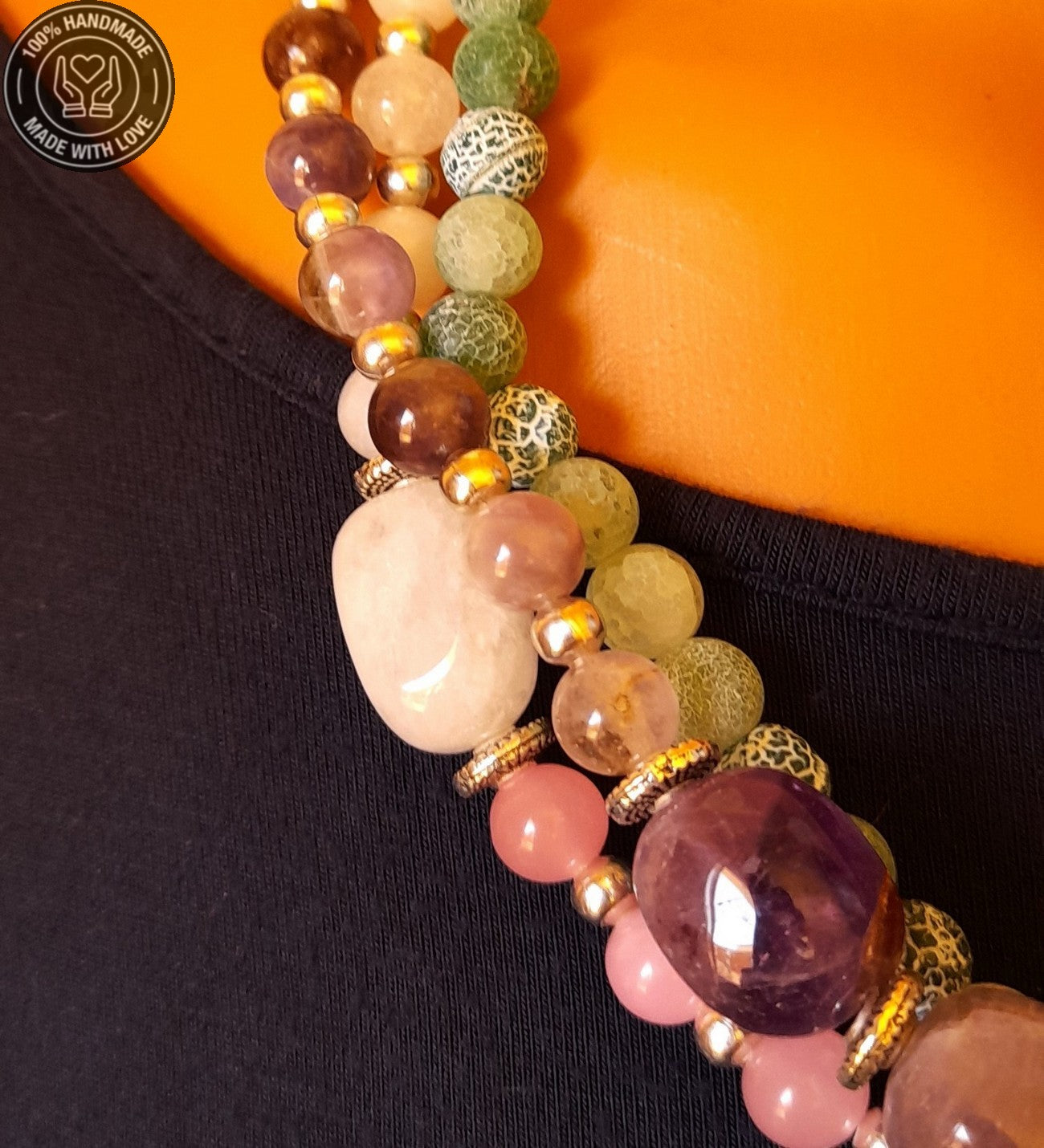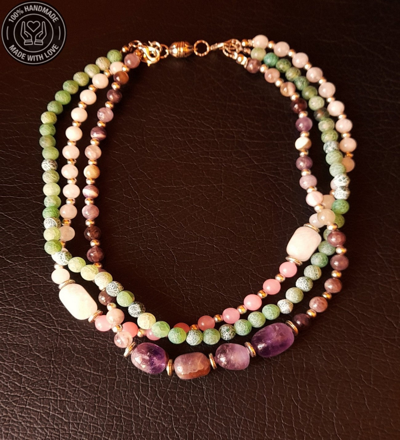 Özenle seçilmiş Ametist, Kuvars ve Akik taşlarıyla hazırlanan bu özel Premium seri 3 sıralı ayrılabilen kolye, el emeğiyle hayat buldu. Ruhunuza denge katacak bu zarif tasarım, size özel bir enerji sunuyor.