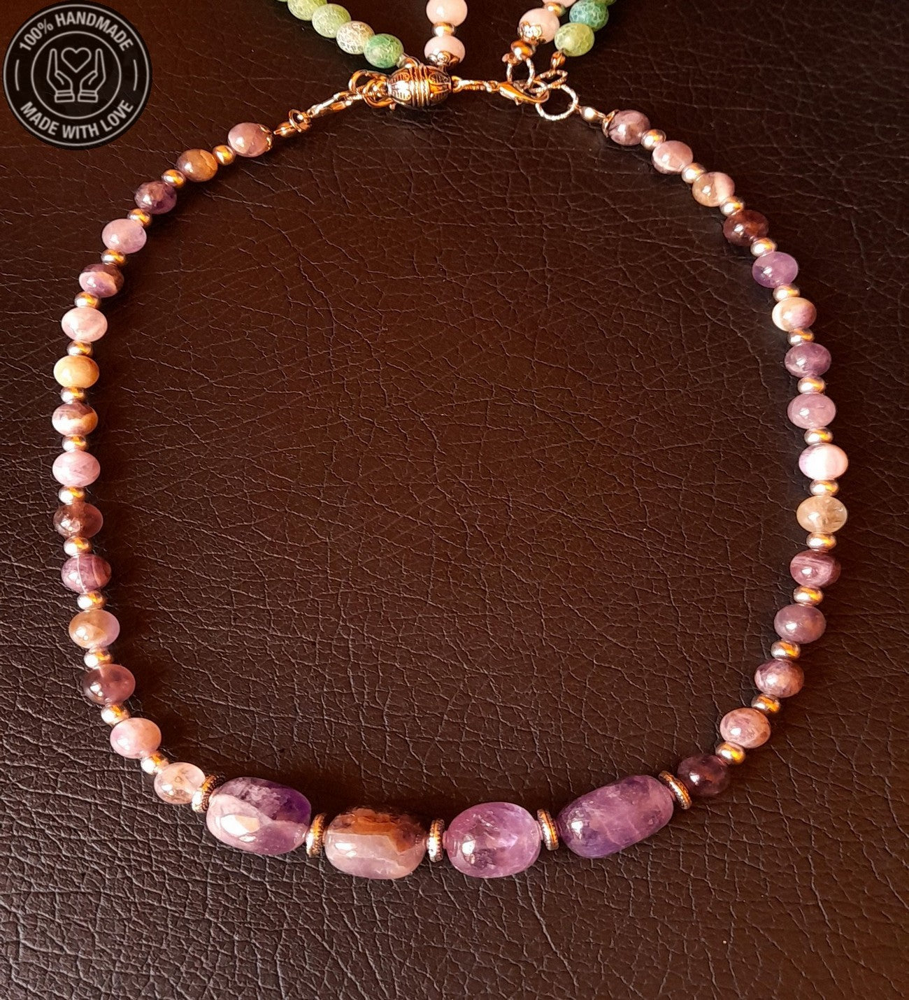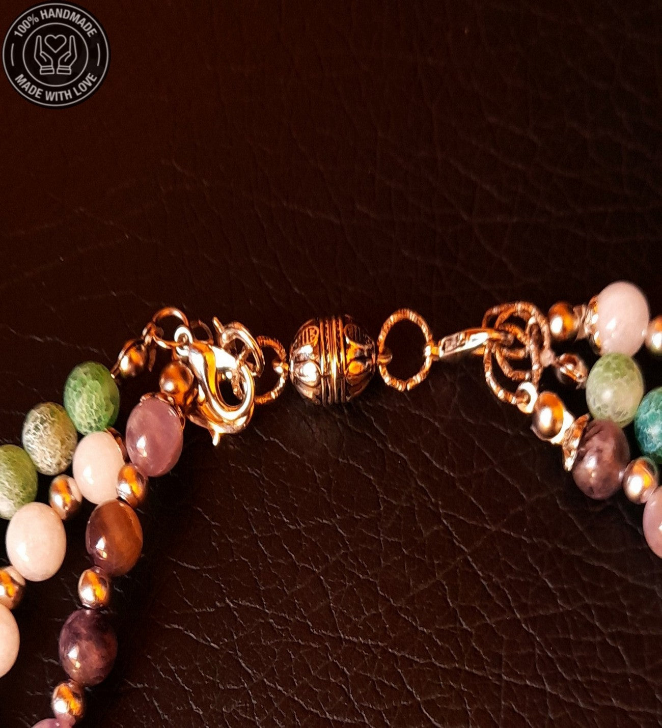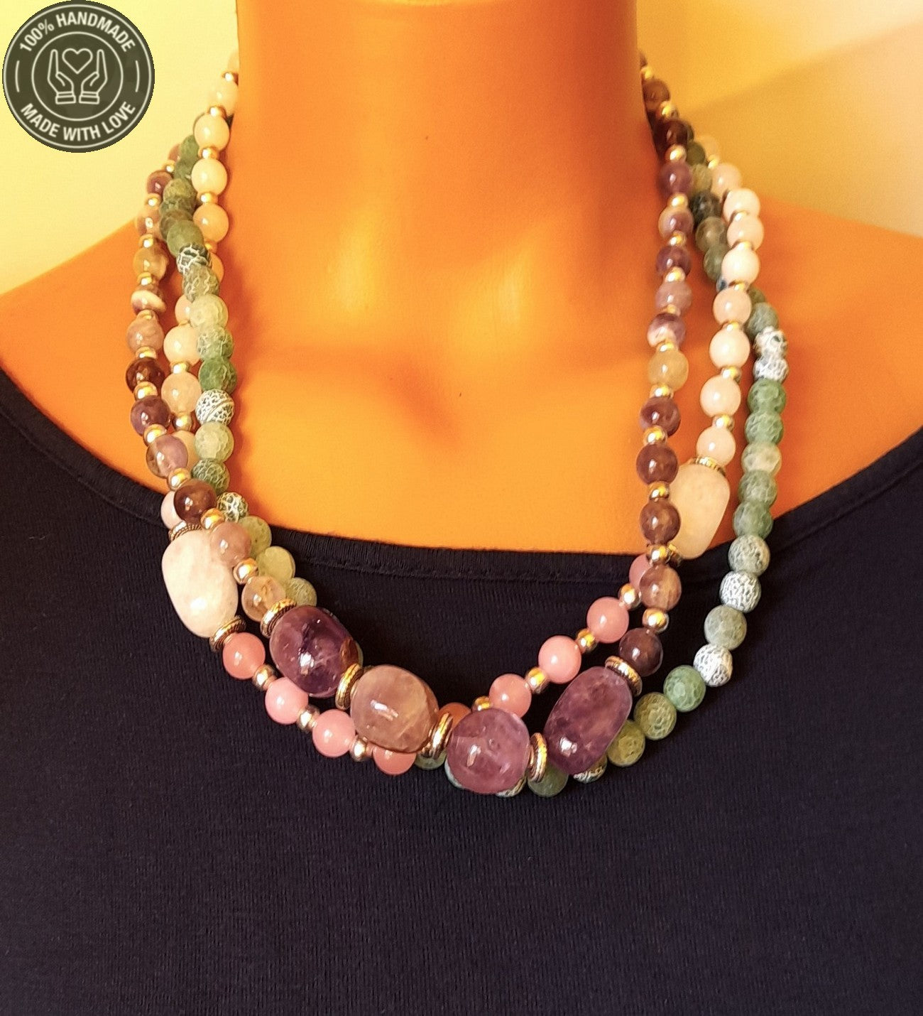 Özenle seçilmiş Ametist, Kuvars ve Akik taşlarıyla hazırlanan bu özel Premium seri 3 sıralı ayrılabilen kolye, el emeğiyle hayat buldu. Ruhunuza denge katacak bu zarif tasarım, size özel bir enerji sunuyor.