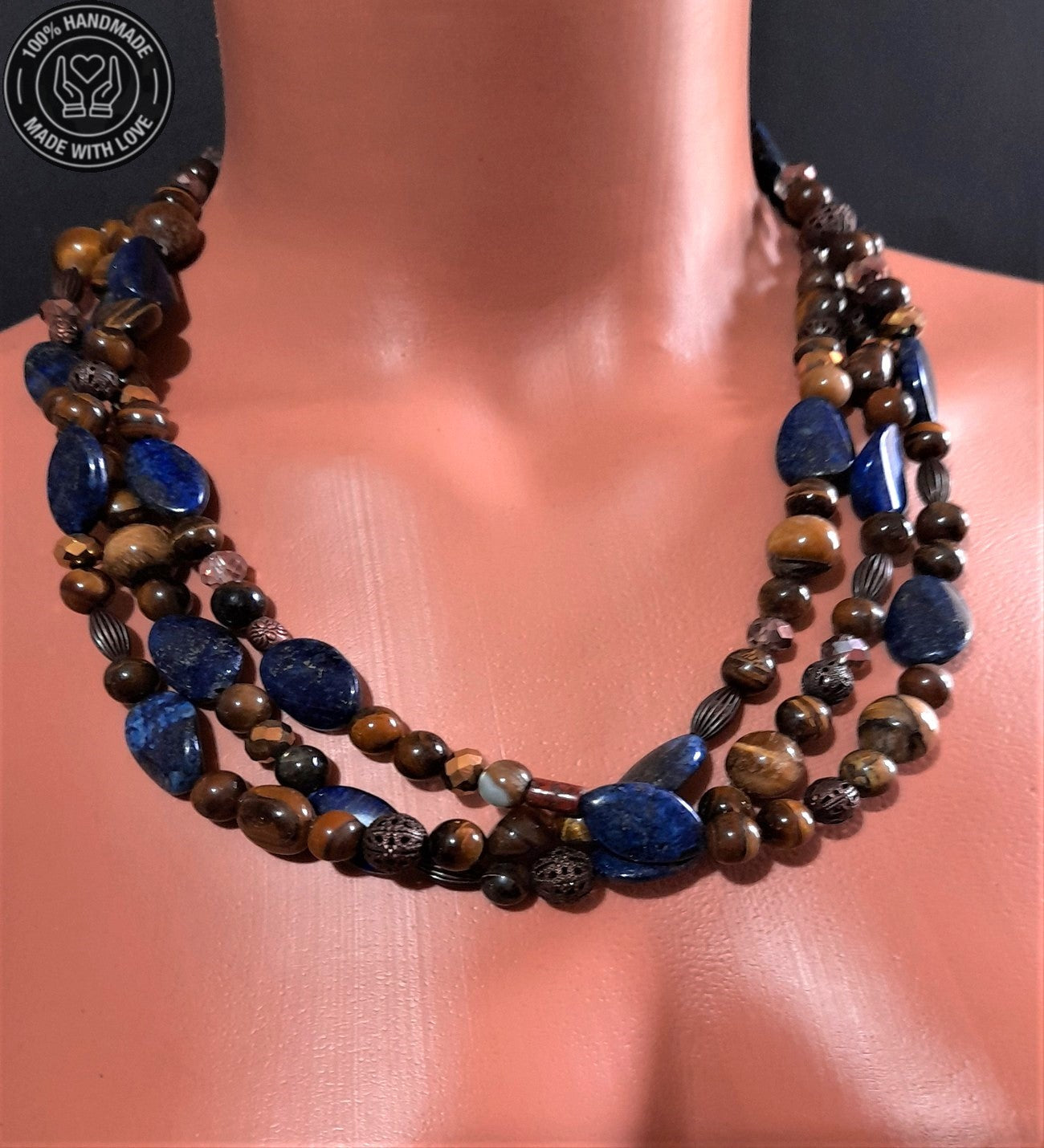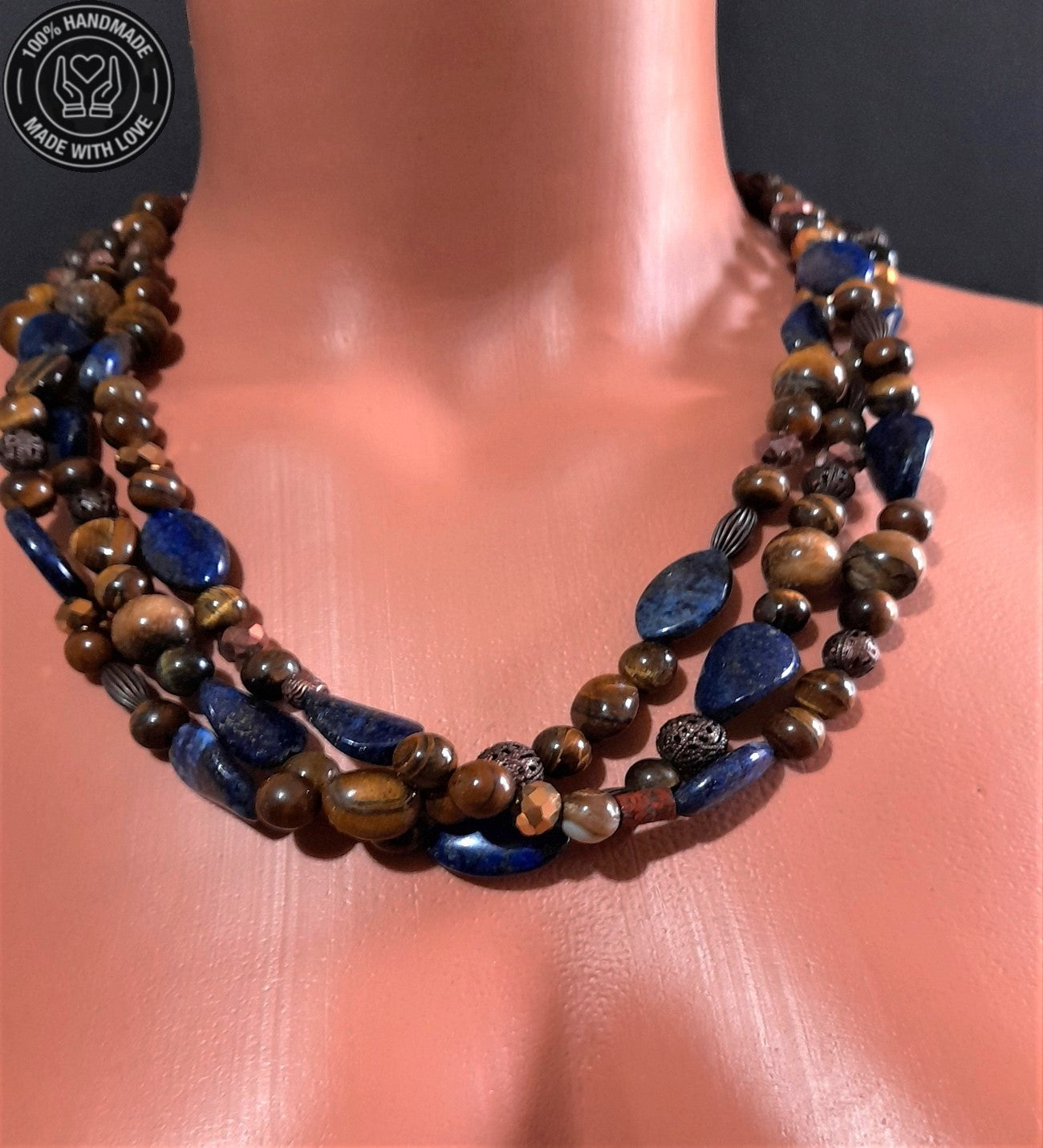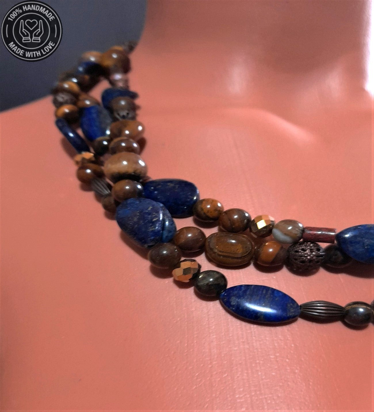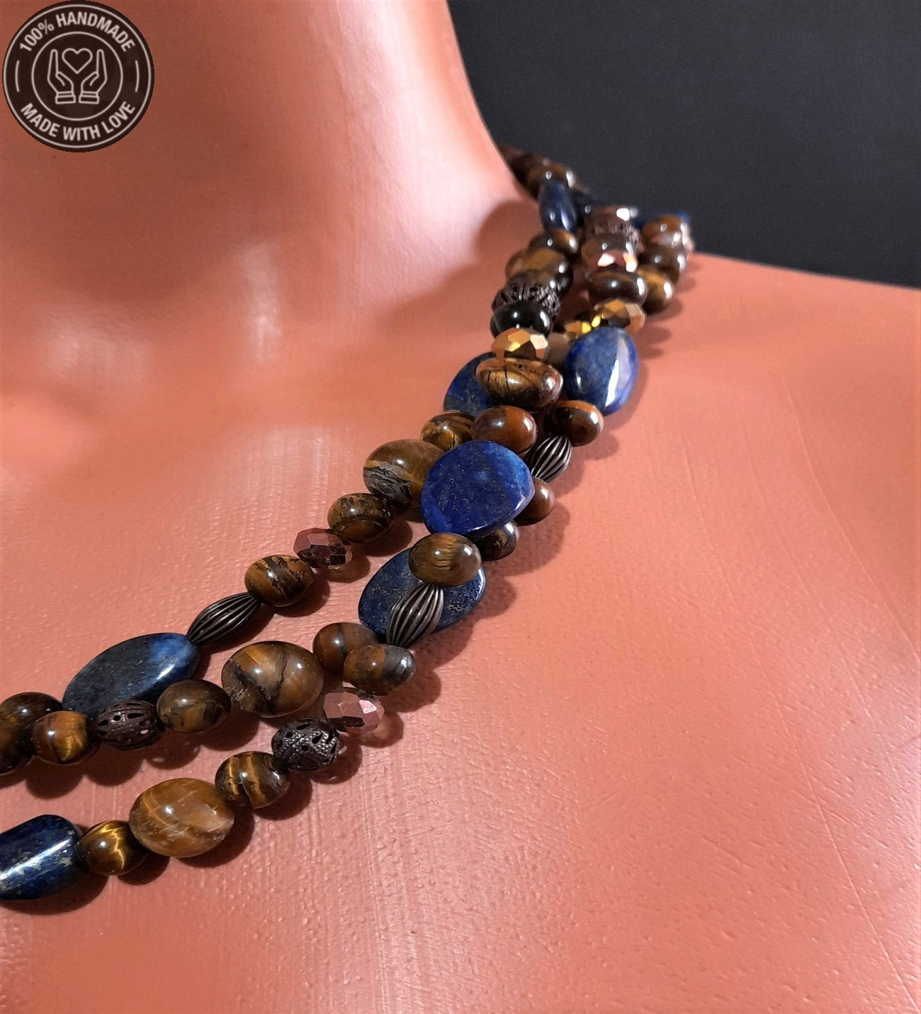 Sevgiyle hazırlanan bu özel tasarım kolye, lapis lazuli ve kaplan gözü taşlarının güçlü enerjilerini bir araya getirir. Lapis odaklanma verirken, kaplan gözü cesaret sunar. Kaplan gözünün nazara karşı etkili olduğuna inanılır. Kolye uzunluğu yaklaşık 48-50 cm'dir. Farklı bir ölçü isterseniz lütfen bildirin.