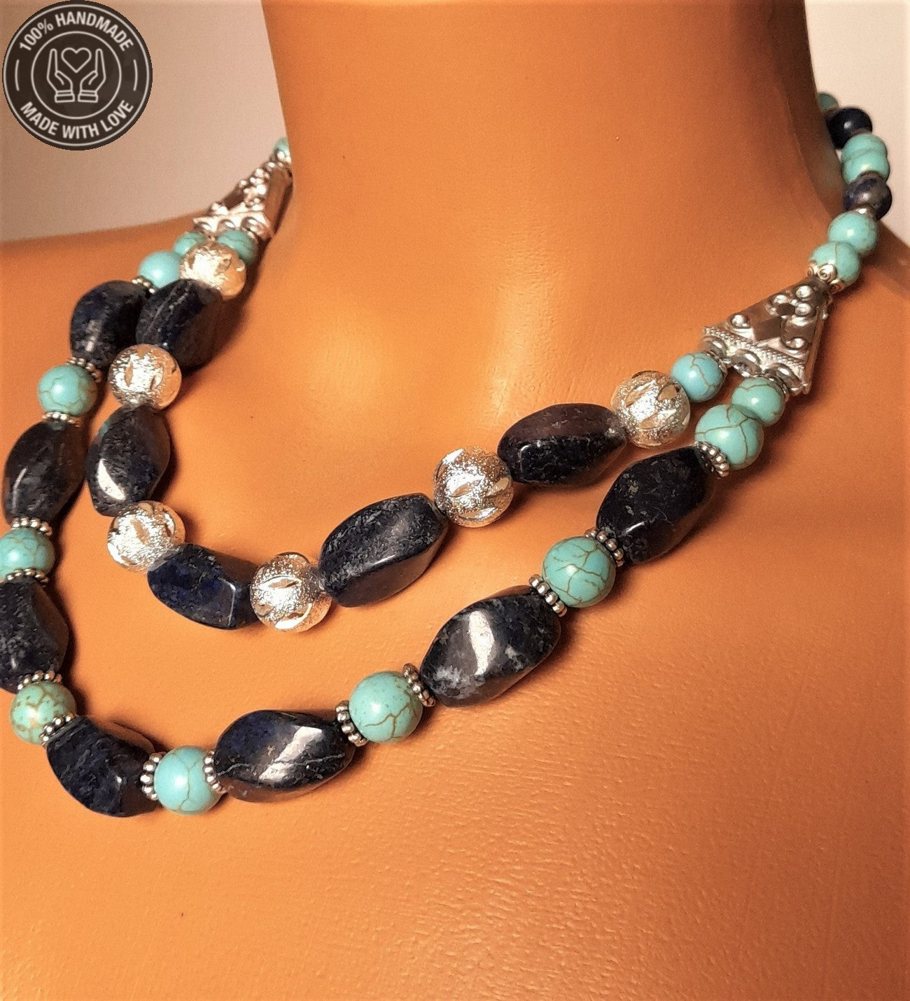 - İletişim, Bilgelik ve Huzurun Eşsiz Buluşması: Bu kolyede gökyüzünün rengi turkuaz ve bilgelik taşı lapis'in enerjileri birleşti.
