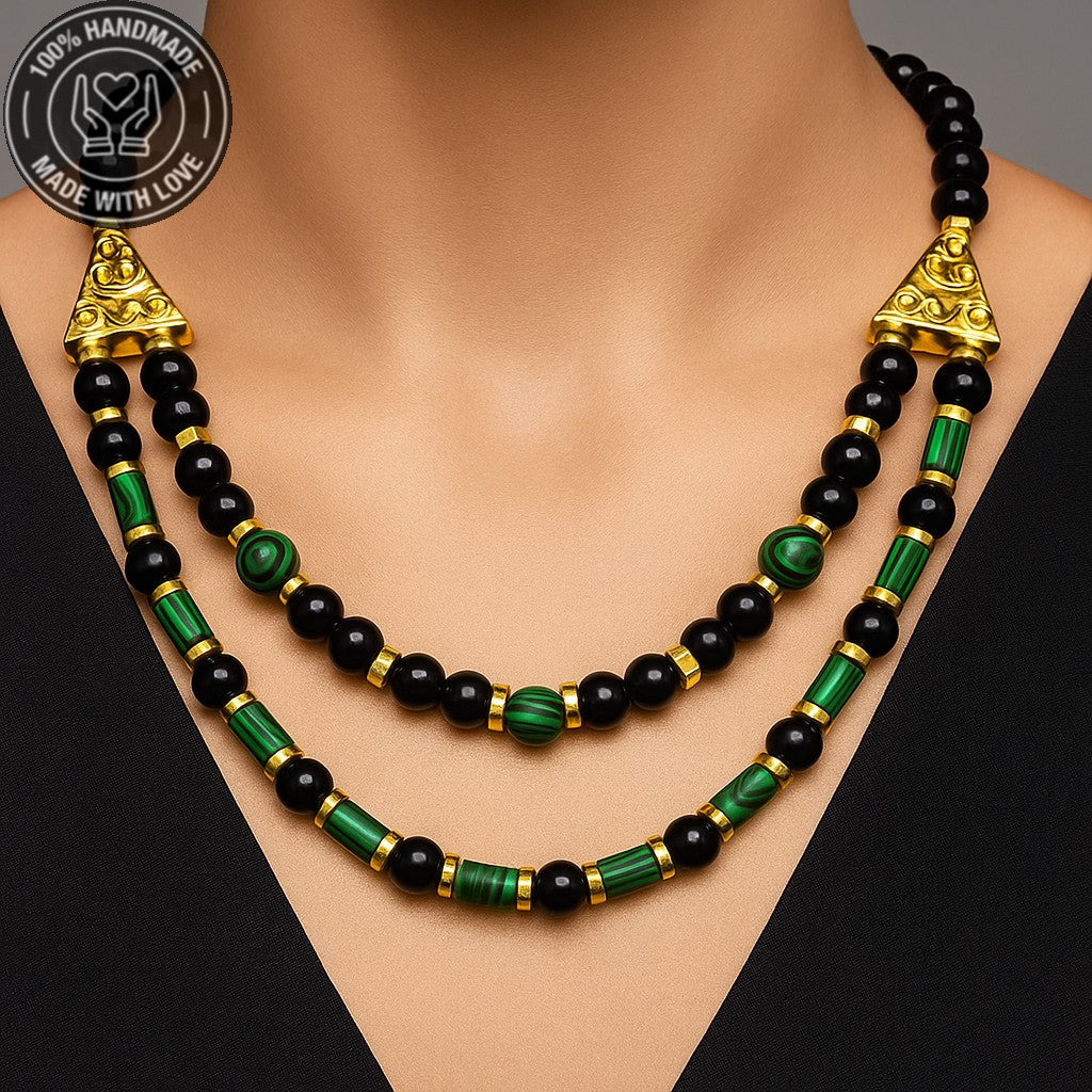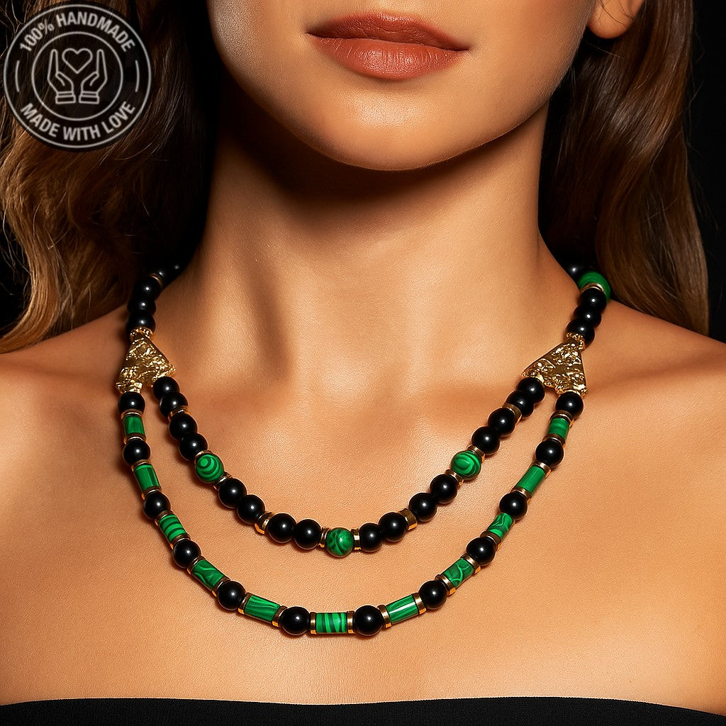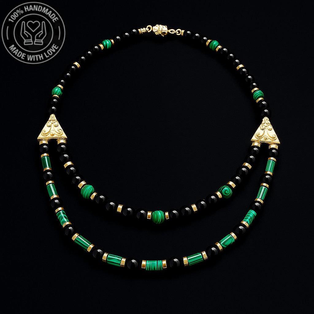 Oniks taşının güçlü ve koruyucu enerjisi, malakit taşının nazardan koruyan ve dönüşüm sağlayan yapısıyla birleşerek etkileyici bir kolye oluşturur. Altın detaylarla modern ve güçlü bir görünüm sunar. Günlük kullanımda hem stil hem de koruma enerjisi isteyenler için özel olarak tasarlanmıştır.