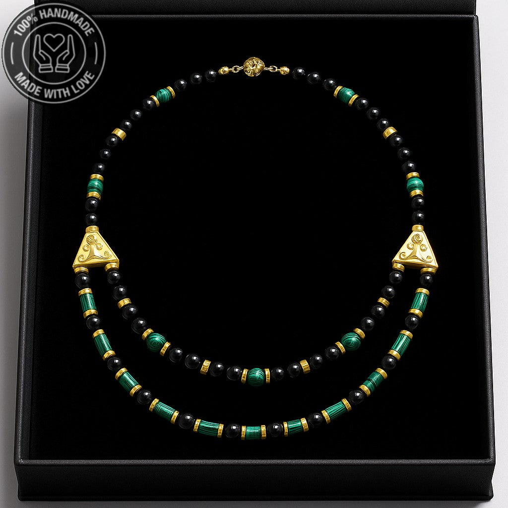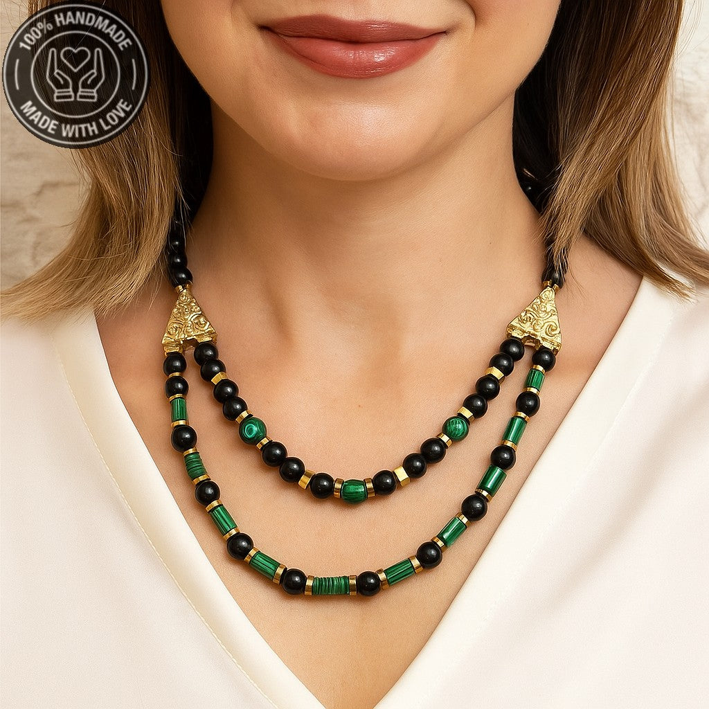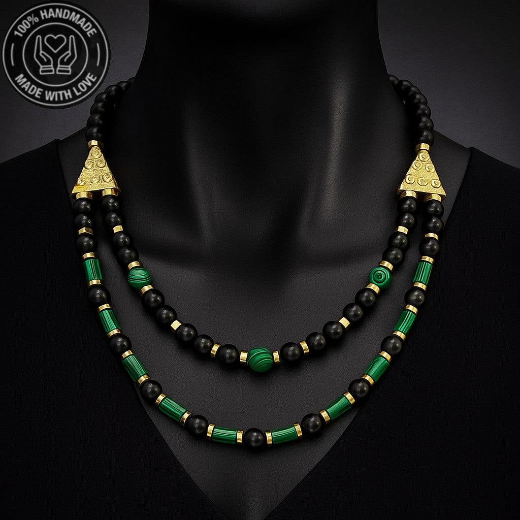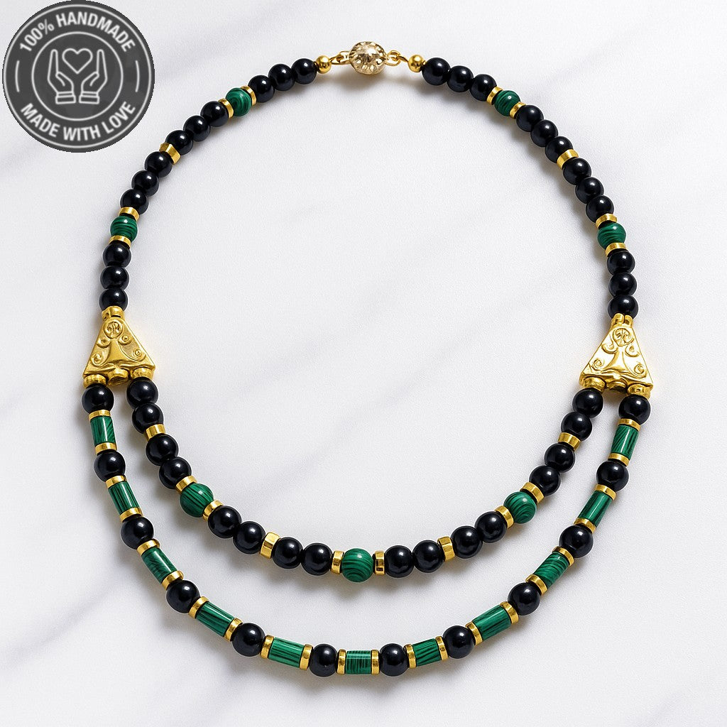 Oniks taşının güçlü ve koruyucu enerjisi, malakit taşının nazardan koruyan ve dönüşüm sağlayan yapısıyla birleşerek etkileyici bir kolye oluşturur. Altın detaylarla modern ve güçlü bir görünüm sunar. Günlük kullanımda hem stil hem de koruma enerjisi isteyenler için özel olarak tasarlanmıştır.