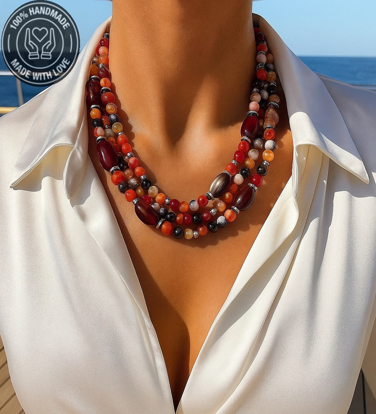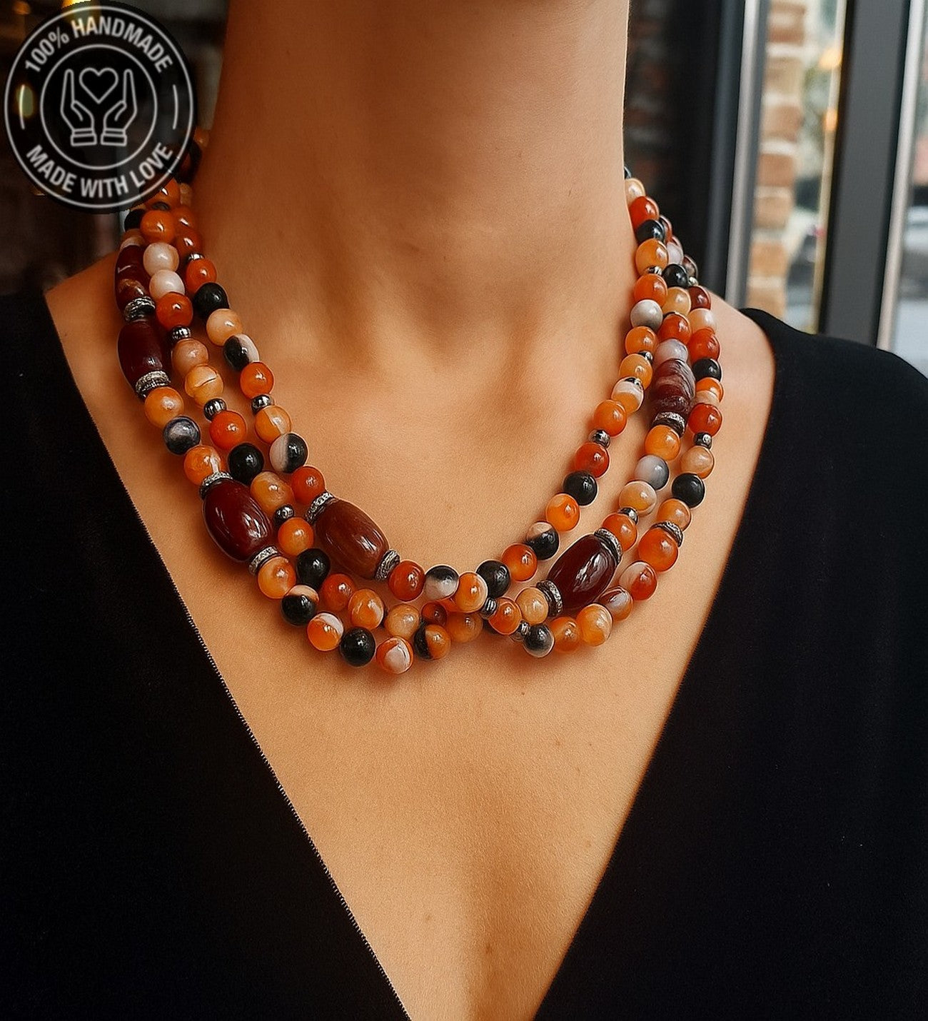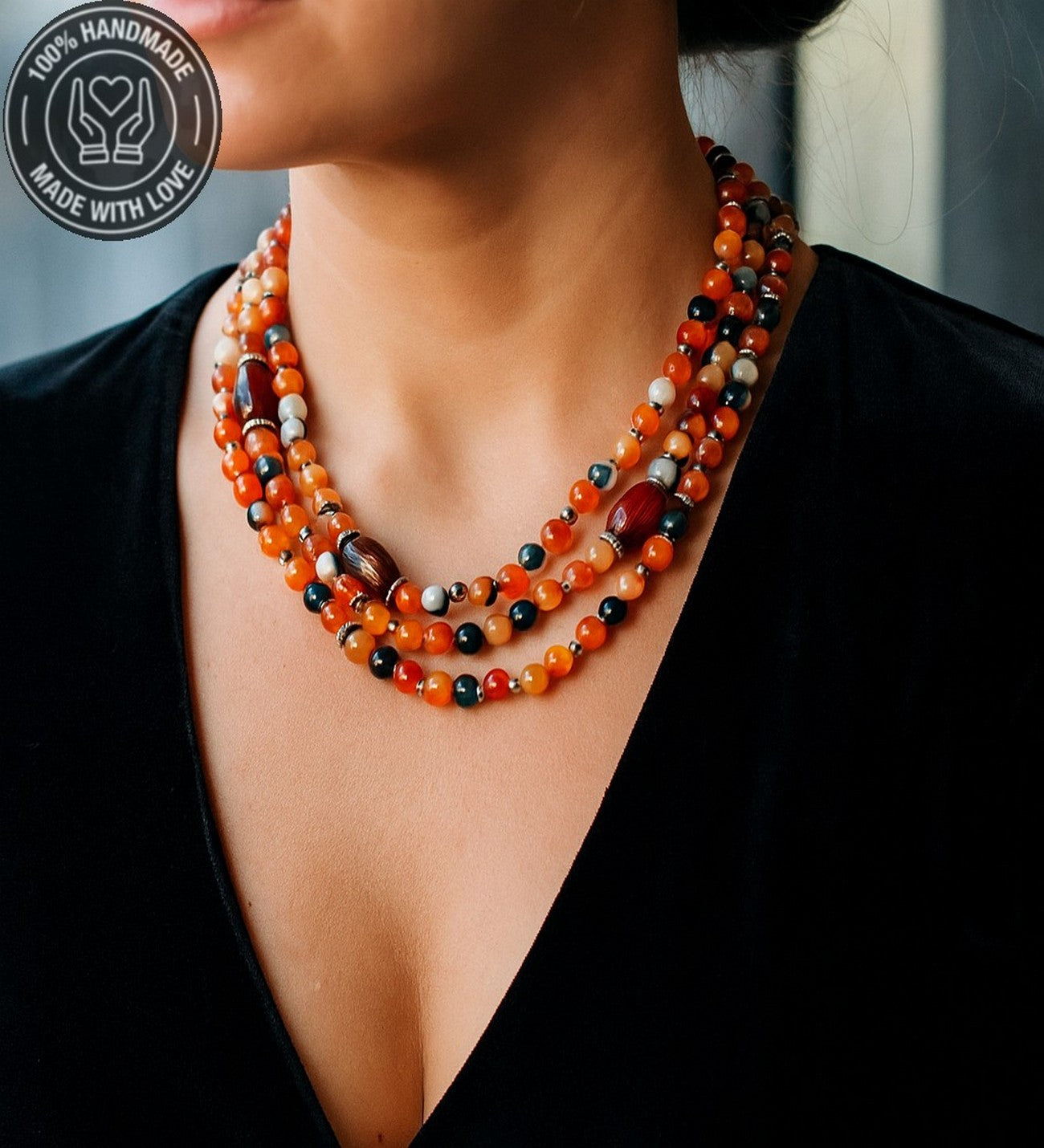 Özenle seçilmiş Turuncu Kahverengi Akik taşlarıyla hazırlanan bu özel Premium seri 3 sıralı kolye, el emeğiyle hayat buldu. Ruhunuza denge katacak bu zarif tasarım, size özel bir enerji sunuyor.