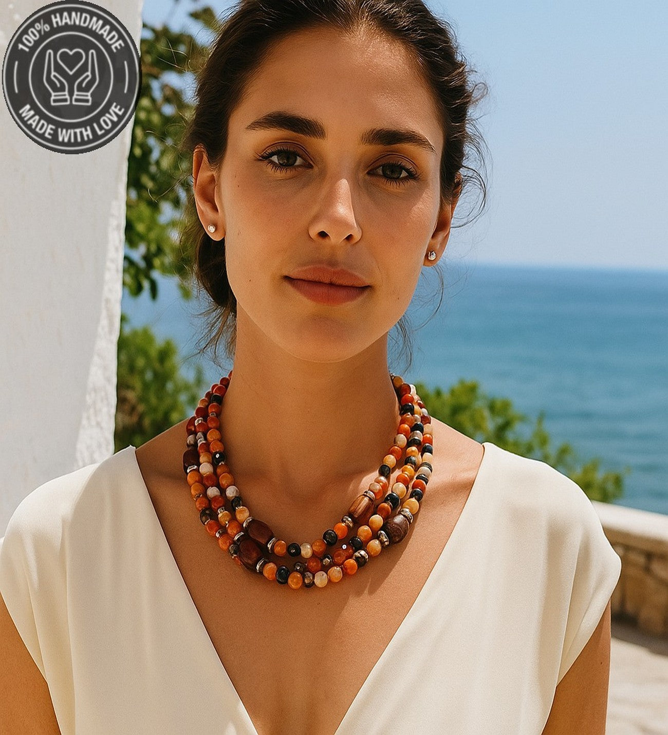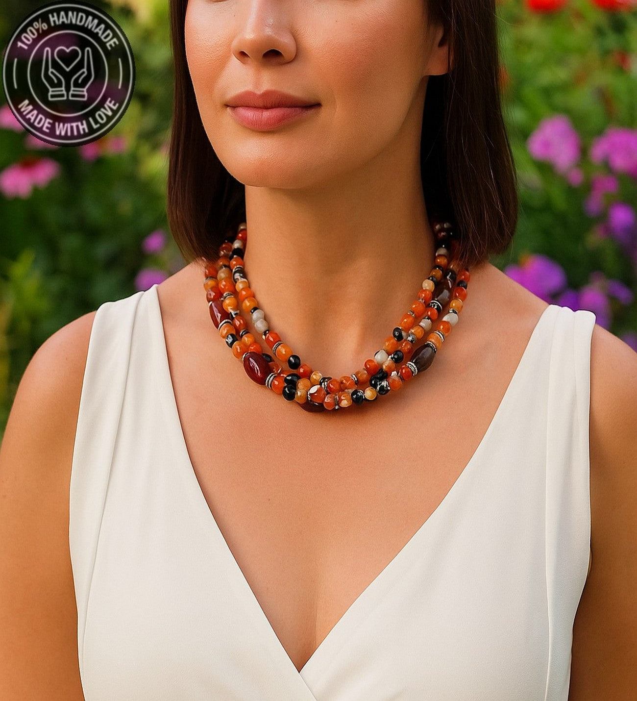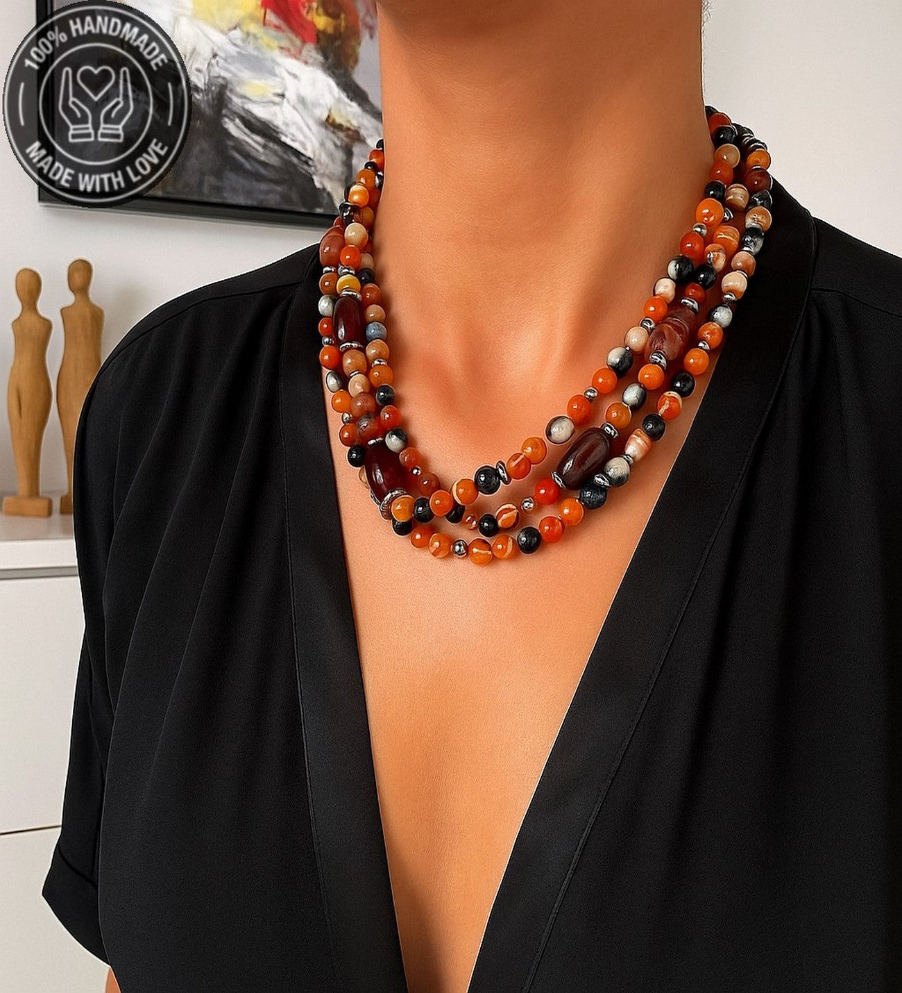 Özenle seçilmiş Turuncu Kahverengi Akik taşlarıyla hazırlanan bu özel Premium seri 3 sıralı kolye, el emeğiyle hayat buldu. Ruhunuza denge katacak bu zarif tasarım, size özel bir enerji sunuyor.