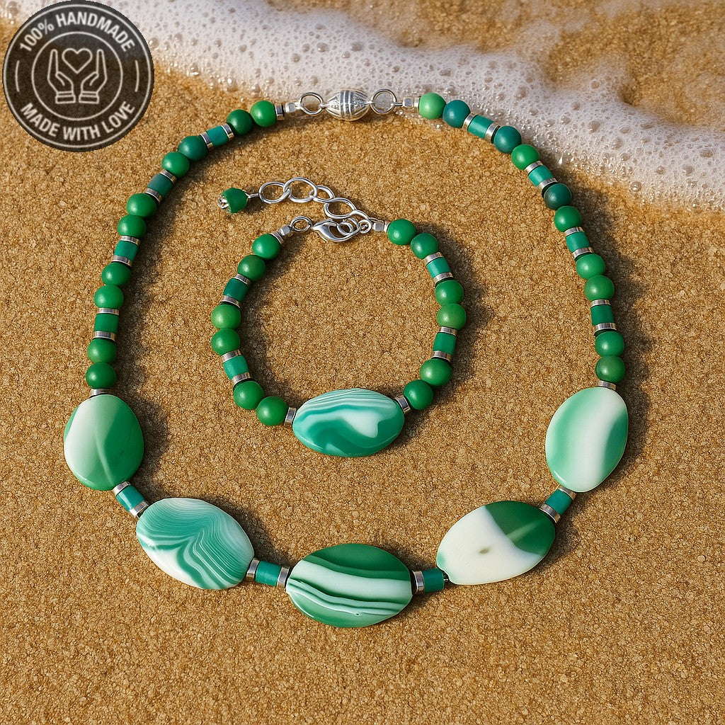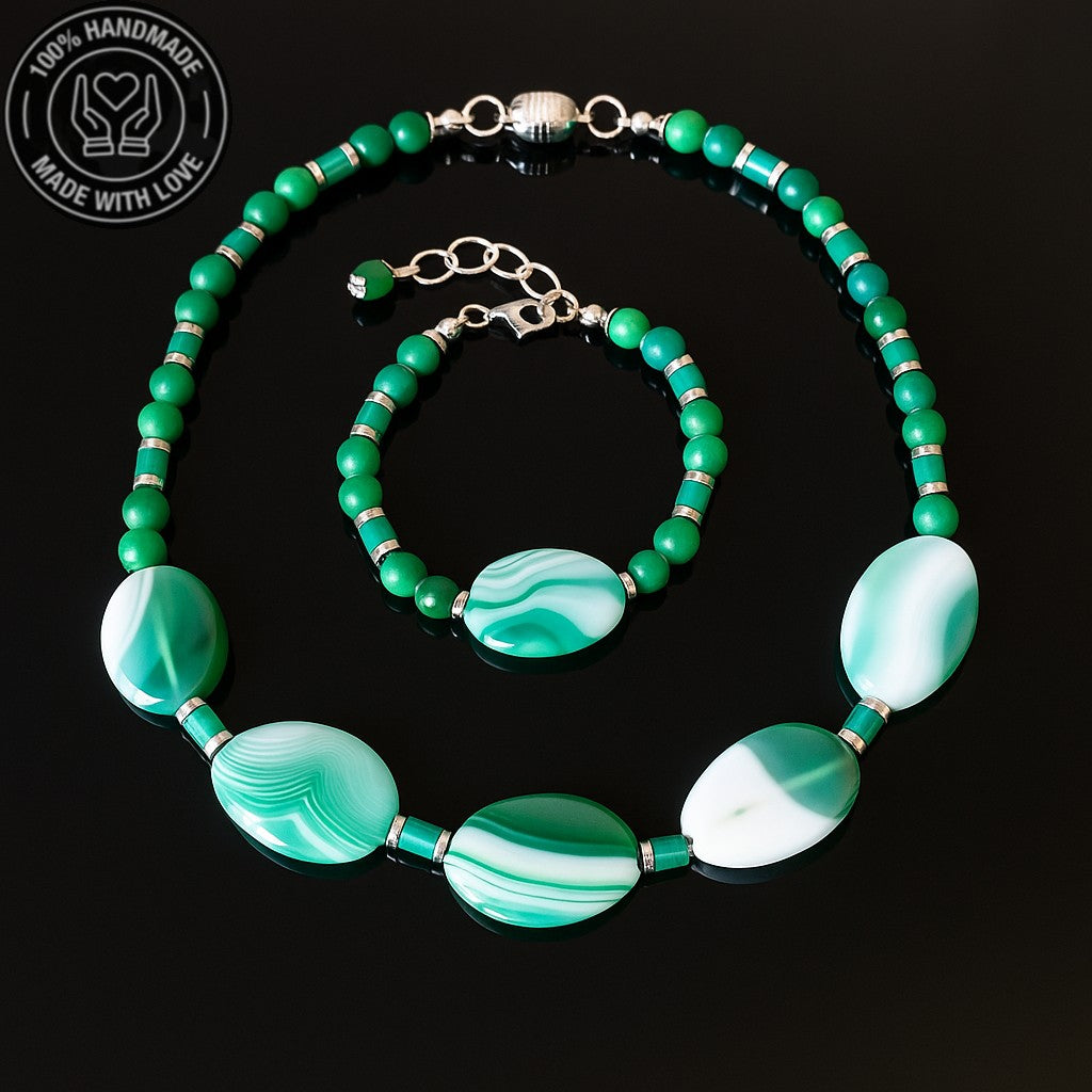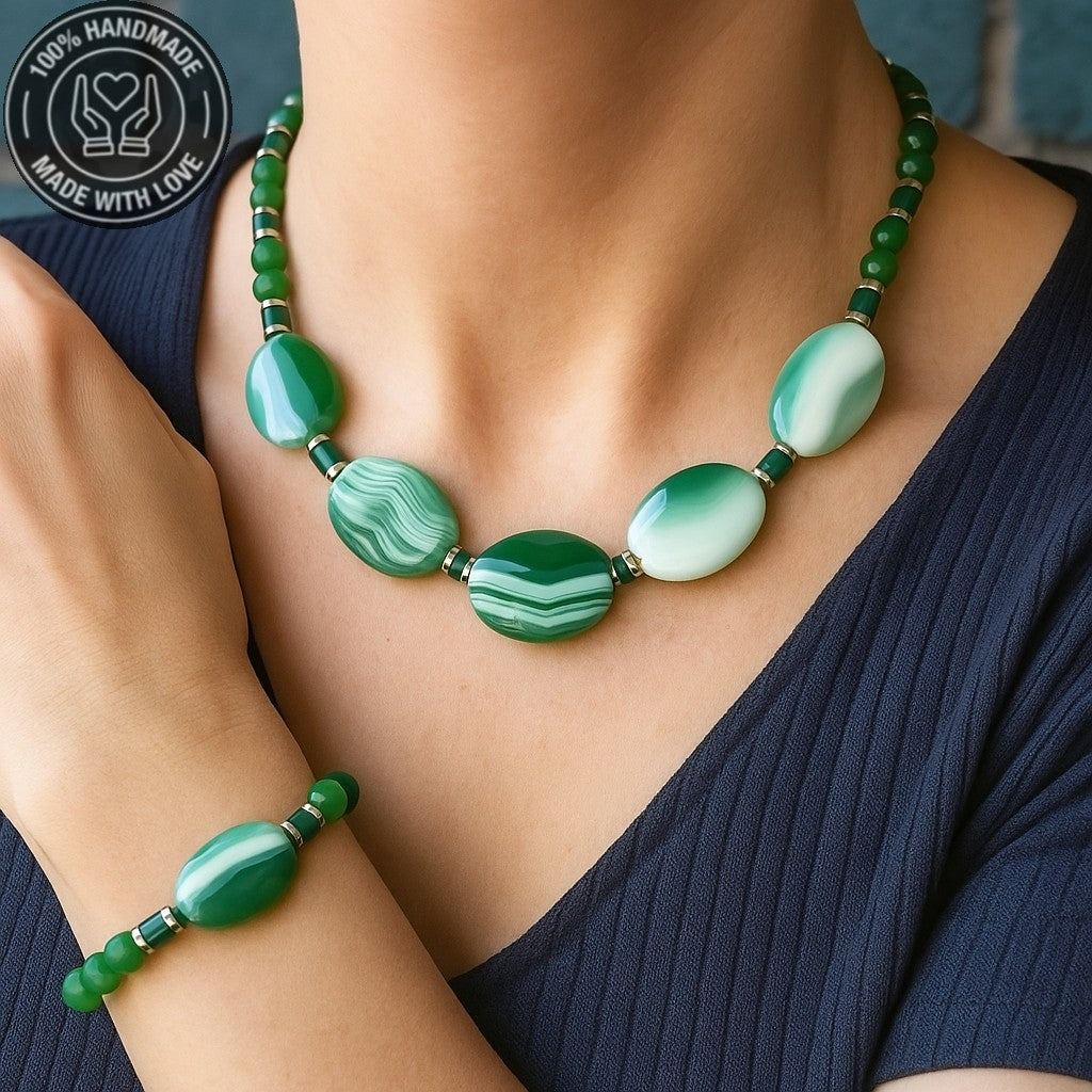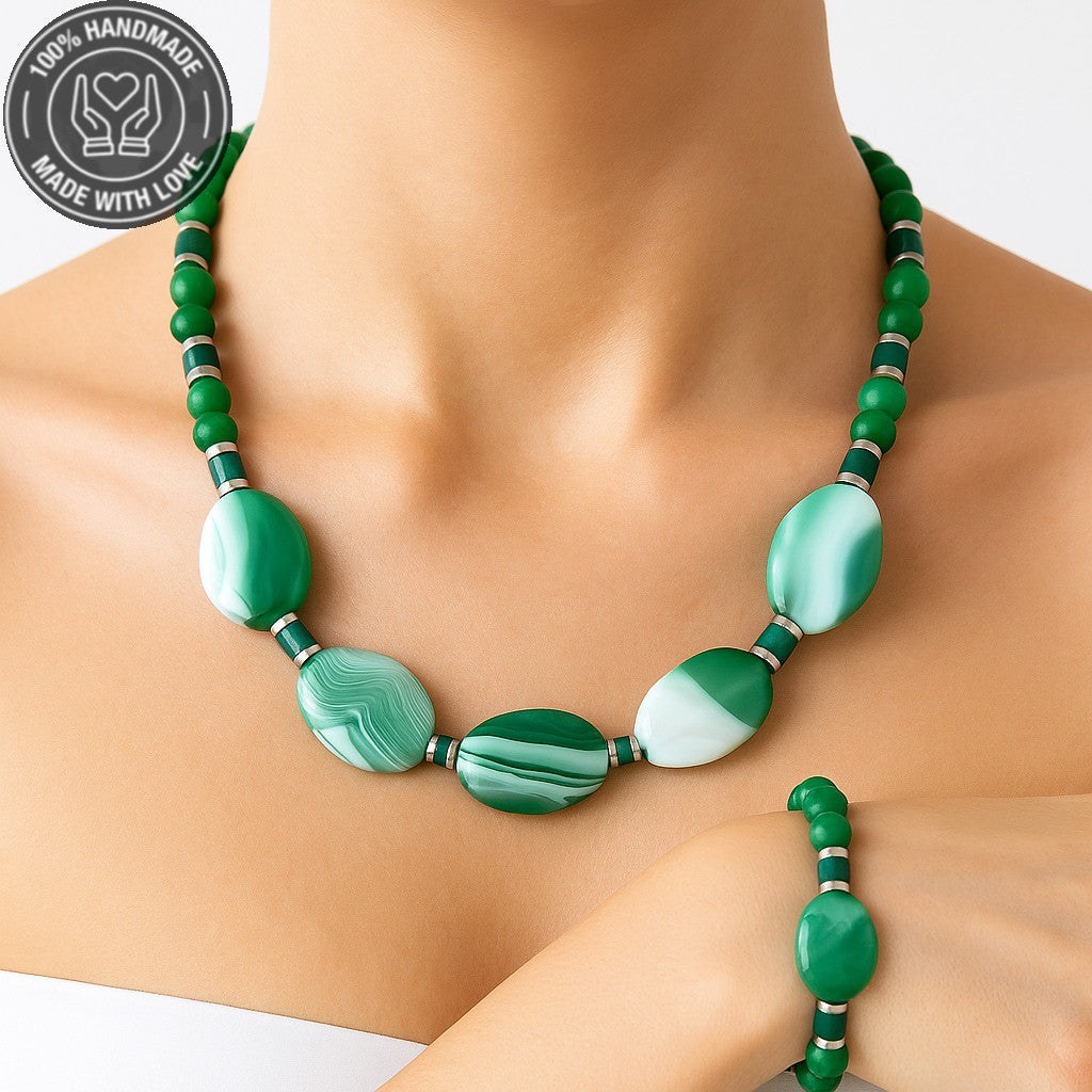 Doğal yeşil akik taşıyla el yapımı bu set, tazeleyici enerjisi ve doğal görünümüyle size eşlik eder.
