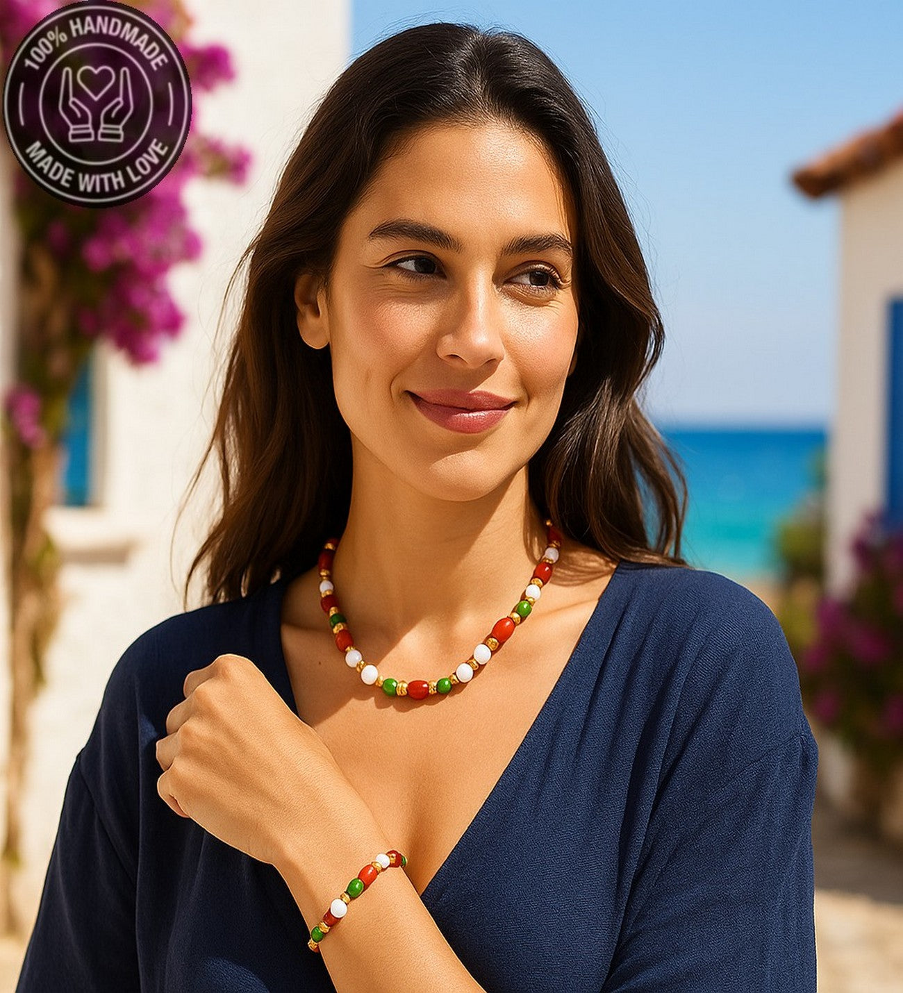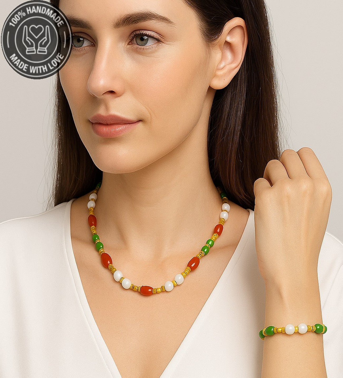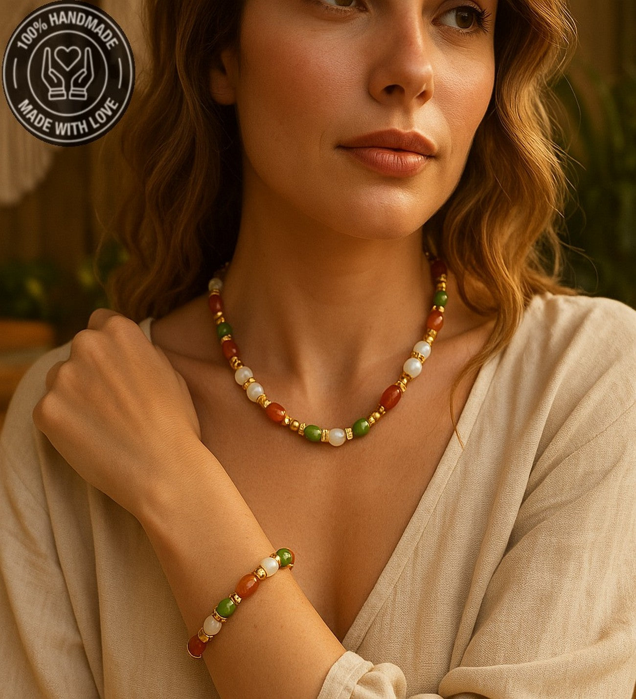 Uyumlu kolye ve bileklik tasarımı ile doğal ve anlamlı bir bütünlük sağlar.