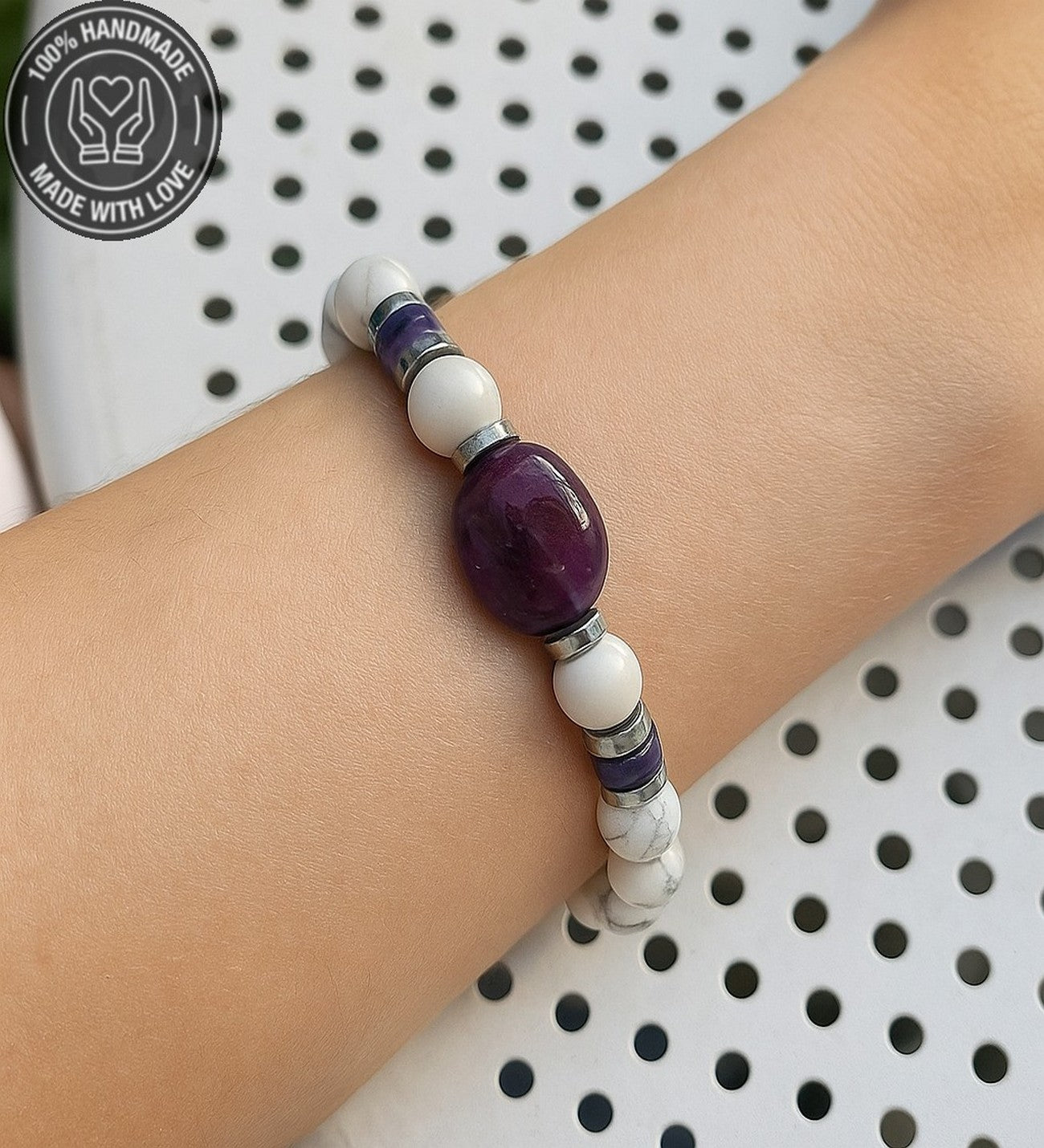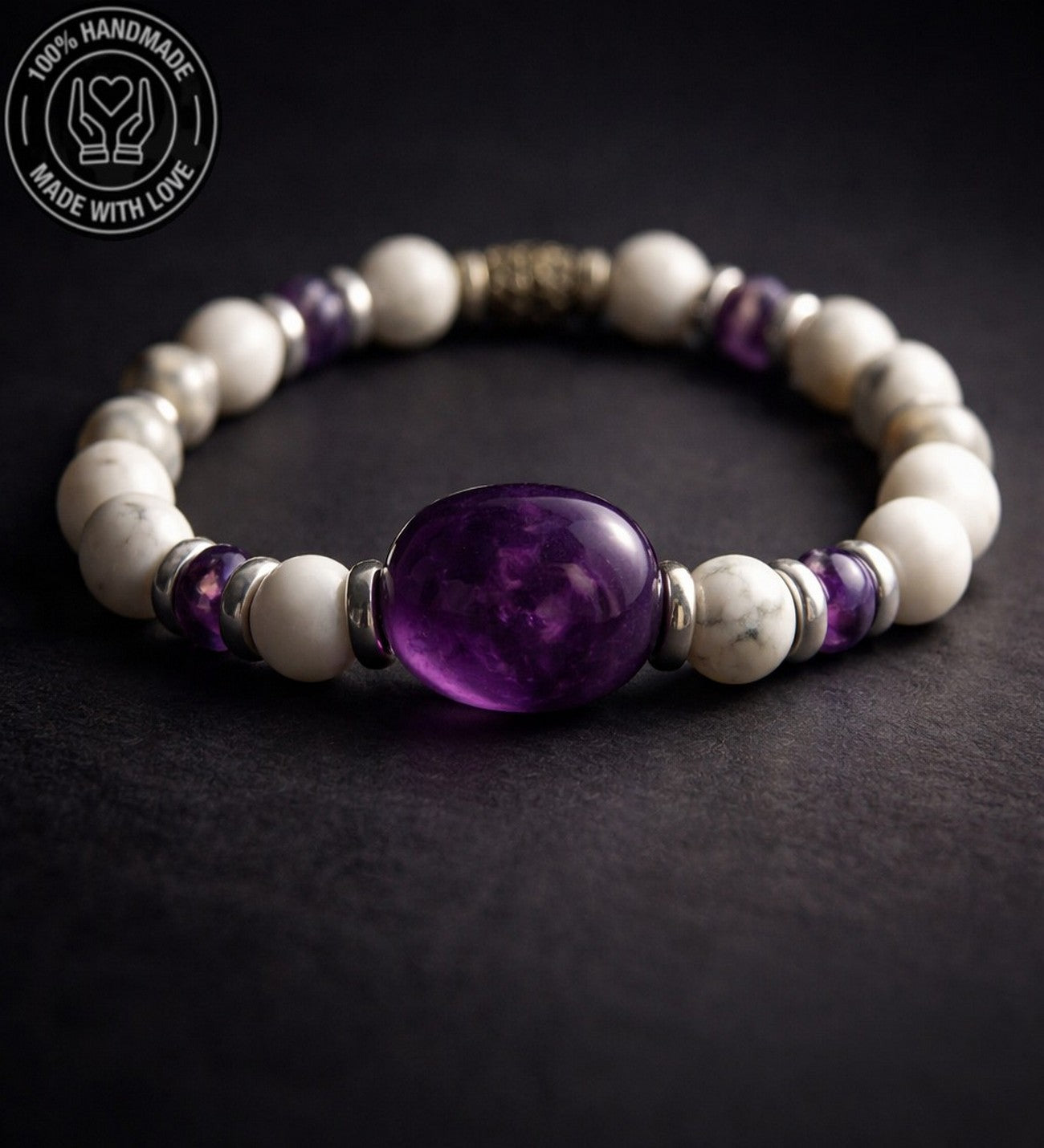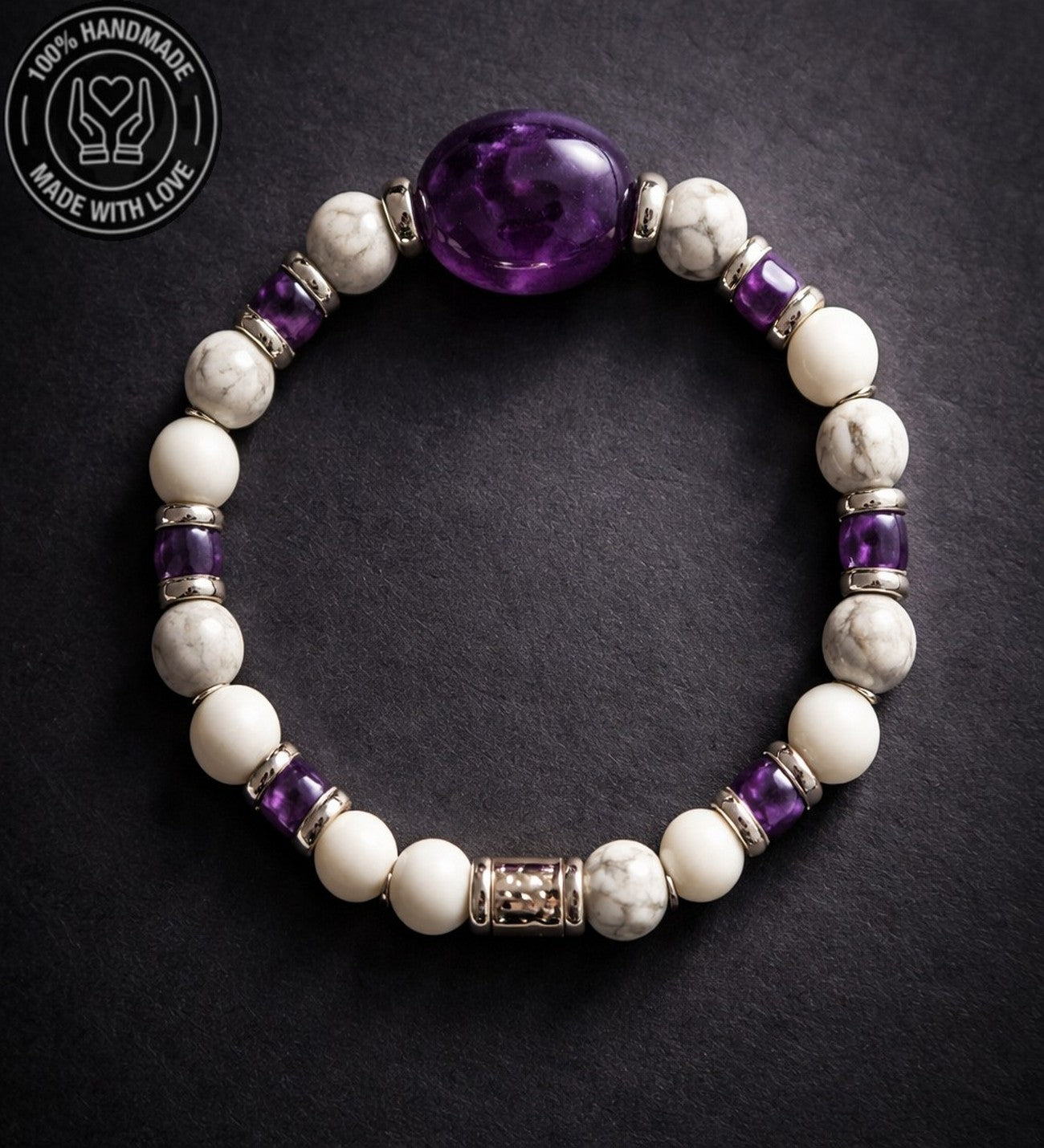 19-20 cm uzunluğundaki bu özel bileklik, ametist, havlit ve hematit taşlarının eşsiz uyumuyla tasarlandı. Eğer farklı bir ölçüde sipariş vermek istiyorsanız lütfen bunu not kısmında belirterek bize bildiriniz.