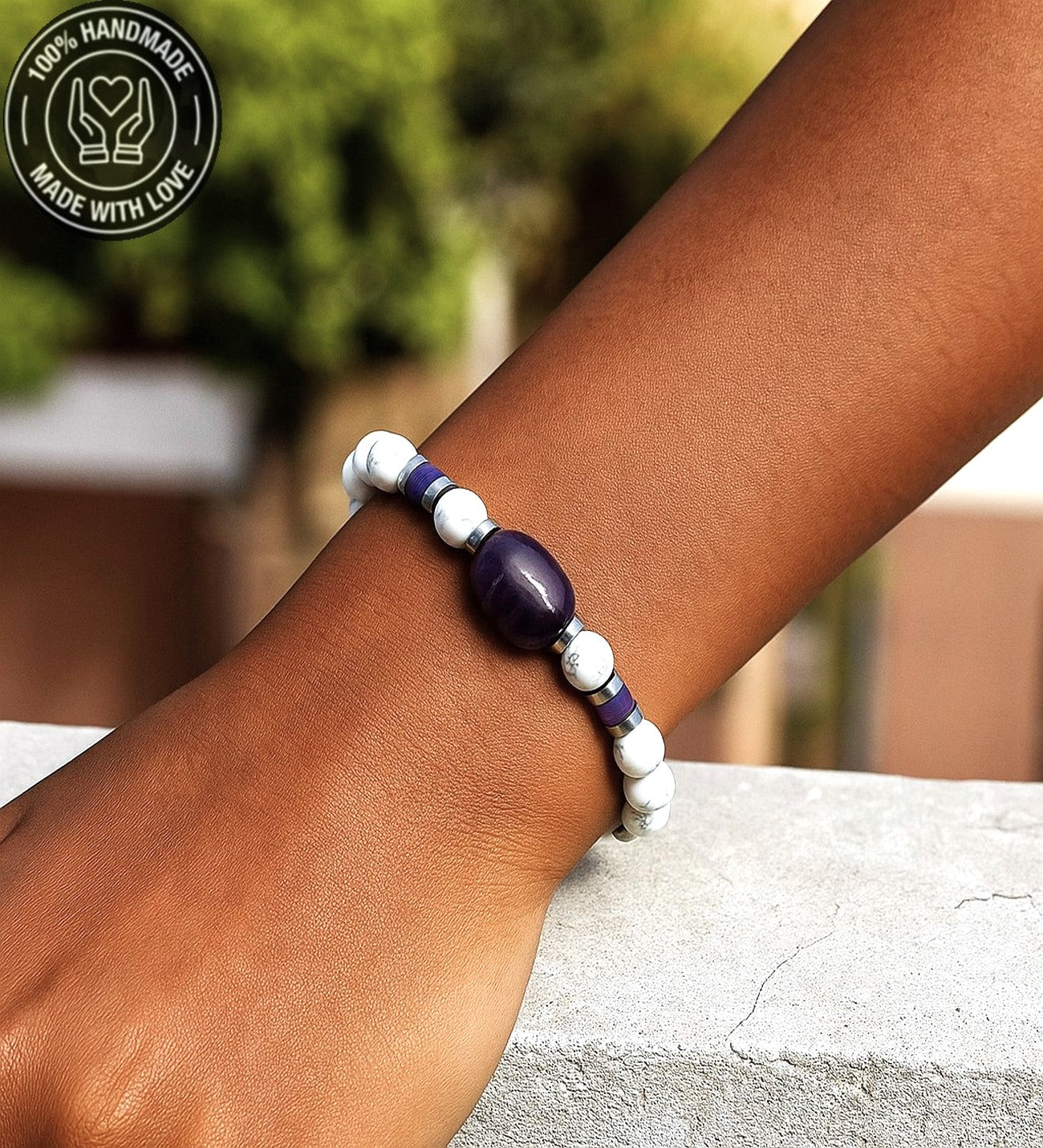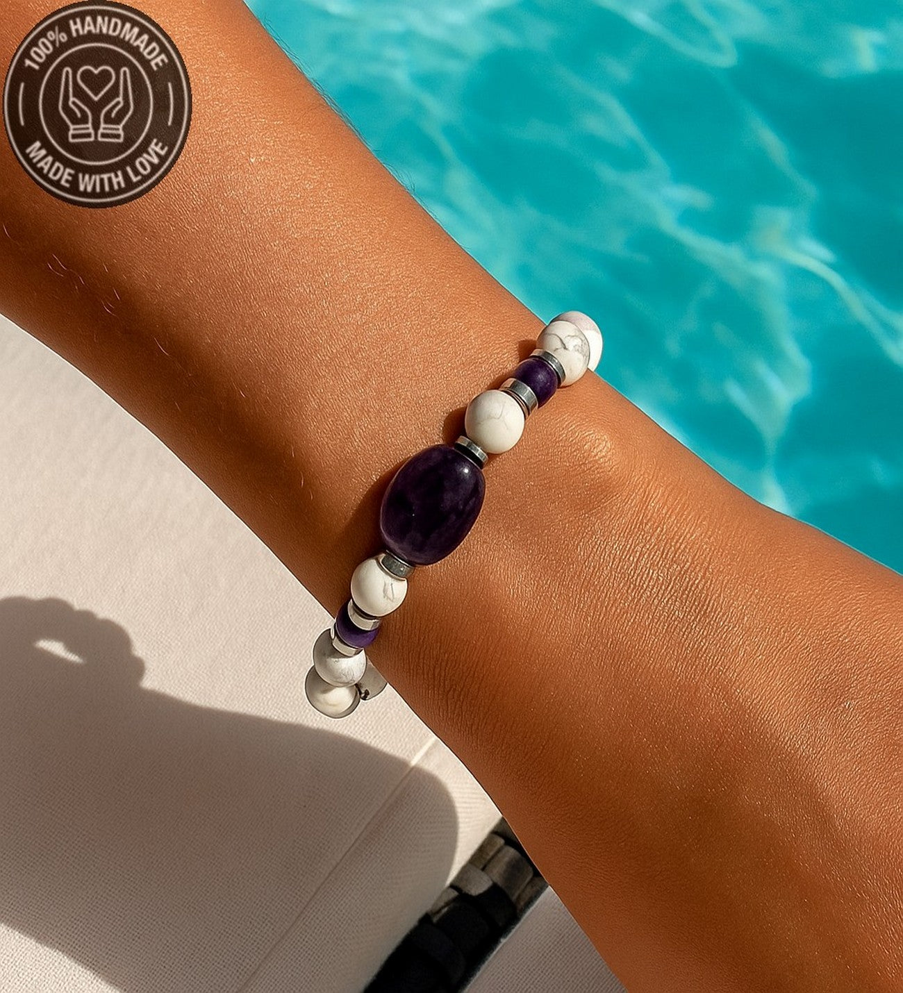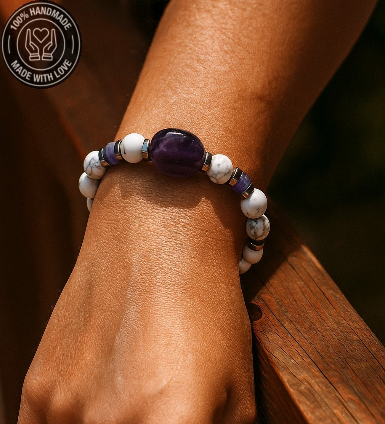 19-20 cm uzunluğundaki bu özel bileklik, ametist, havlit ve hematit taşlarının eşsiz uyumuyla tasarlandı. Eğer farklı bir ölçüde sipariş vermek istiyorsanız lütfen bunu not kısmında belirterek bize bildiriniz.