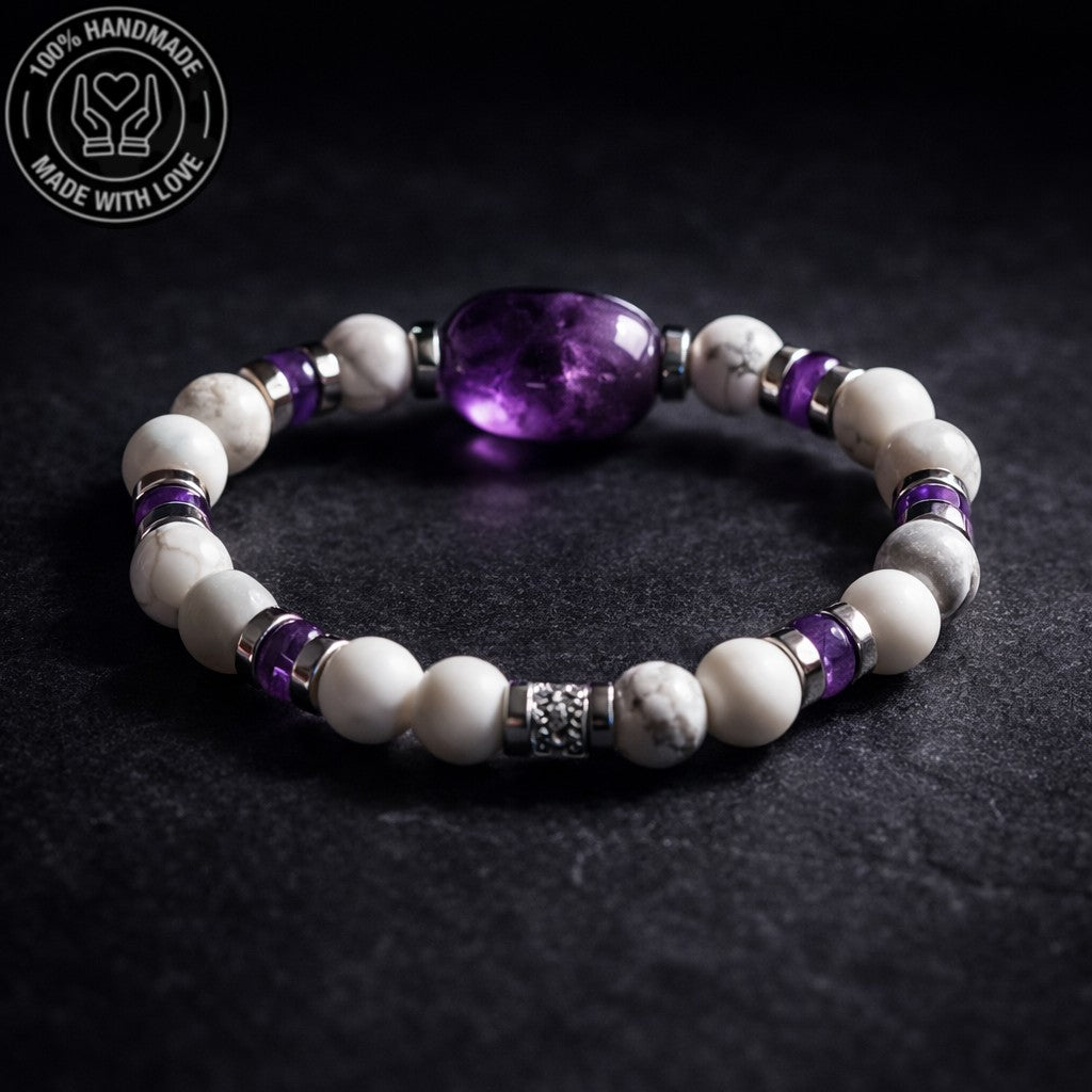 Bu bileklik, ametist, havlit ve hematit taşlarının enerjisiyle huzuru, dengeyi ve gücü destekler. Taşların enerjisiyle hem burçlarınızla uyumu yakalayın, hem de günlük yaşamınızda denge ve huzura ulaşın.