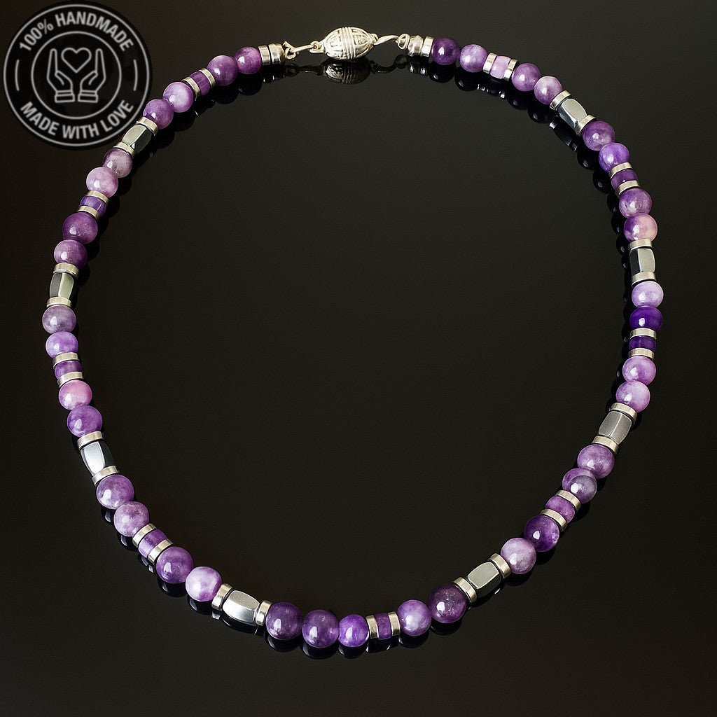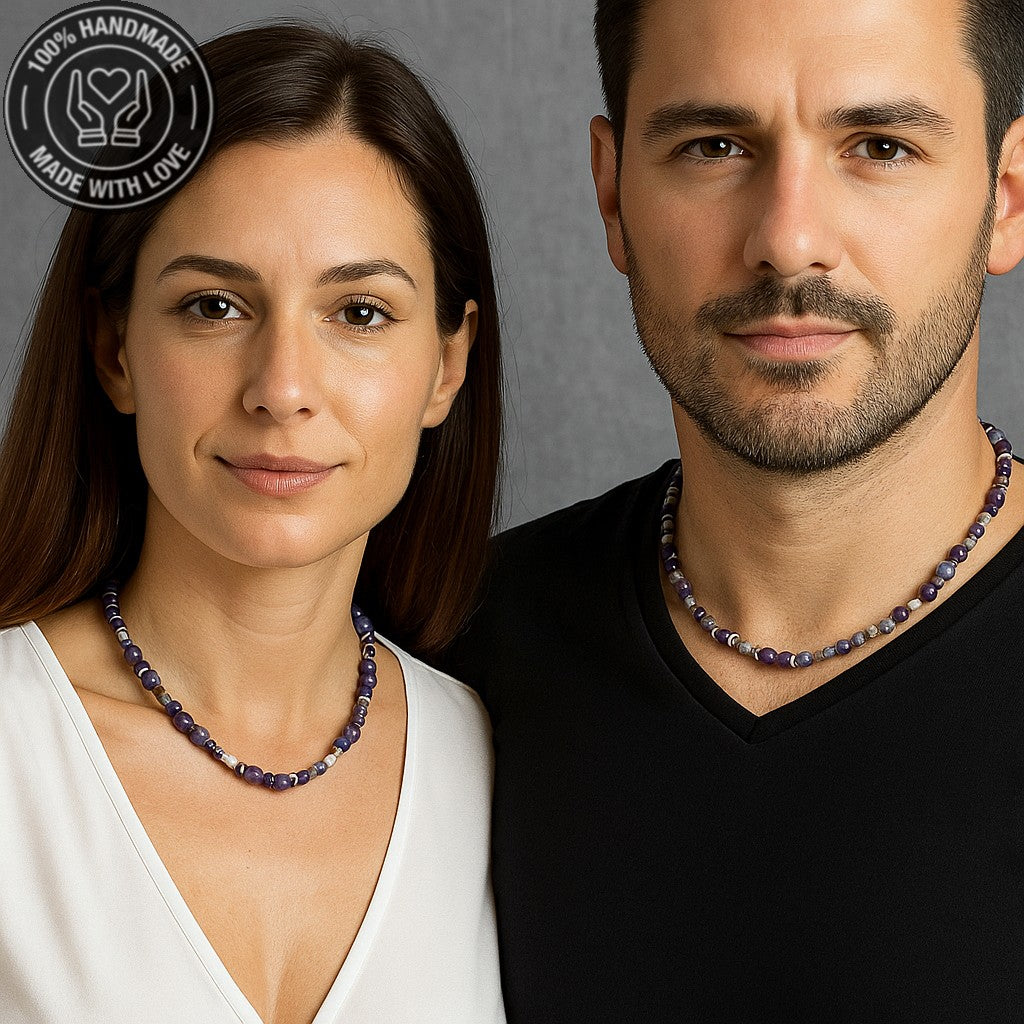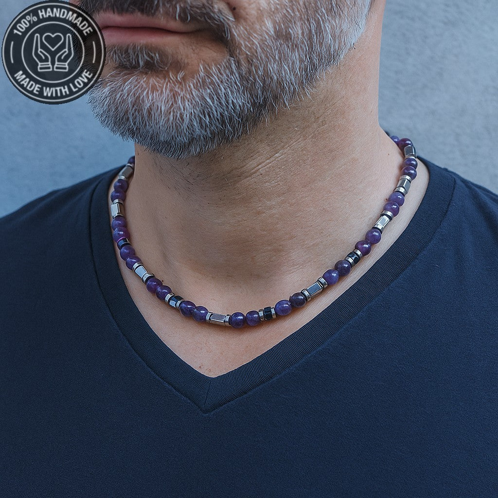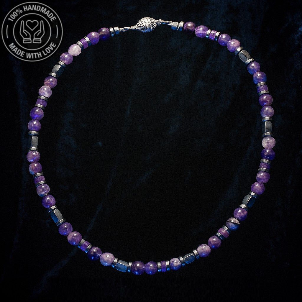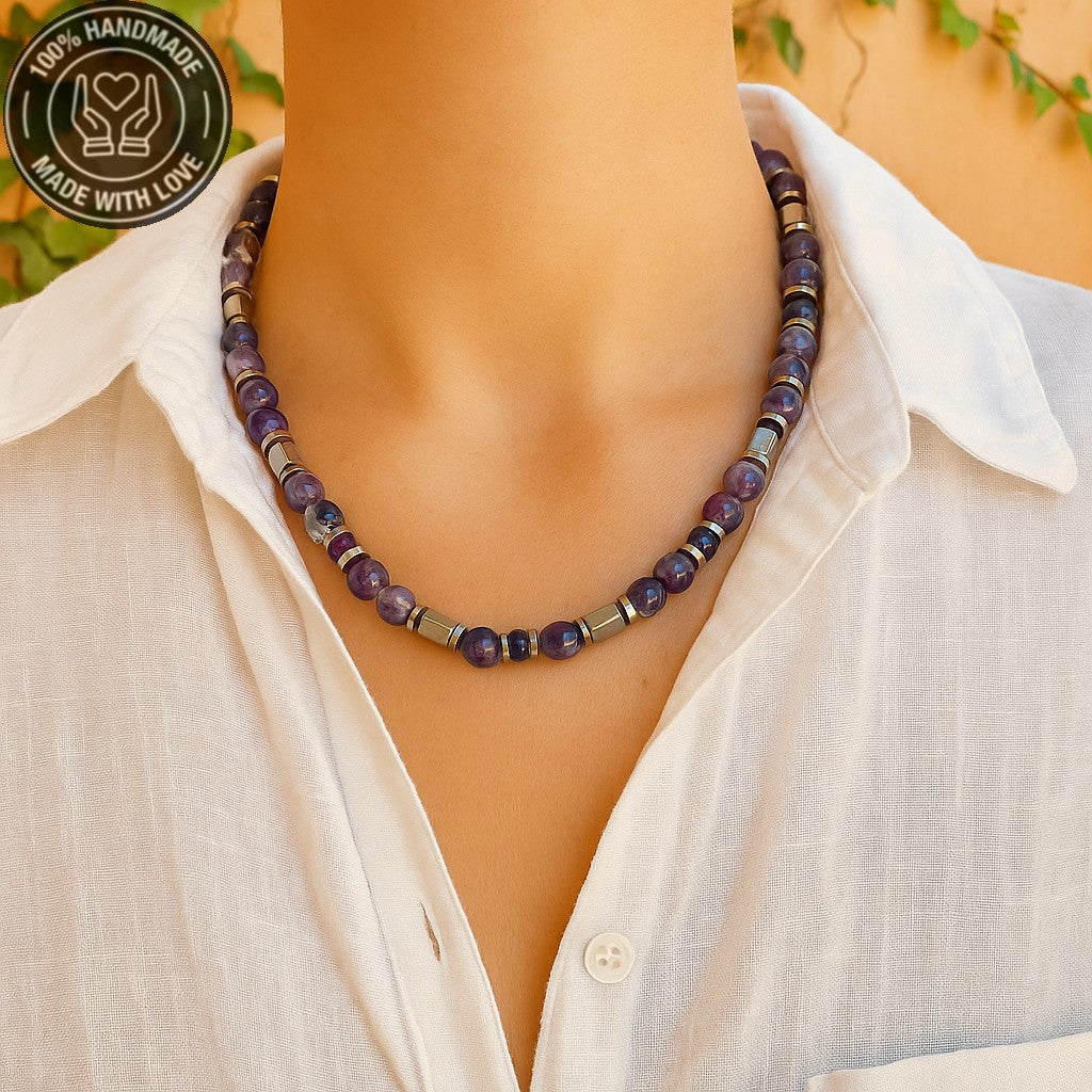 Doğal ametist ve hematit taşlarıyla el yapımı bu kolye, hem ruhsal dengeyi hem de fiziksel gücü destekleyen şık bir aksesuardır.