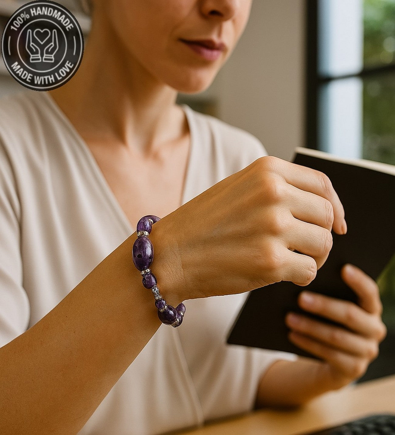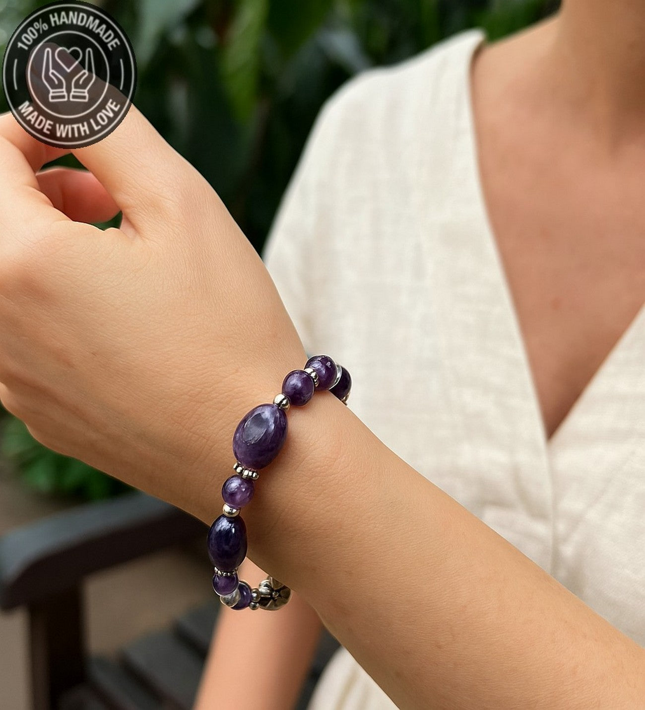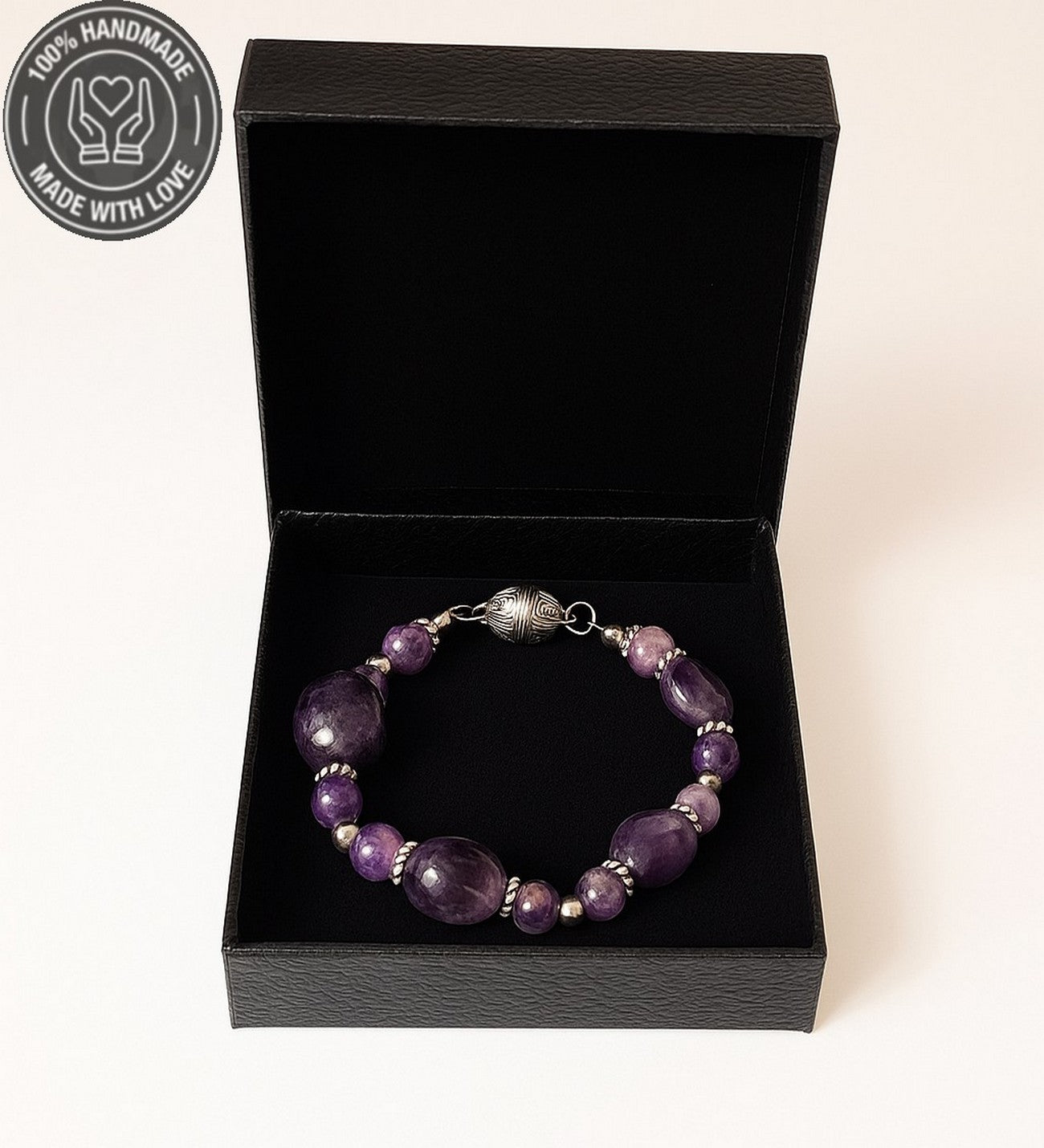 19-20 cm uzunluğundaki bu özel bileklik, ametist taşının eşsiz güzelliğiyle tasarlandı. Ruhsal denge, huzur ve korumayı bir araya getiren bu bileklik, hem günlük yaşamınızda hem de özel anlarınızda size eşlik edecek. Eğer farklı bir ölçüde sipariş vermek istiyorsanız lütfen bunu not kısmında belirterek bize bildiriniz."