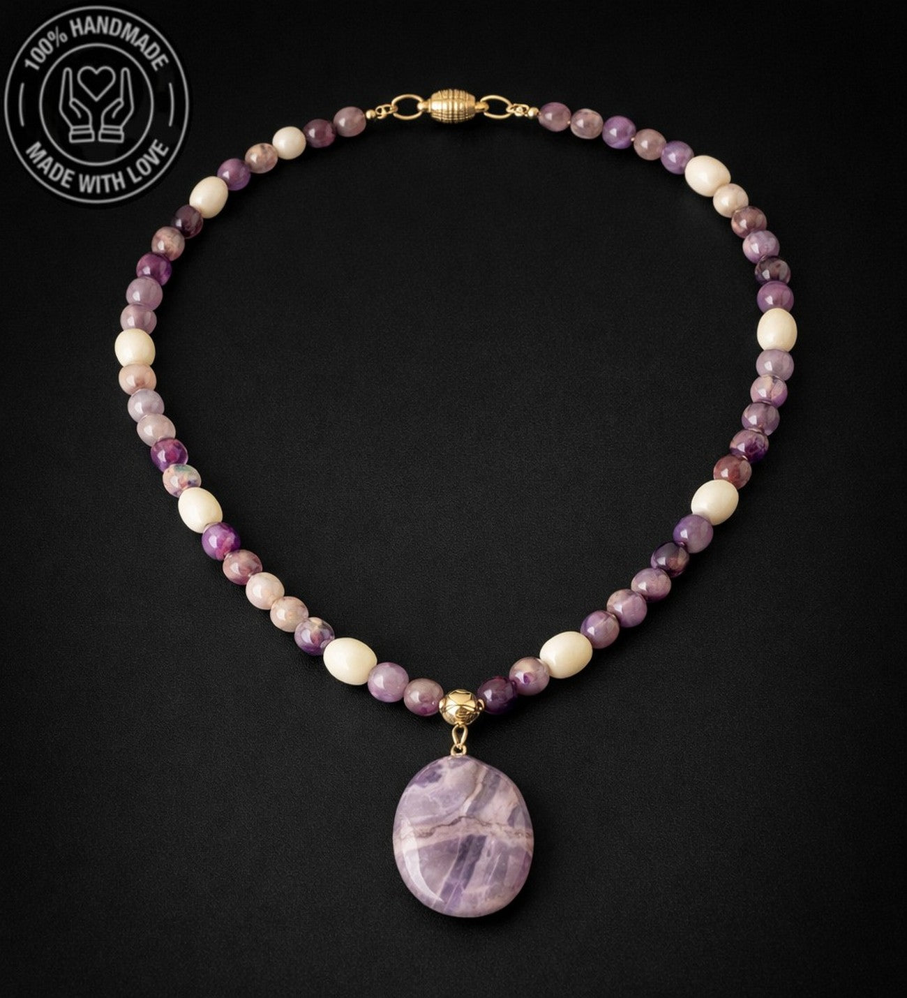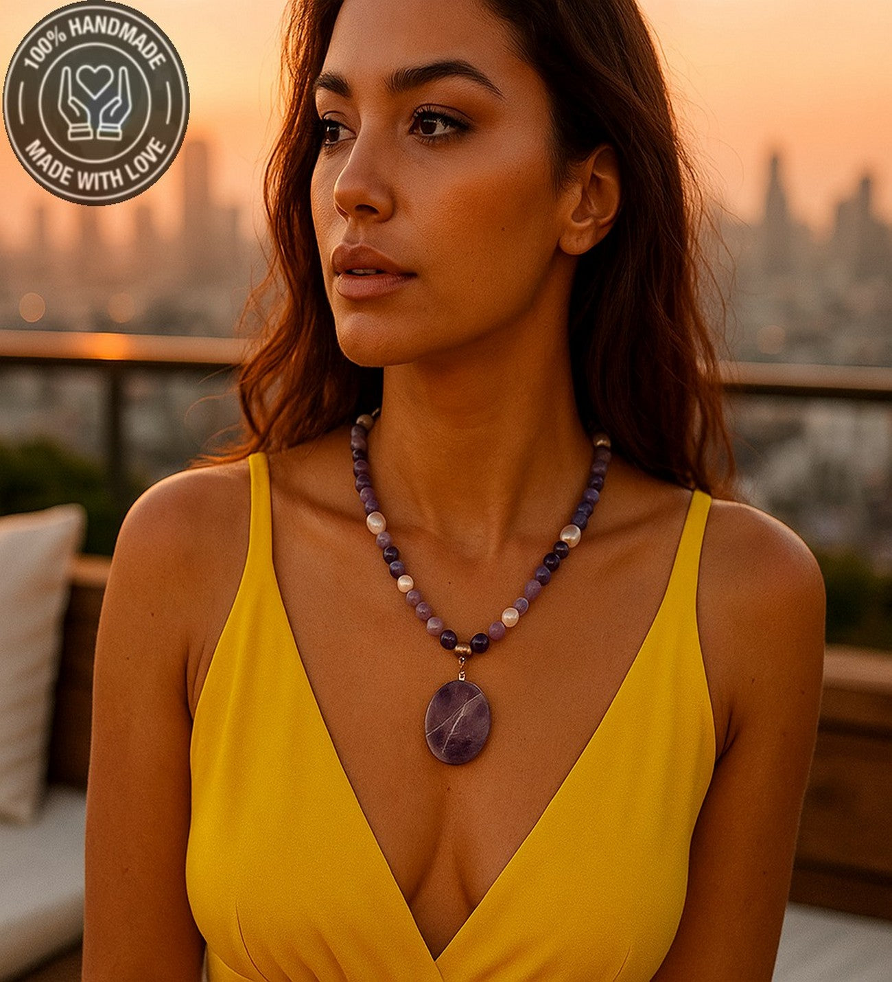 Özenle seçilmiş Ametist ve İnci taşlarıyla hazırlanan bu özel Elit seri kolye, el emeğiyle hayat buldu. Ruhunuza denge katacak bu zarif tasarım, size özel bir enerji sunuyor.