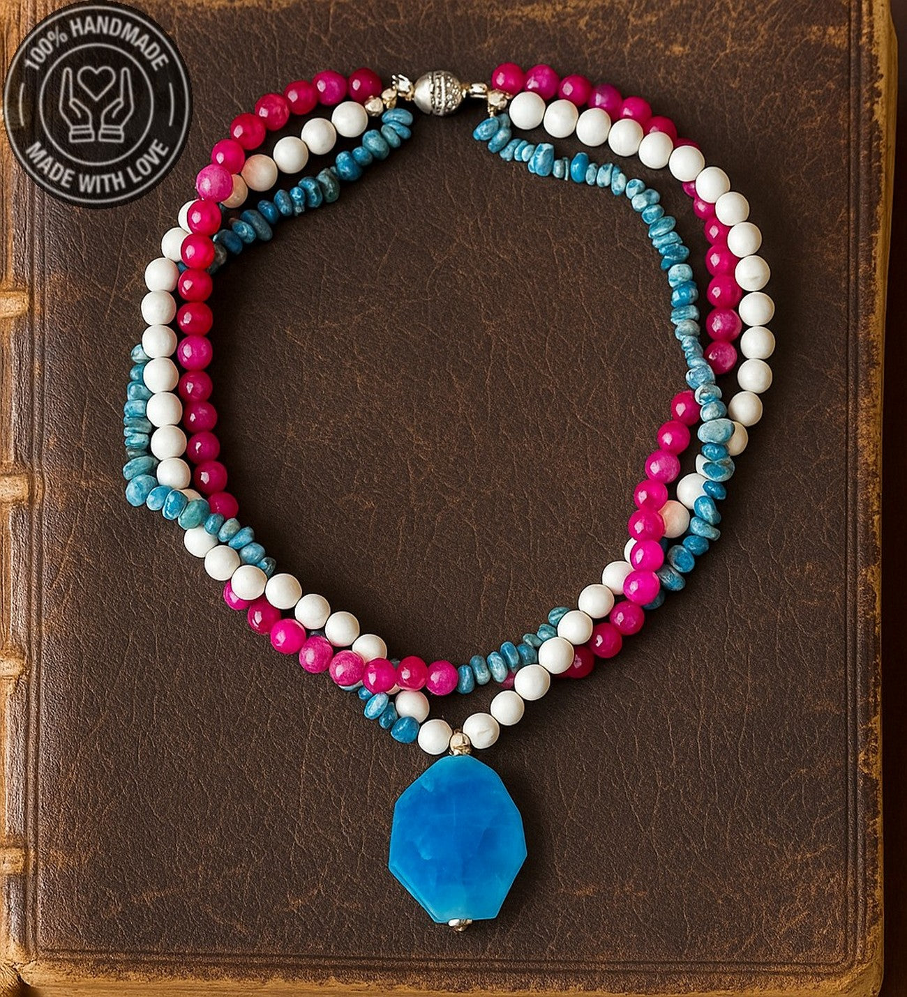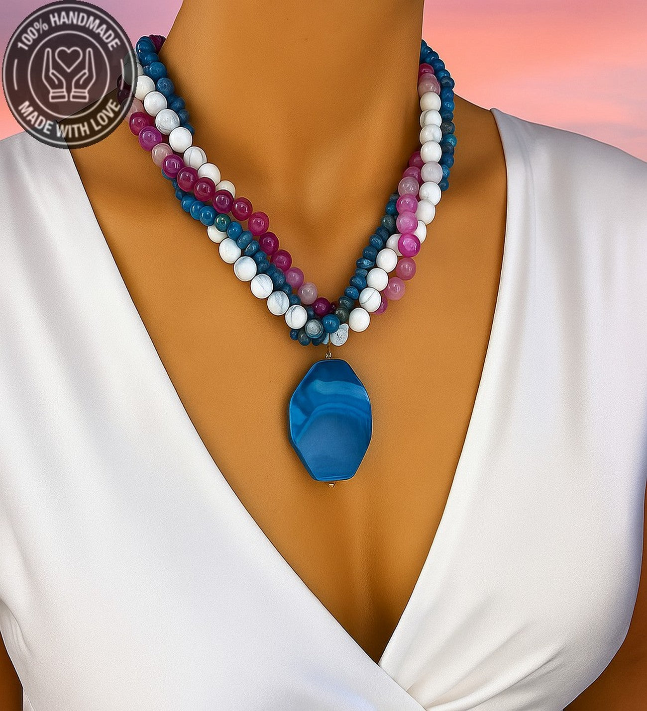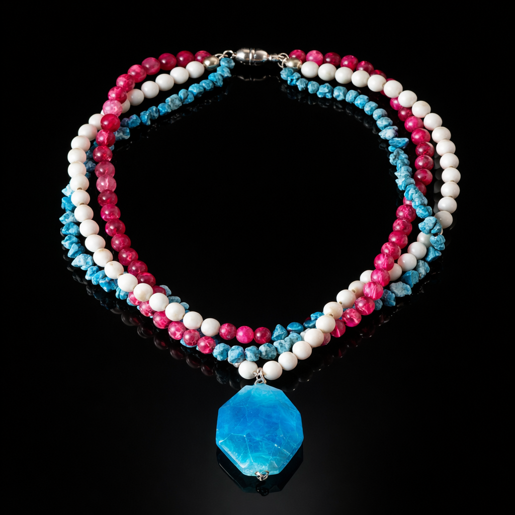 Doğal taşların huzur veren, iletişimi güçlendirici ve zihinsel berraklık sağlayıcı etkilerini üç sıralı şıklıkla boynunuzda taşıyın.