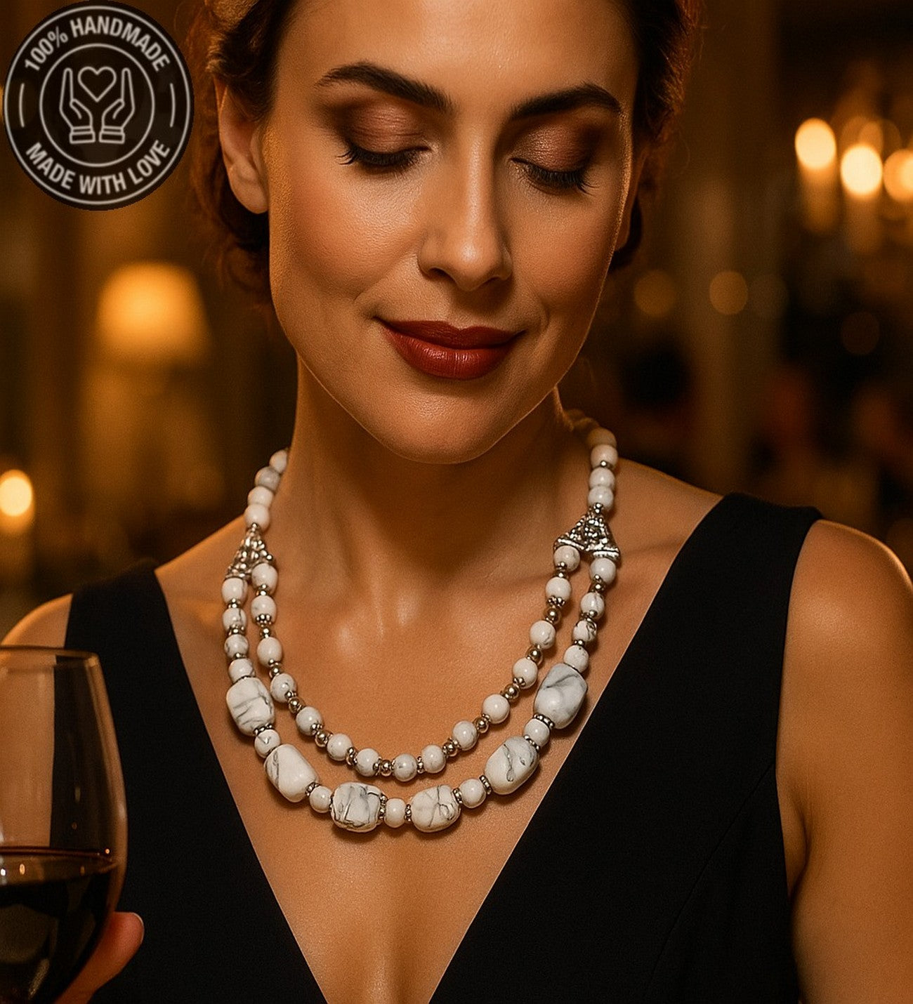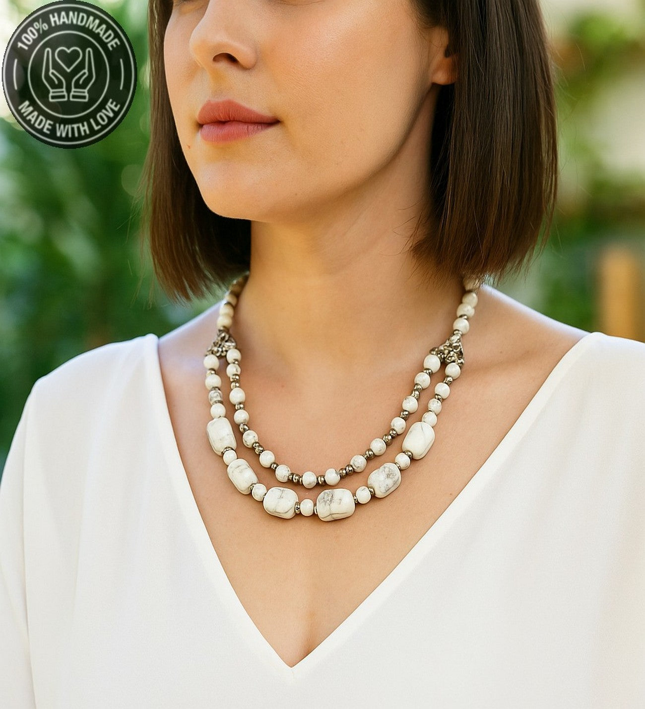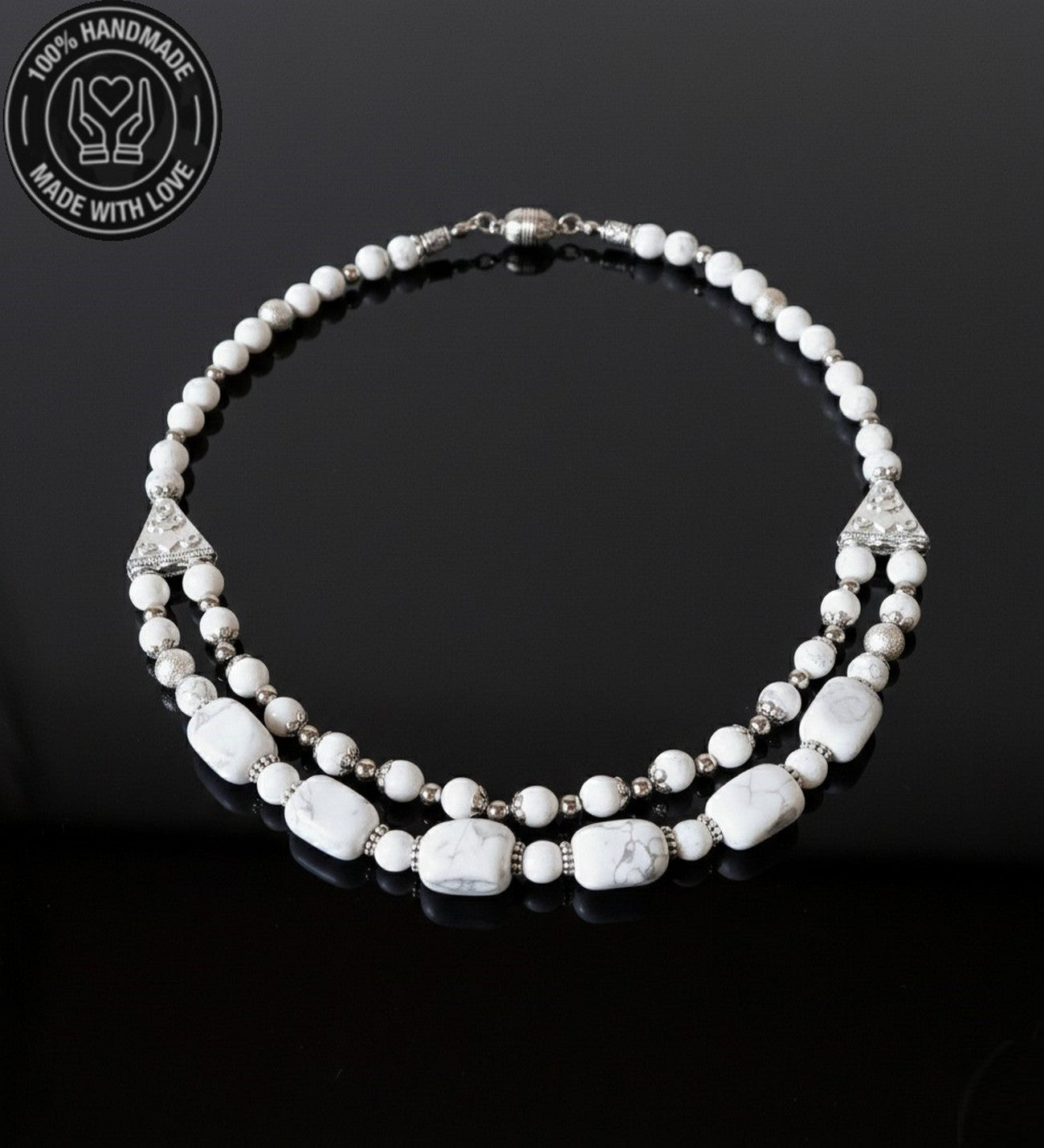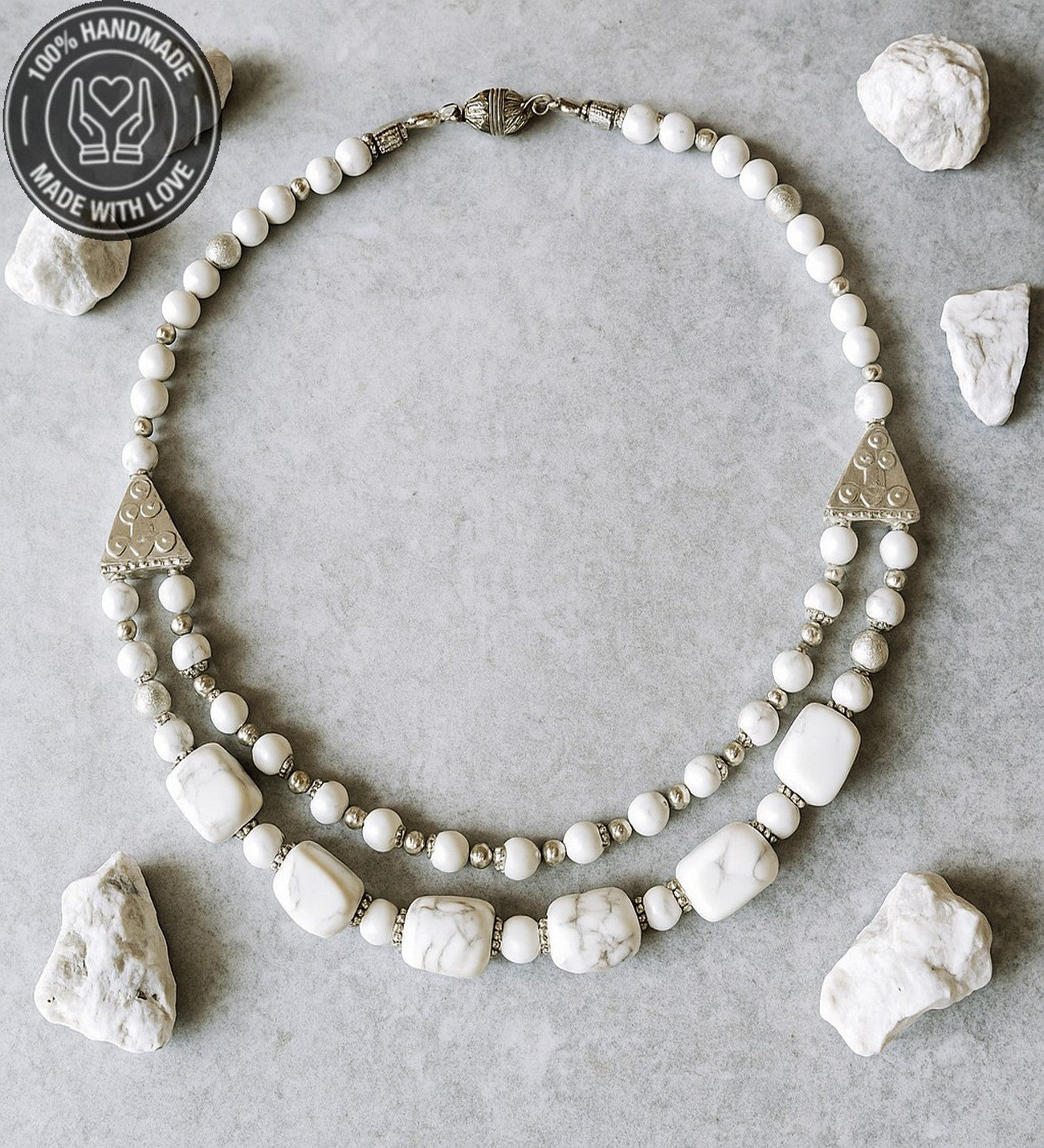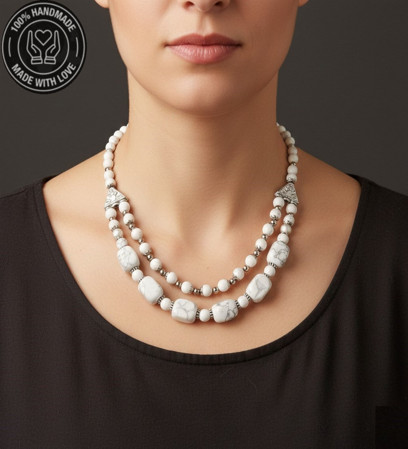 Özenle seçilmiş Havlit taşlarından hazırlanan bu özel iki sıralı kolye, el emeğiyle hayat buldu. Ruhunuza denge katacak bu zarif tasarım, size özel bir enerji sunuyor.