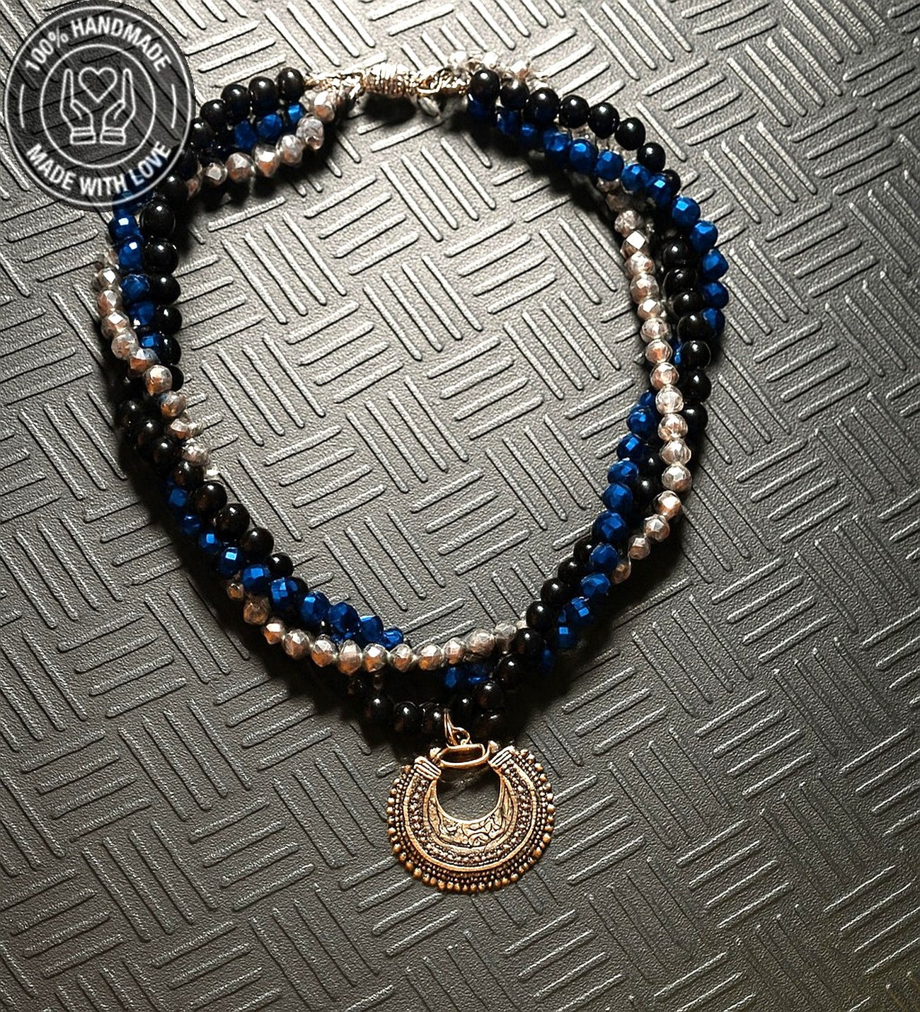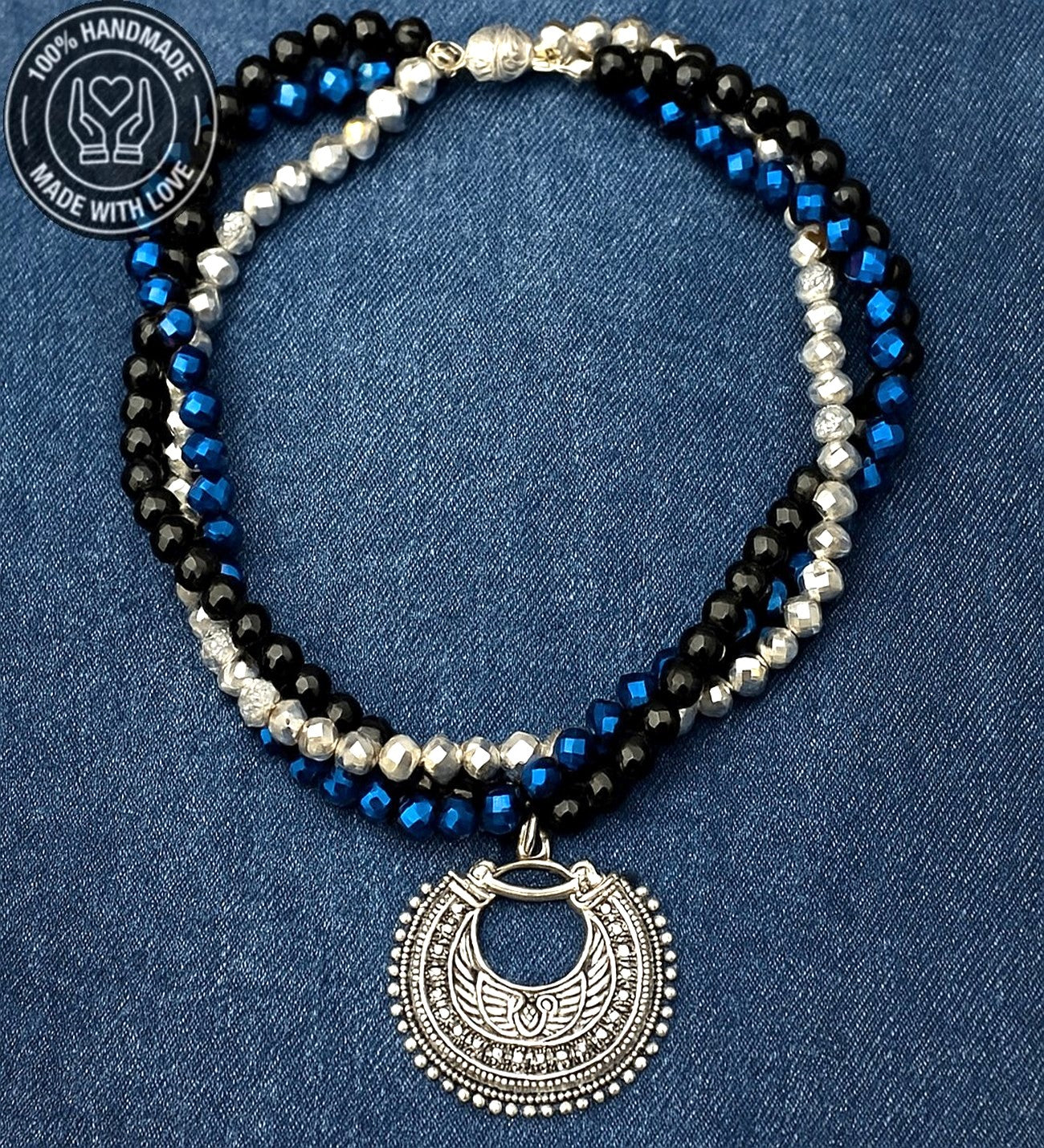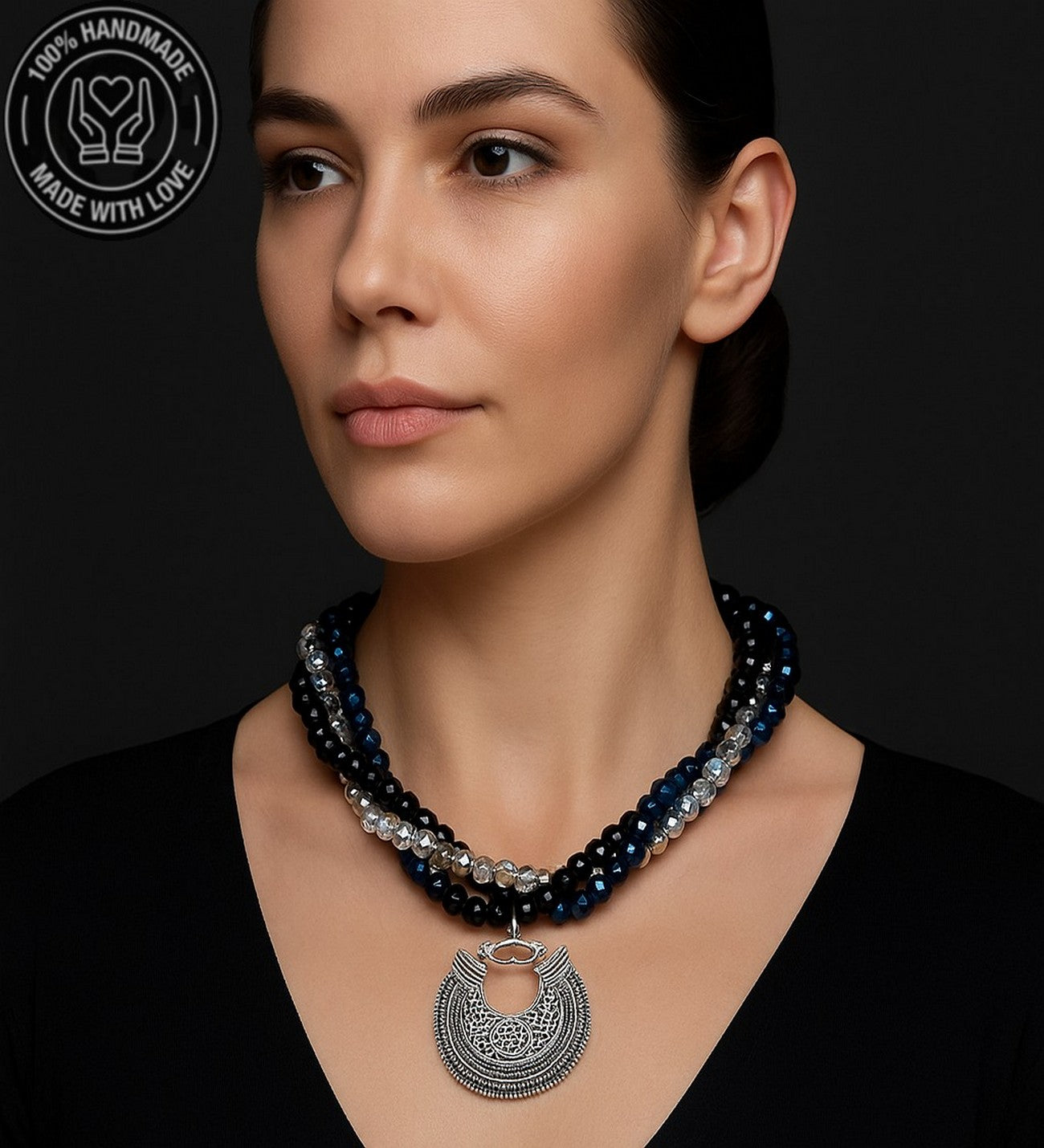 Özenle seçilmiş Hematit, Oniks ve Kristal taşlarıyla hazırlanan bu özel 3 sıralı kolye, el emeğiyle hayat buldu. Ruhunuza denge katacak bu zarif tasarım, size özel bir enerji sunuyor.