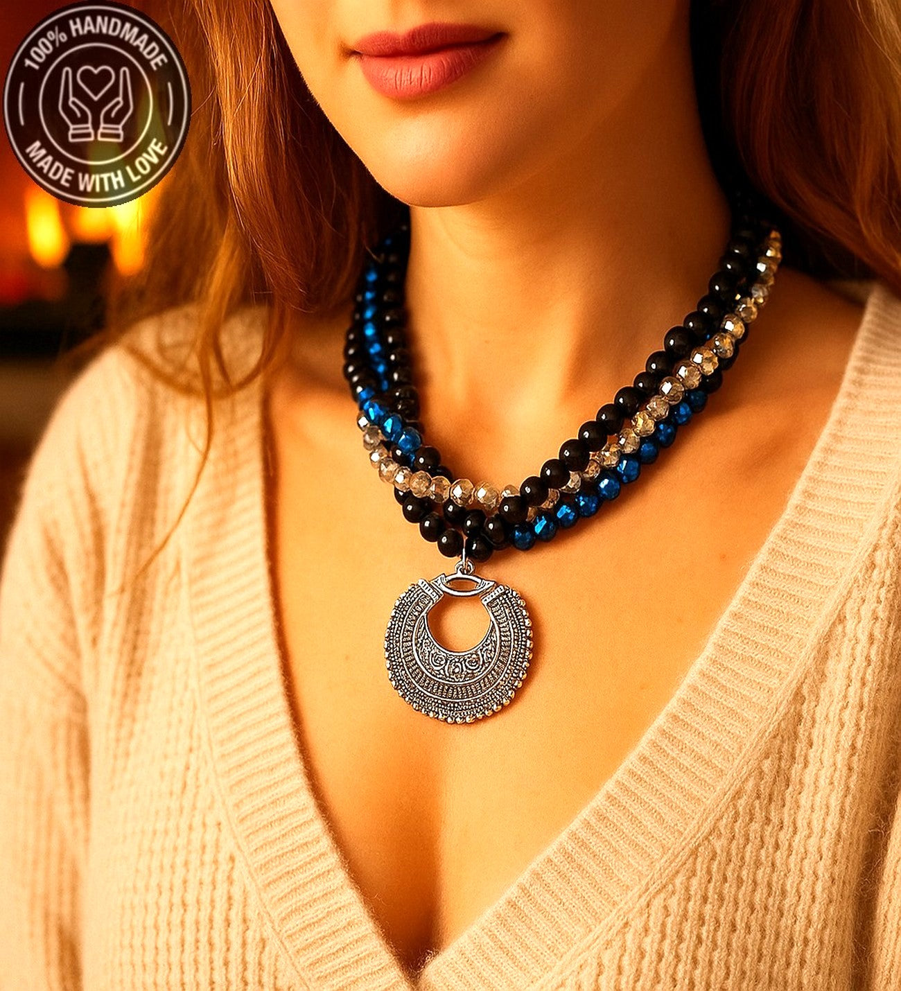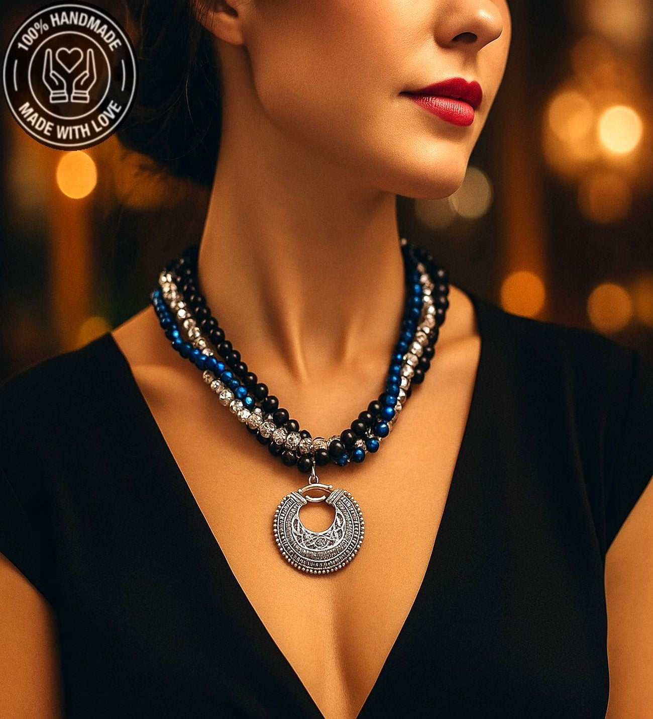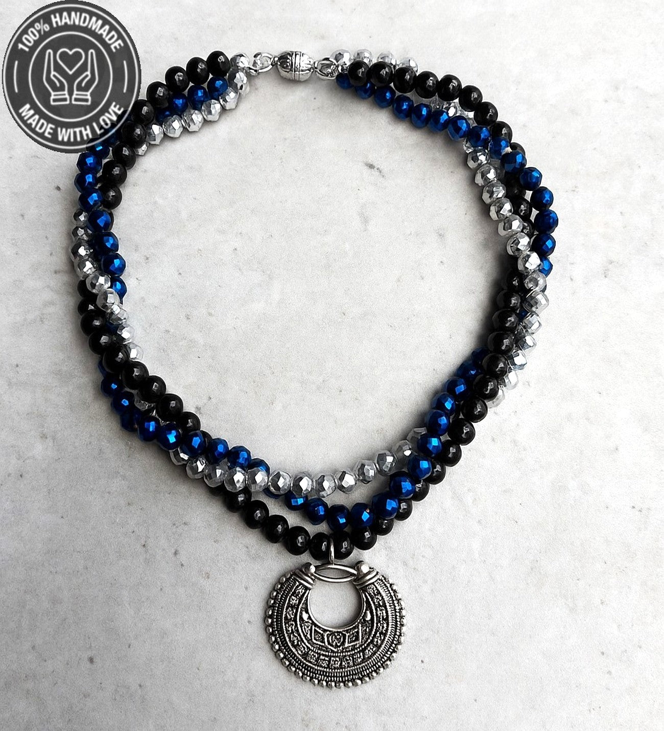 Özenle seçilmiş Hematit, Oniks ve Kristal taşlarıyla hazırlanan bu özel 3 sıralı kolye, el emeğiyle hayat buldu. Ruhunuza denge katacak bu zarif tasarım, size özel bir enerji sunuyor.