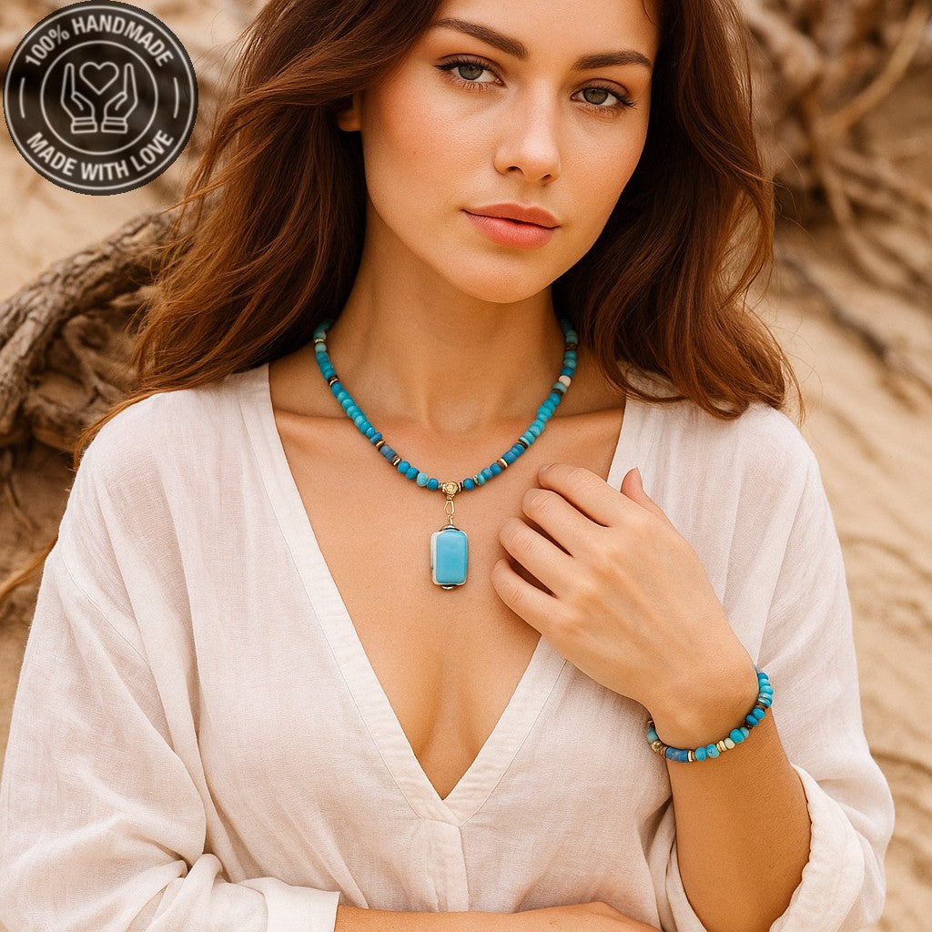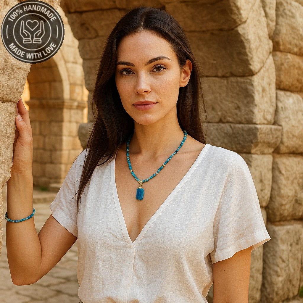 Doğanın huzur verici enerjisini şıklıkla buluşturan bu takı seti, kolye ve bileklikten oluşuyor.