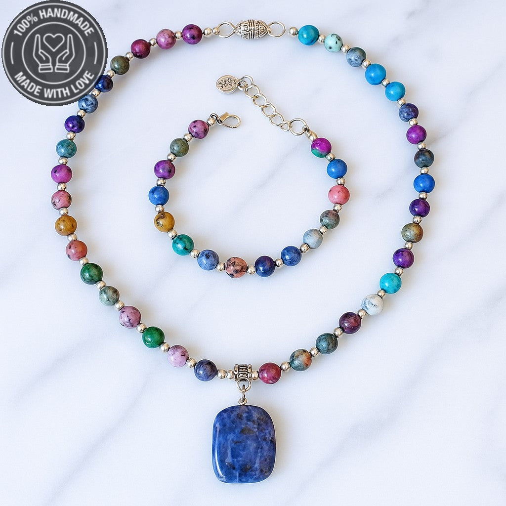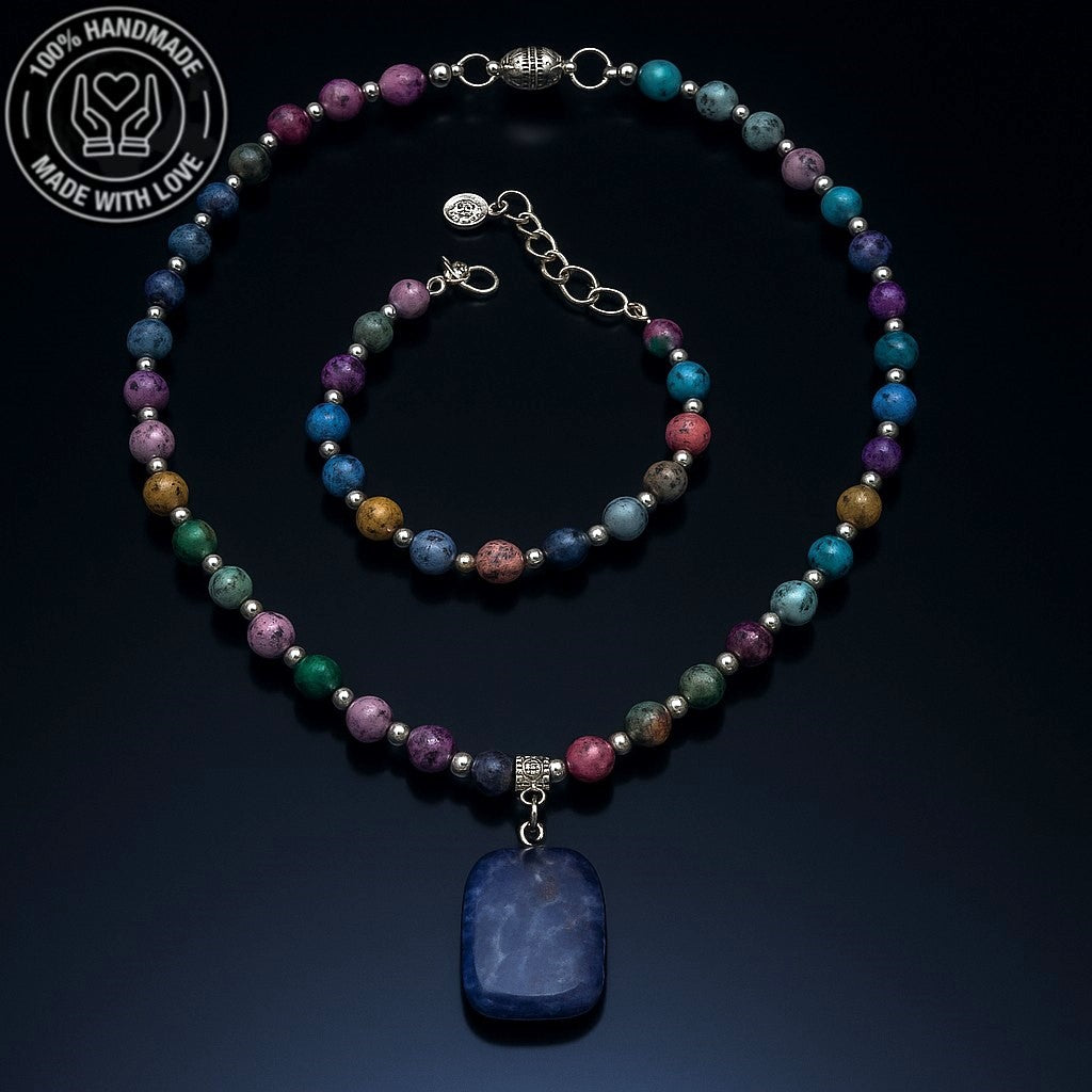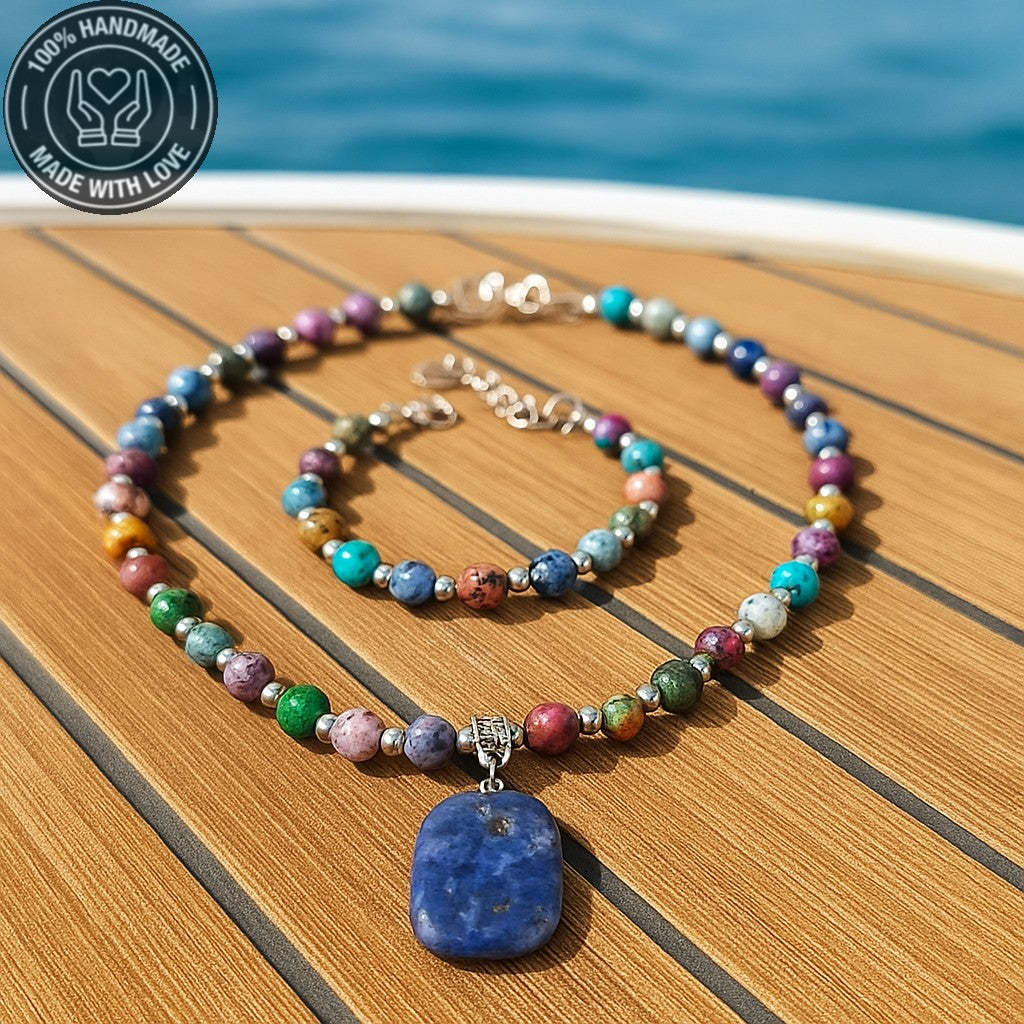 Doğal çok renkli jasper taşlarıyla el yapımı bu set, enerjisi ve canlı görünümüyle size eşlik eder.