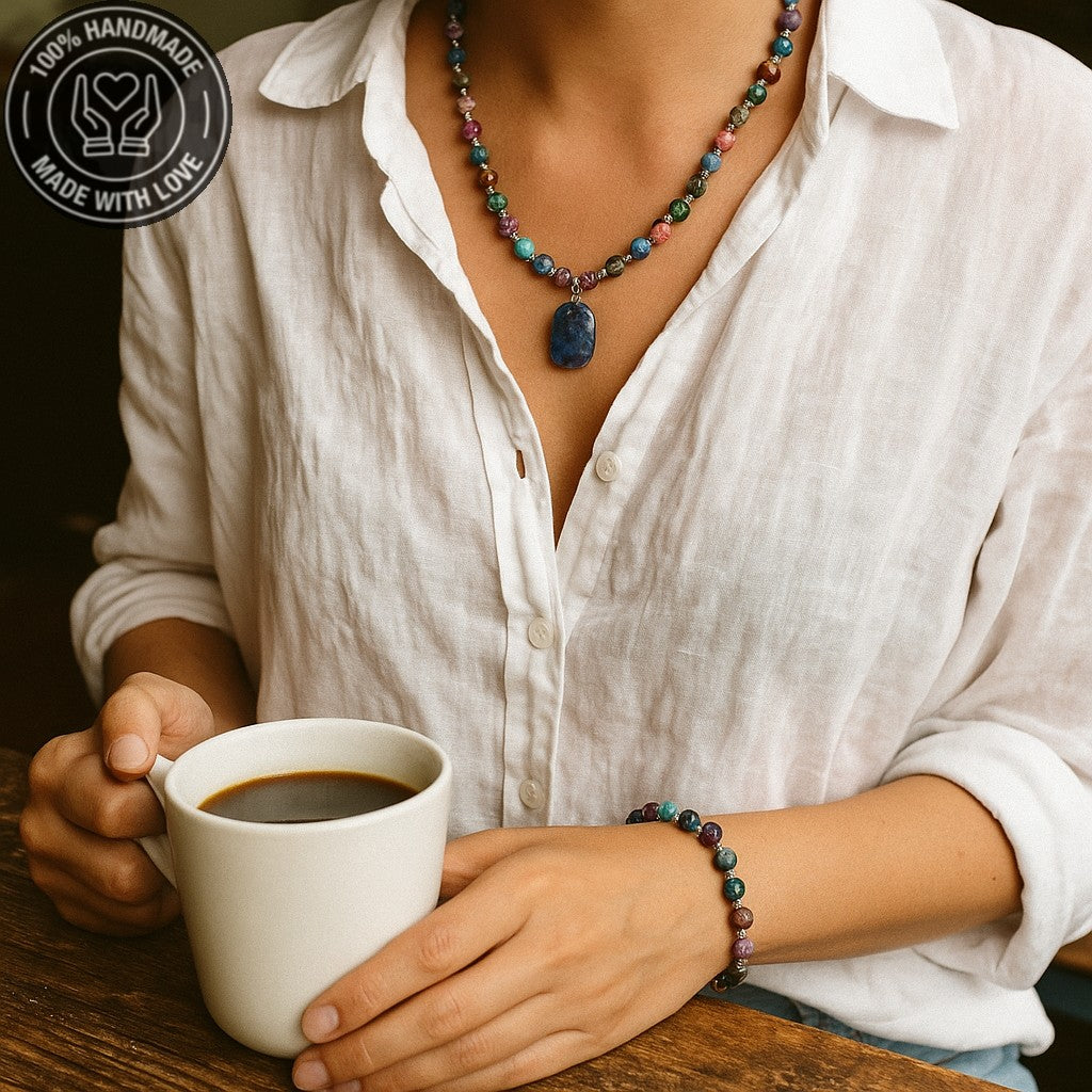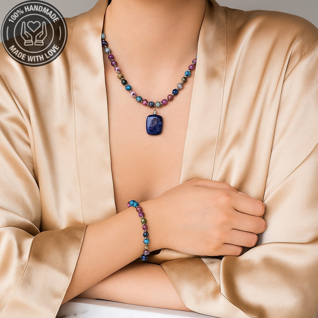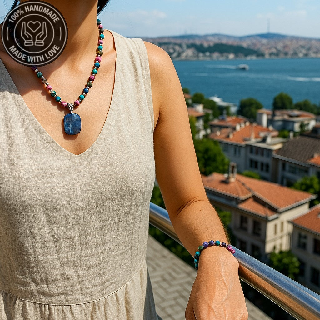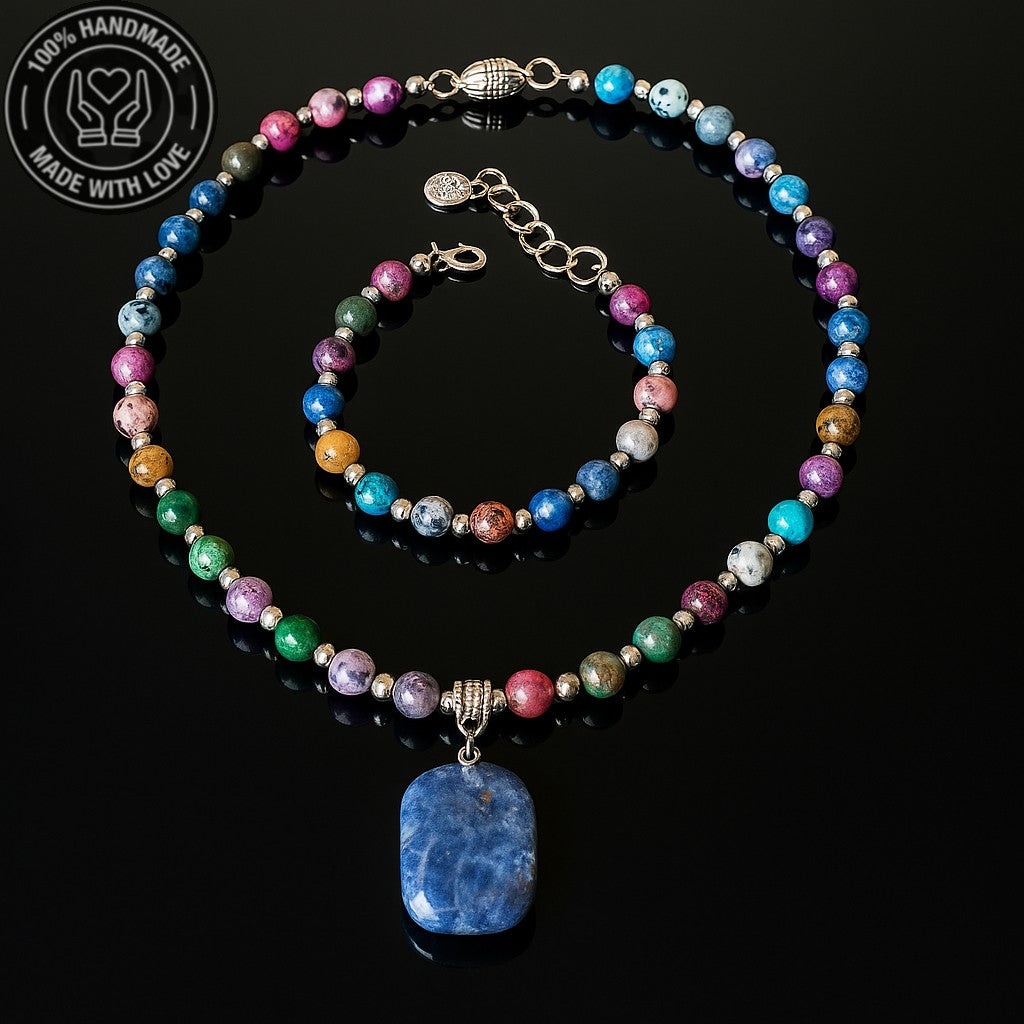 Doğal çok renkli jasper taşlarıyla el yapımı bu set, enerjisi ve canlı görünümüyle size eşlik eder.