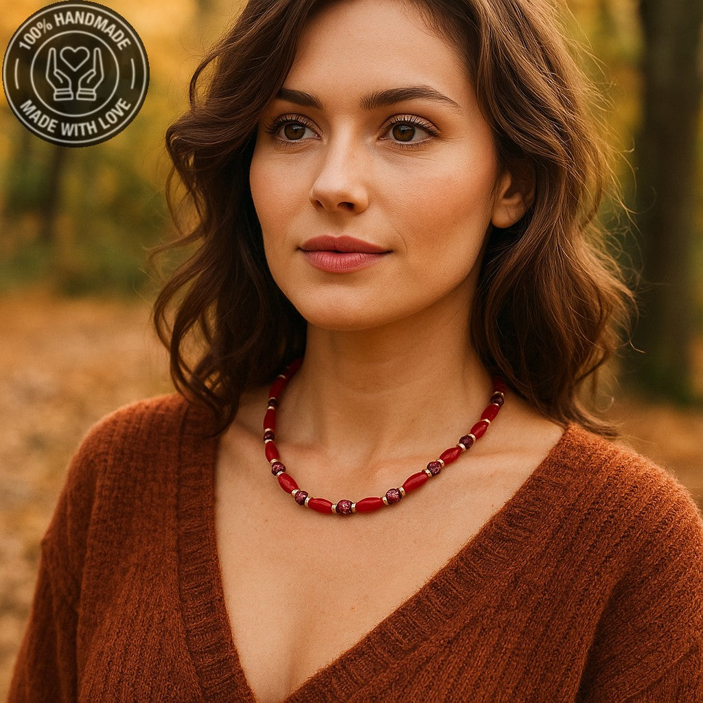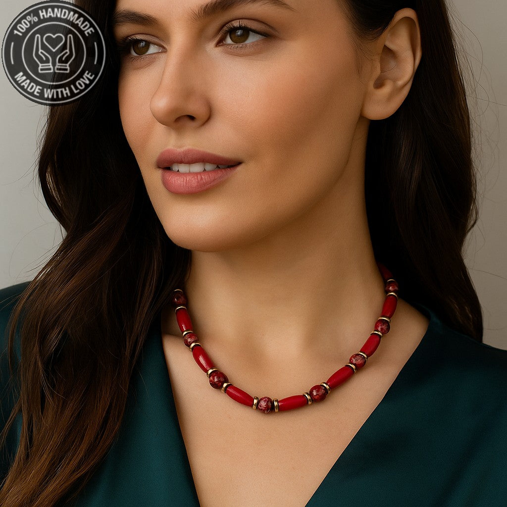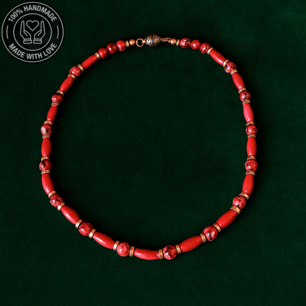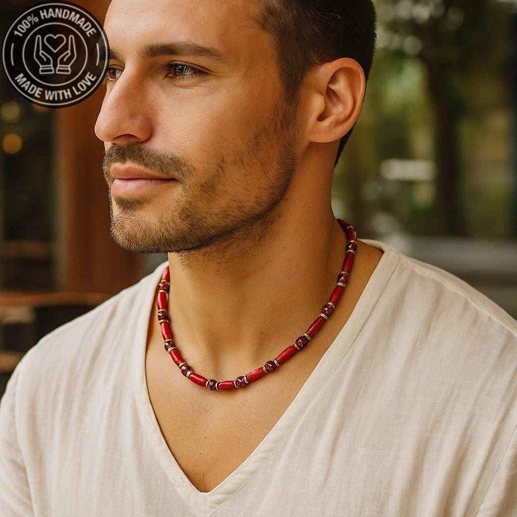 Güç, canlılık ve topraklamanın simgesi bu özel kolye, kırmızı jasper, hematit ve ahşabın eşsiz uyumuyla tasarlandı. Kendinize veya sevdiklerinize doğal ve anlamlı bir hediye arıyorsanız, bu kolye mükemmel bir seçim.