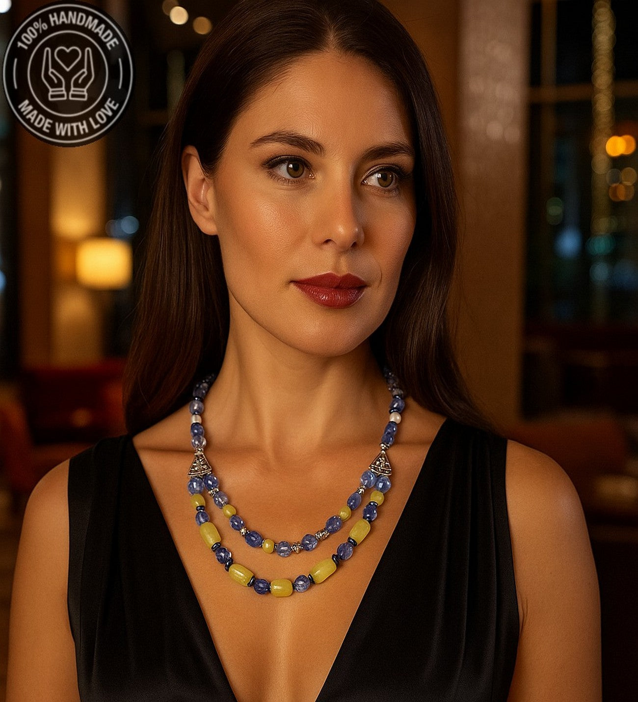 48-50 cm uzunluğundaki bu özel kolye, kuvars ve zebercet taşlarının eşsiz uyumuyla tasarlandı. Eğer farklı bir ölçüde sipariş vermek istiyorsanız lütfen bunu not kısmında belirterek bize bildiriniz.