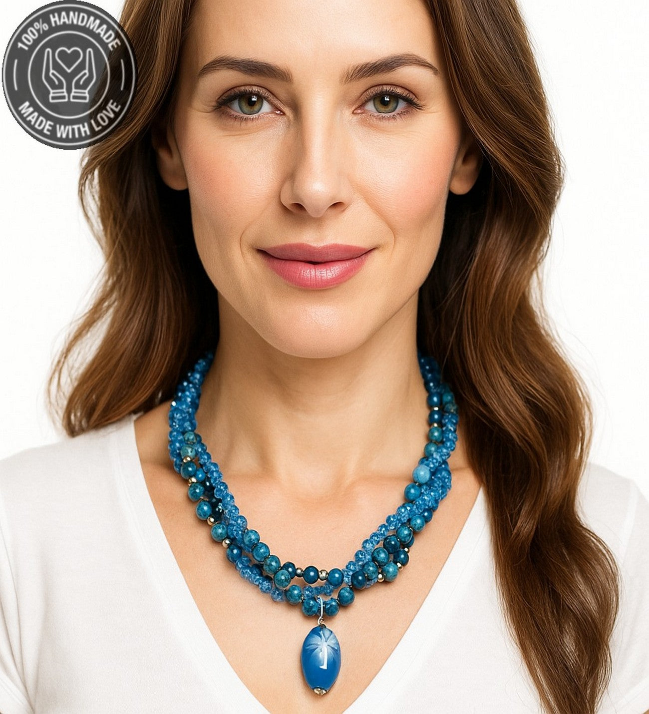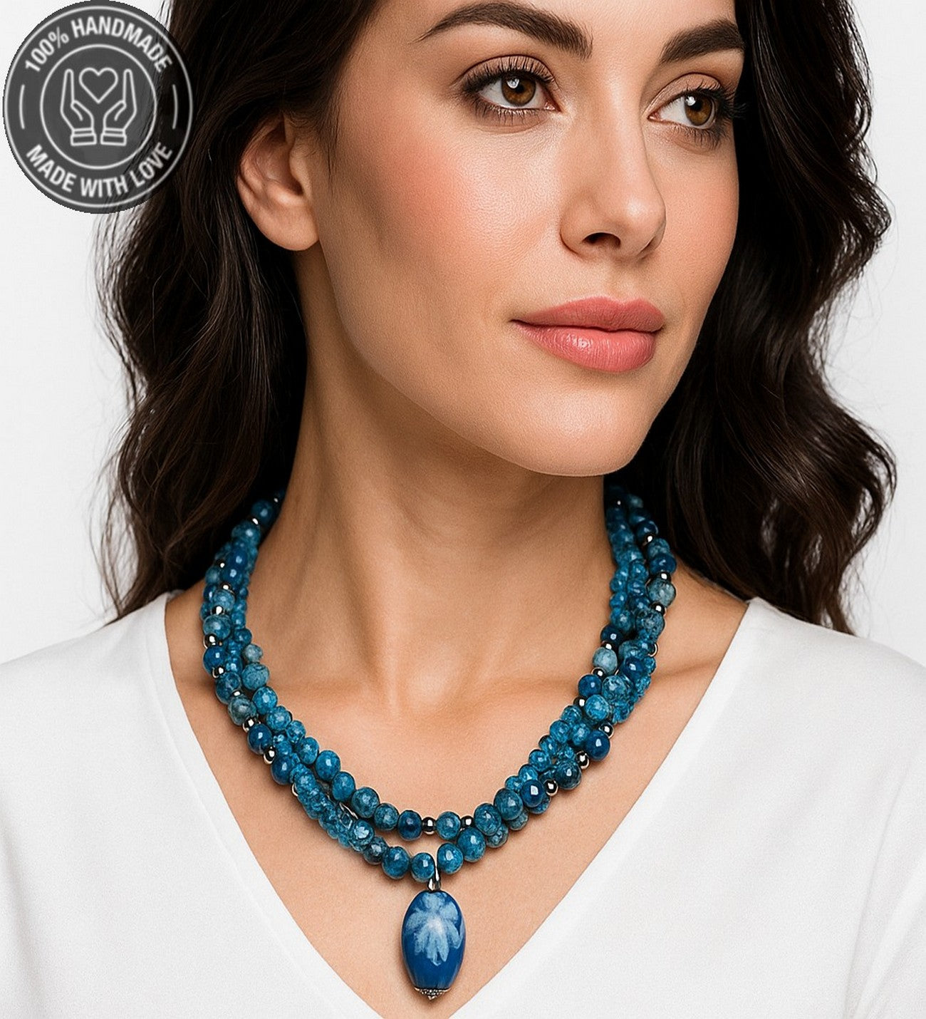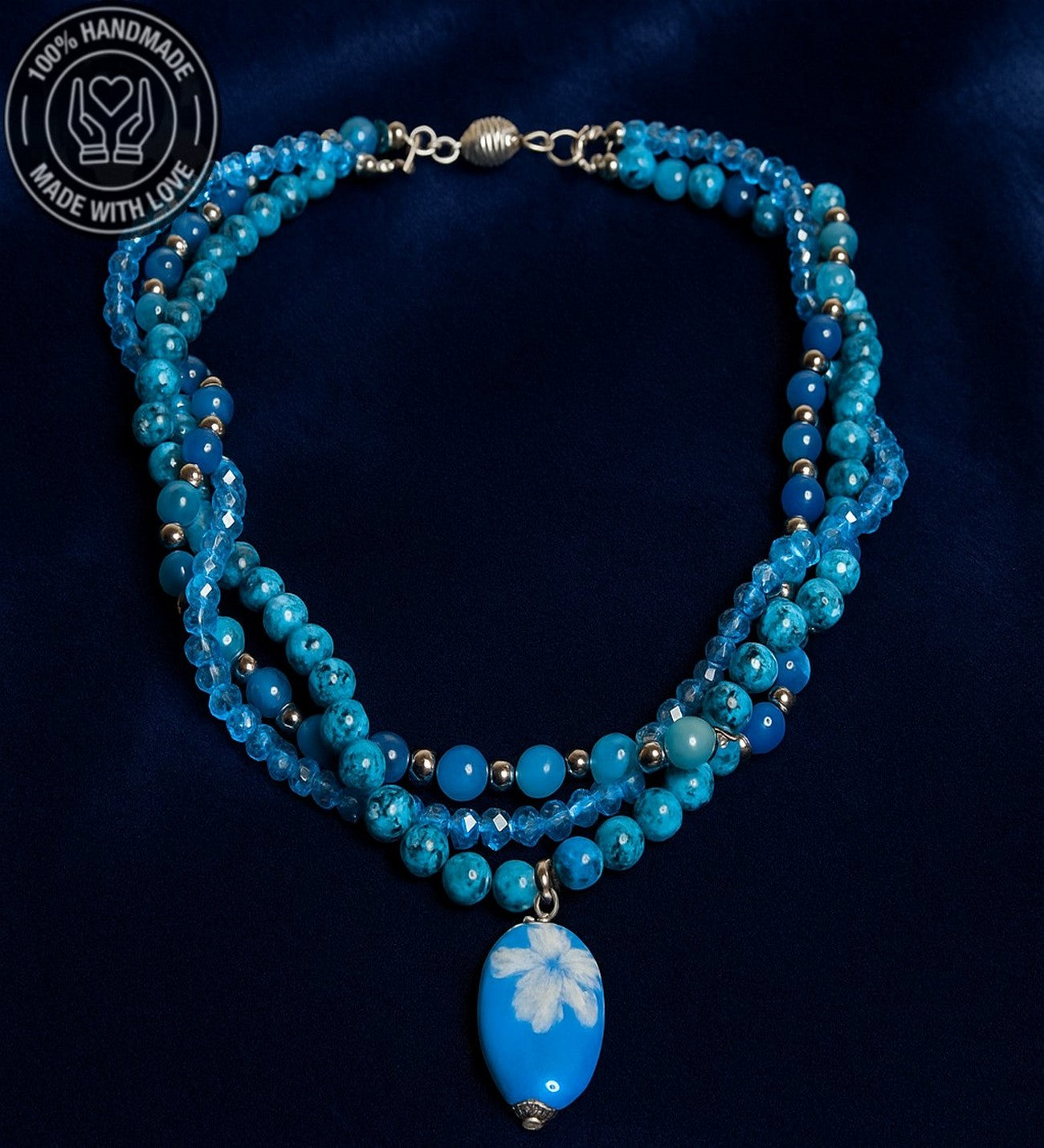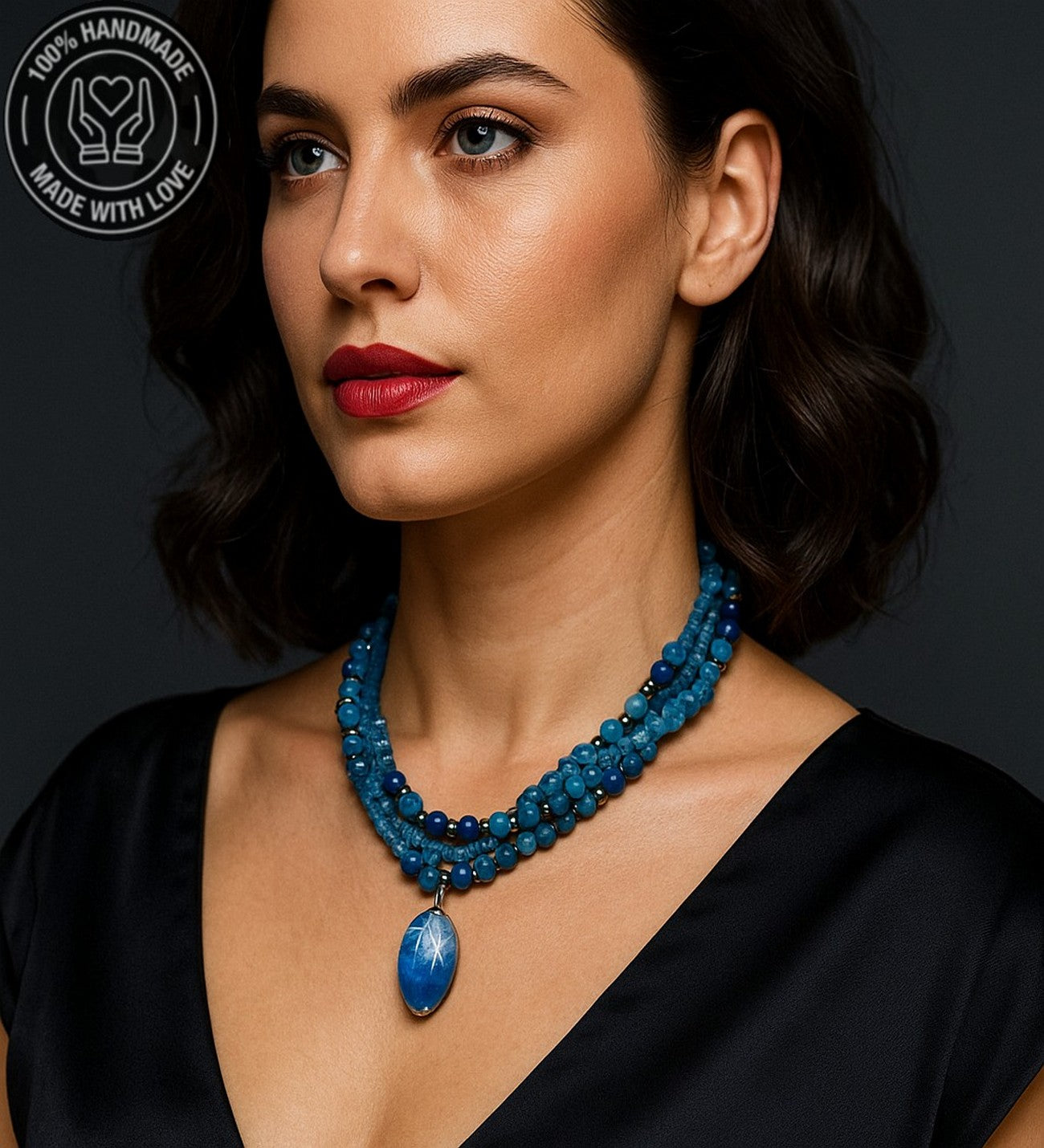 Mavi Akik Mavi Jasper Mavi Kristal Üç Sıralı Tutku, Nazardan Koruma Ve Enerji Kolyesi