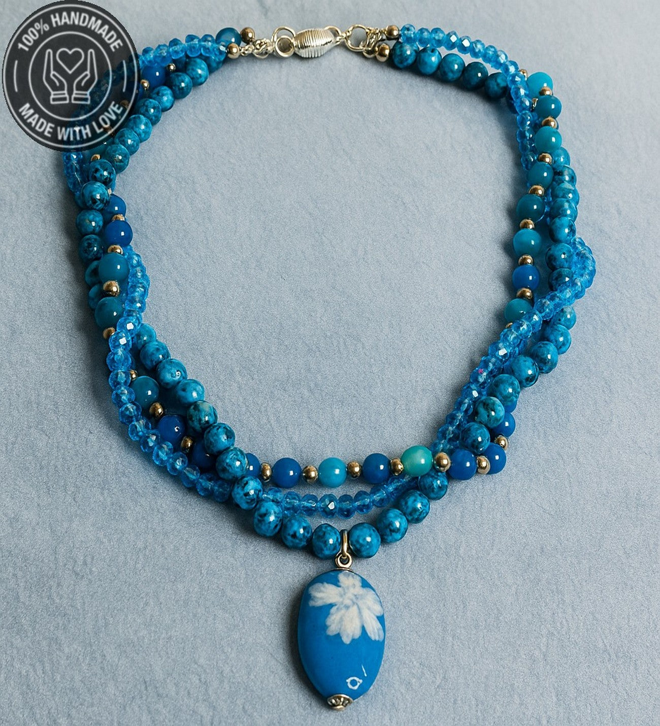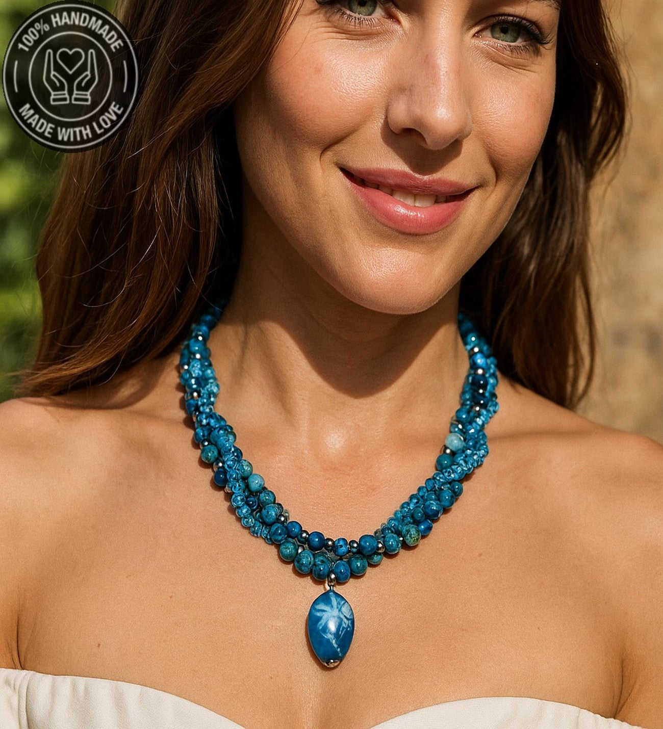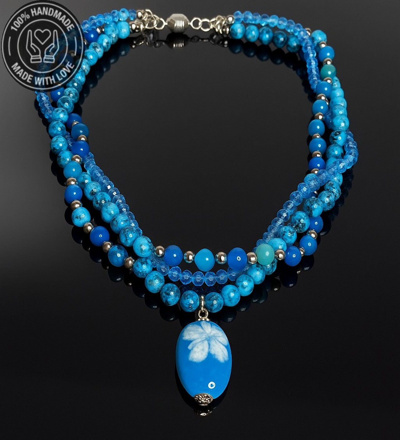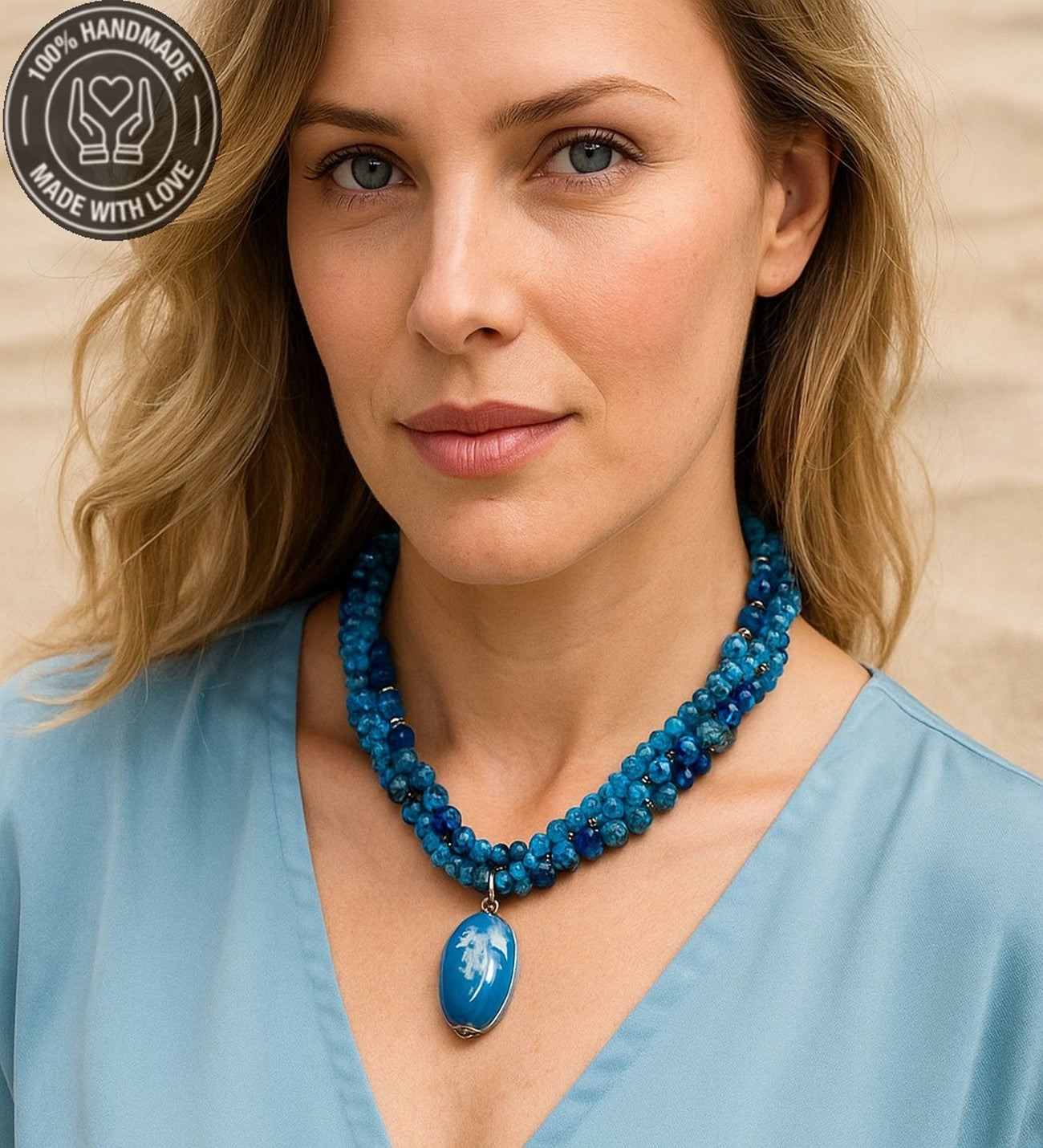Mavi Akik Mavi Jasper Mavi Kristal Üç Sıralı Tutku, Nazardan Koruma Ve Enerji Kolyesi