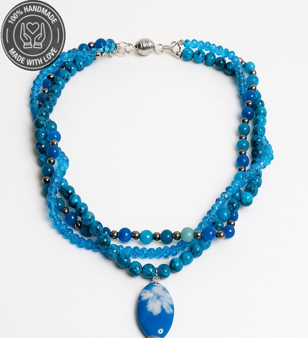 Doğal taşların huzur veren, iletişimi güçlendirici ve nazar karşıtı etkilerini uzun ve şık bir tasarımla boynunuzda taşıyın.