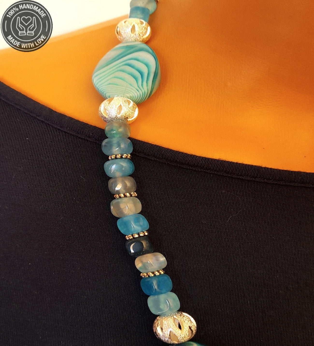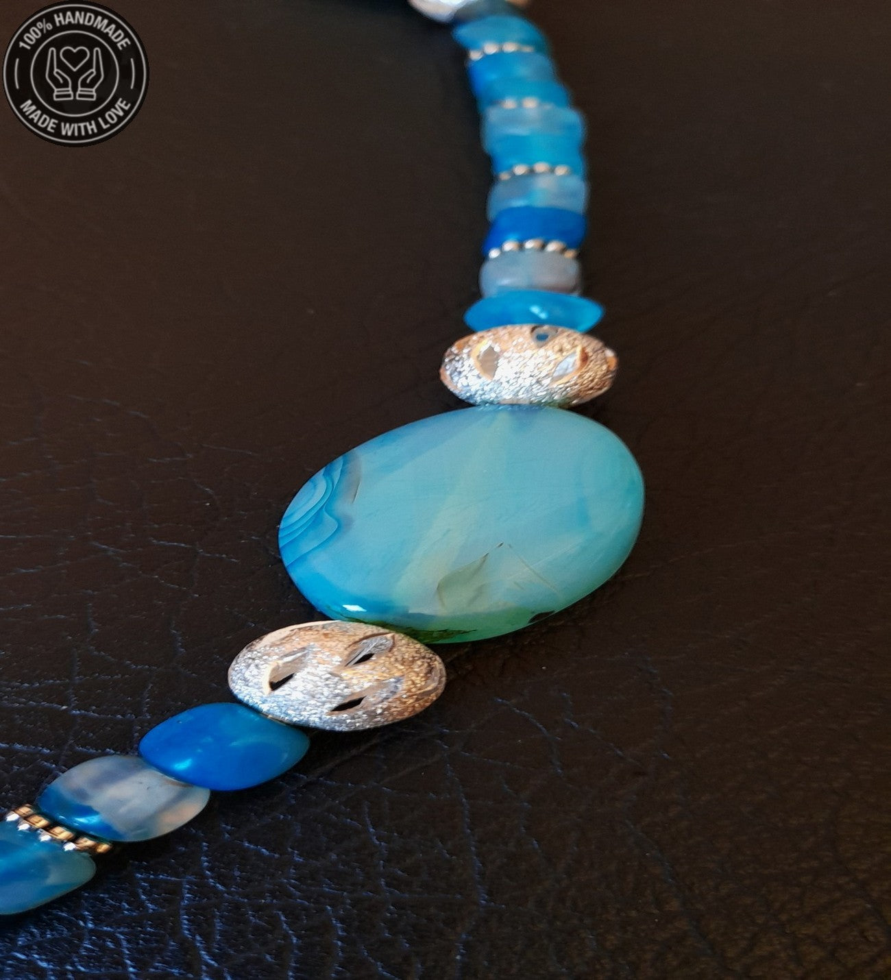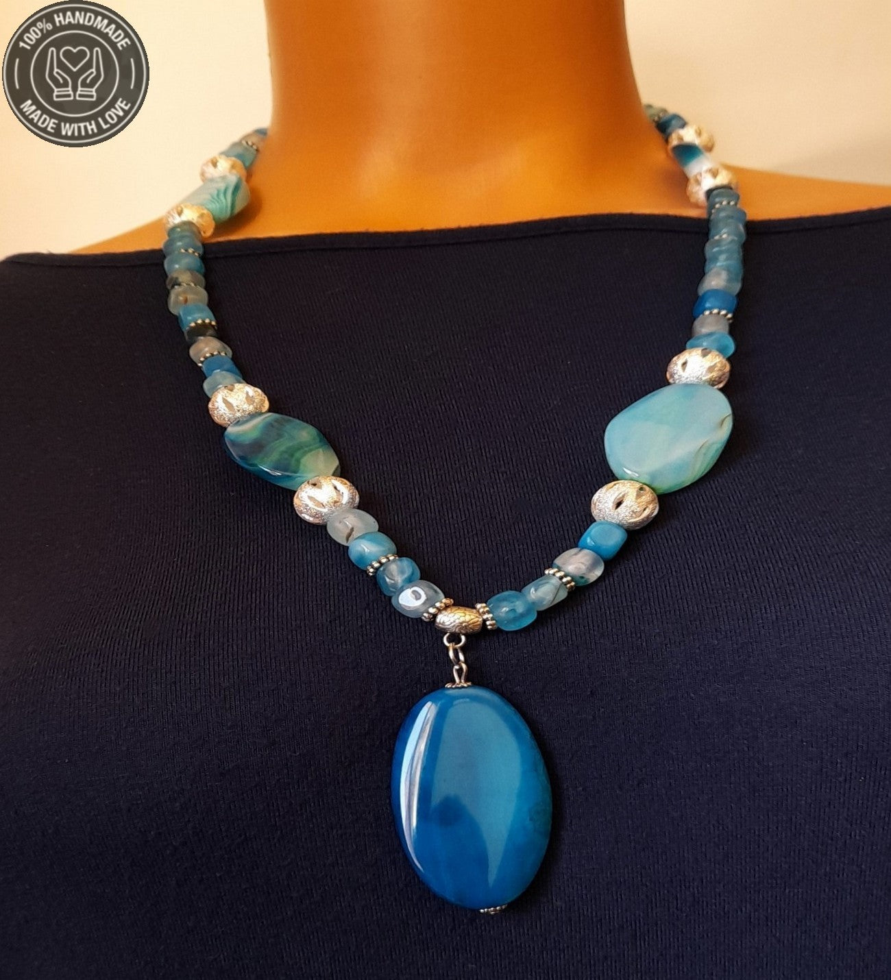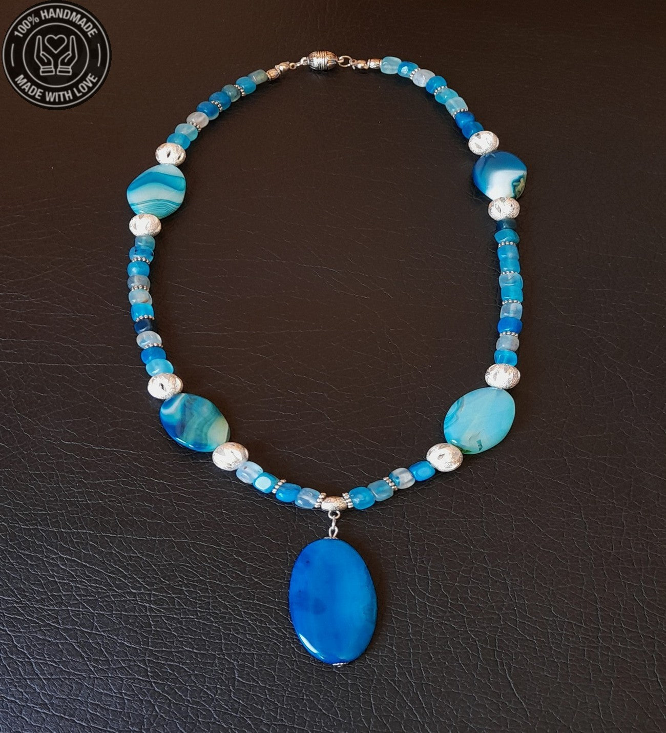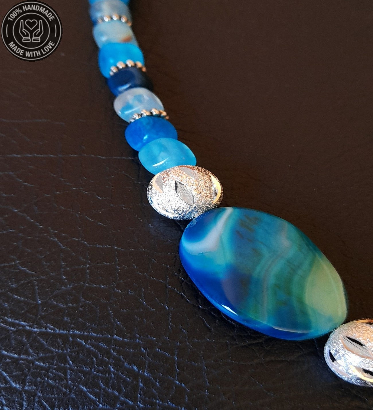 Mavi küp ve iri akikler ile hazırladığımız kolyemiz 55-58 santimdir.