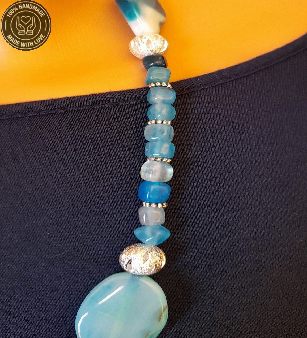 - Uzun Zarafet, Huzur ve Koruma Bir Arada: Özenle seçilmiş Mavi Akik taşlarıyla hazırlanan bu özel uzun kolye, el emeğiyle hayat buldu.