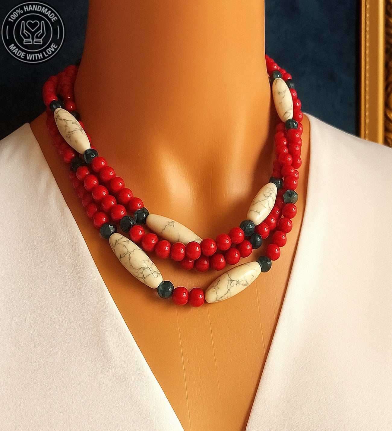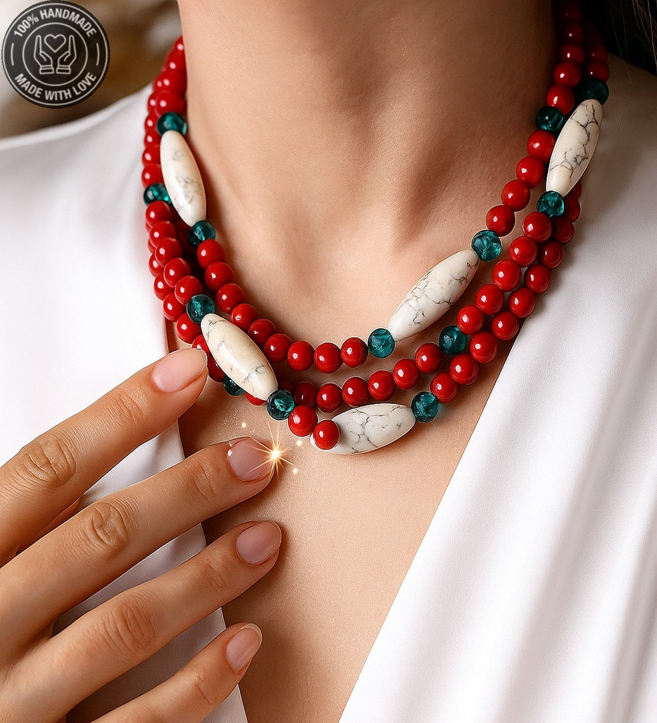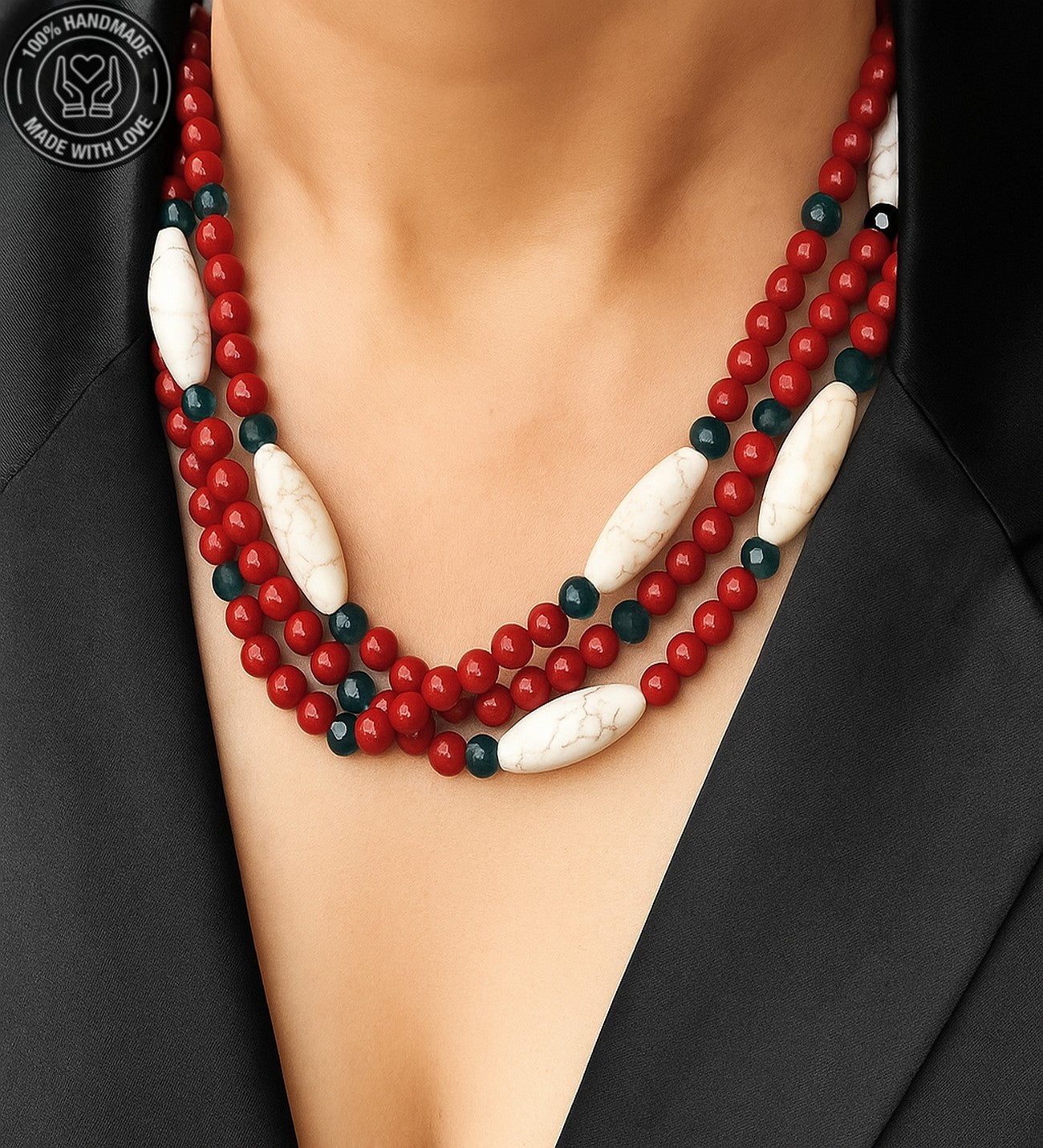 Özenle seçilmiş Mercan ve Havlit taşlarıyla hazırlanan bu özel 3 sıralı kolye, el emeğiyle hayat buldu. Ruhunuza denge katacak bu zarif tasarım, size özel bir enerji sunuyor.