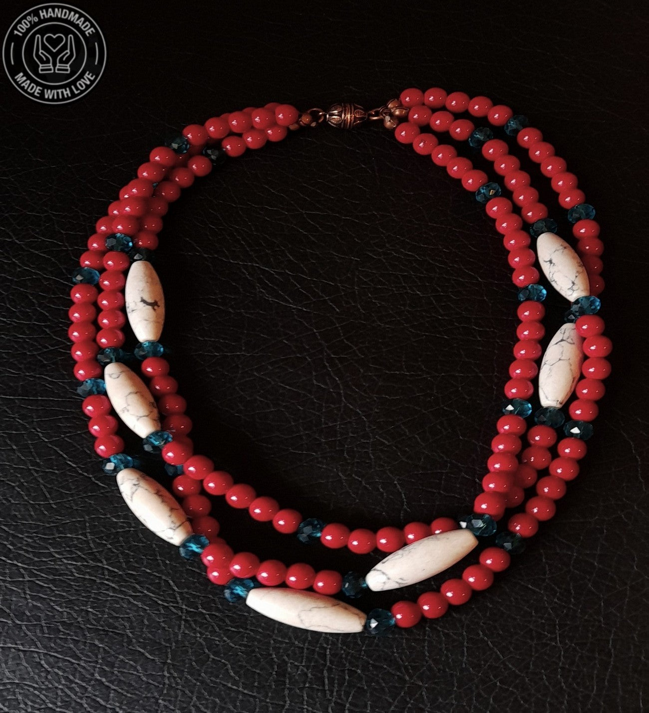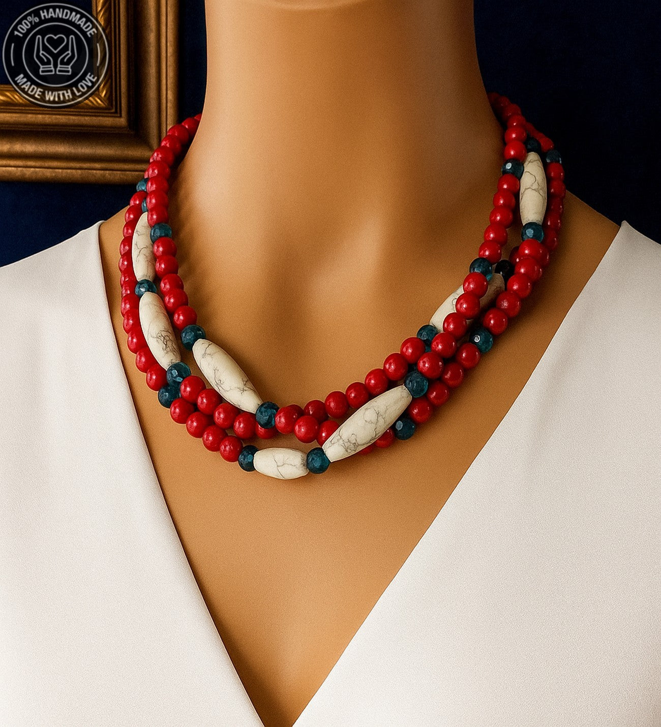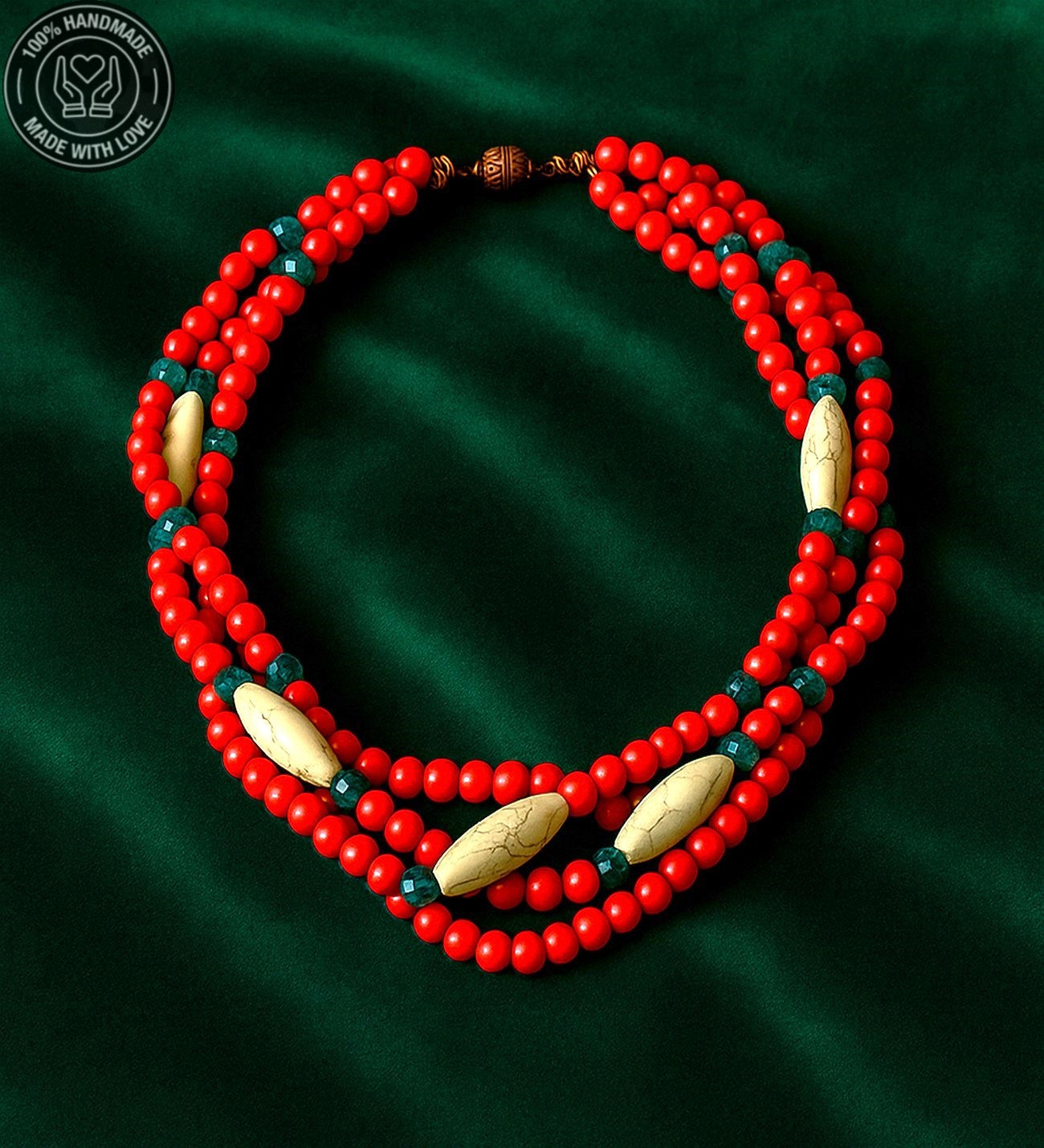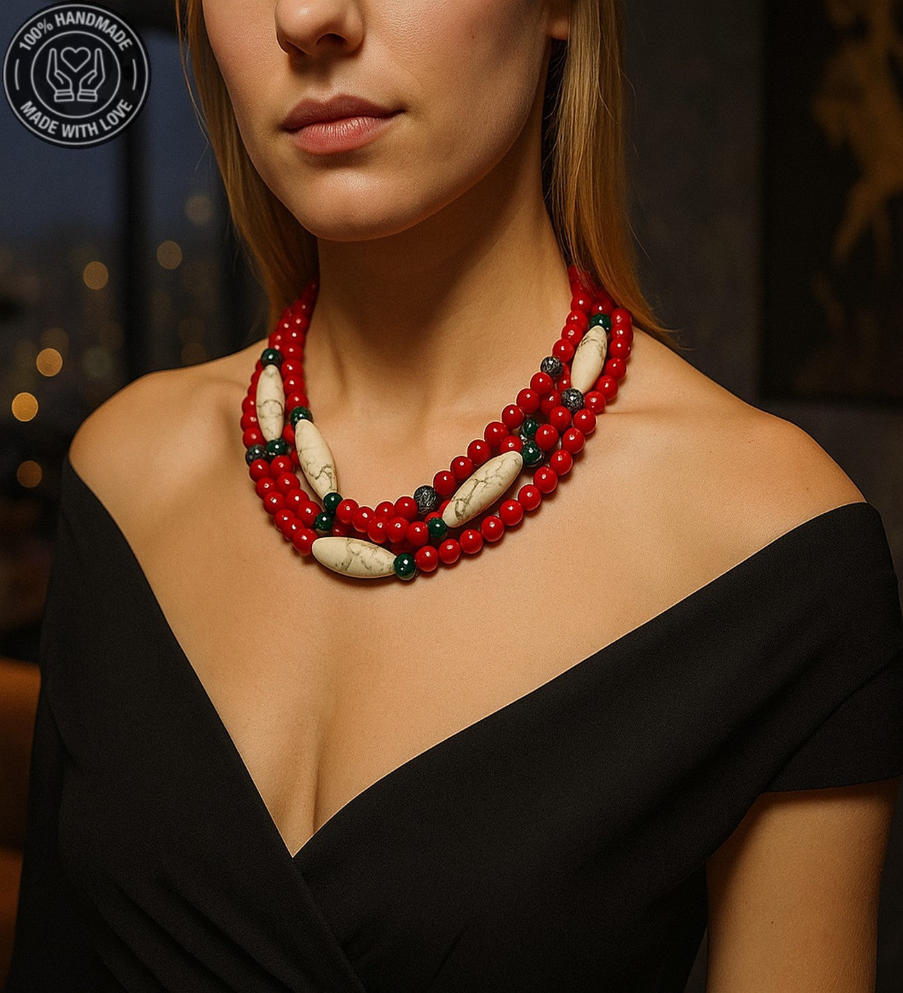 Özenle seçilmiş Mercan ve Havlit taşlarıyla hazırlanan bu özel 3 sıralı kolye, el emeğiyle hayat buldu. Ruhunuza denge katacak bu zarif tasarım, size özel bir enerji sunuyor.
