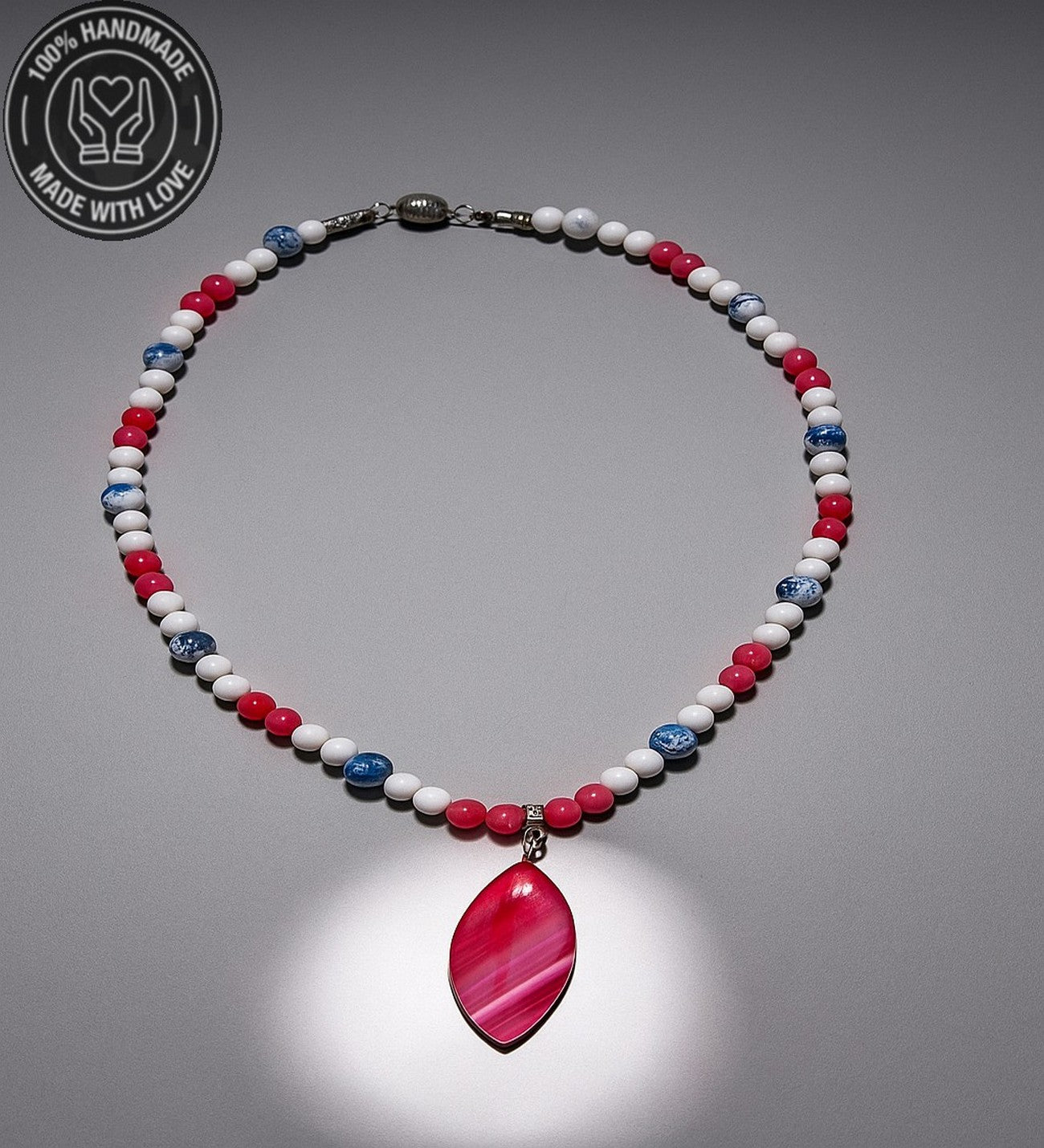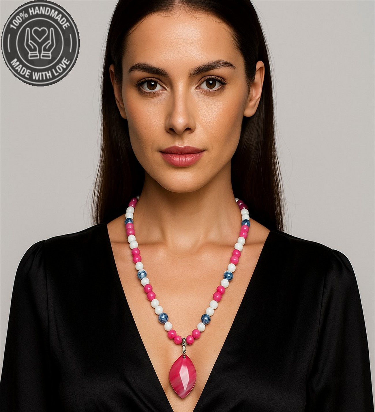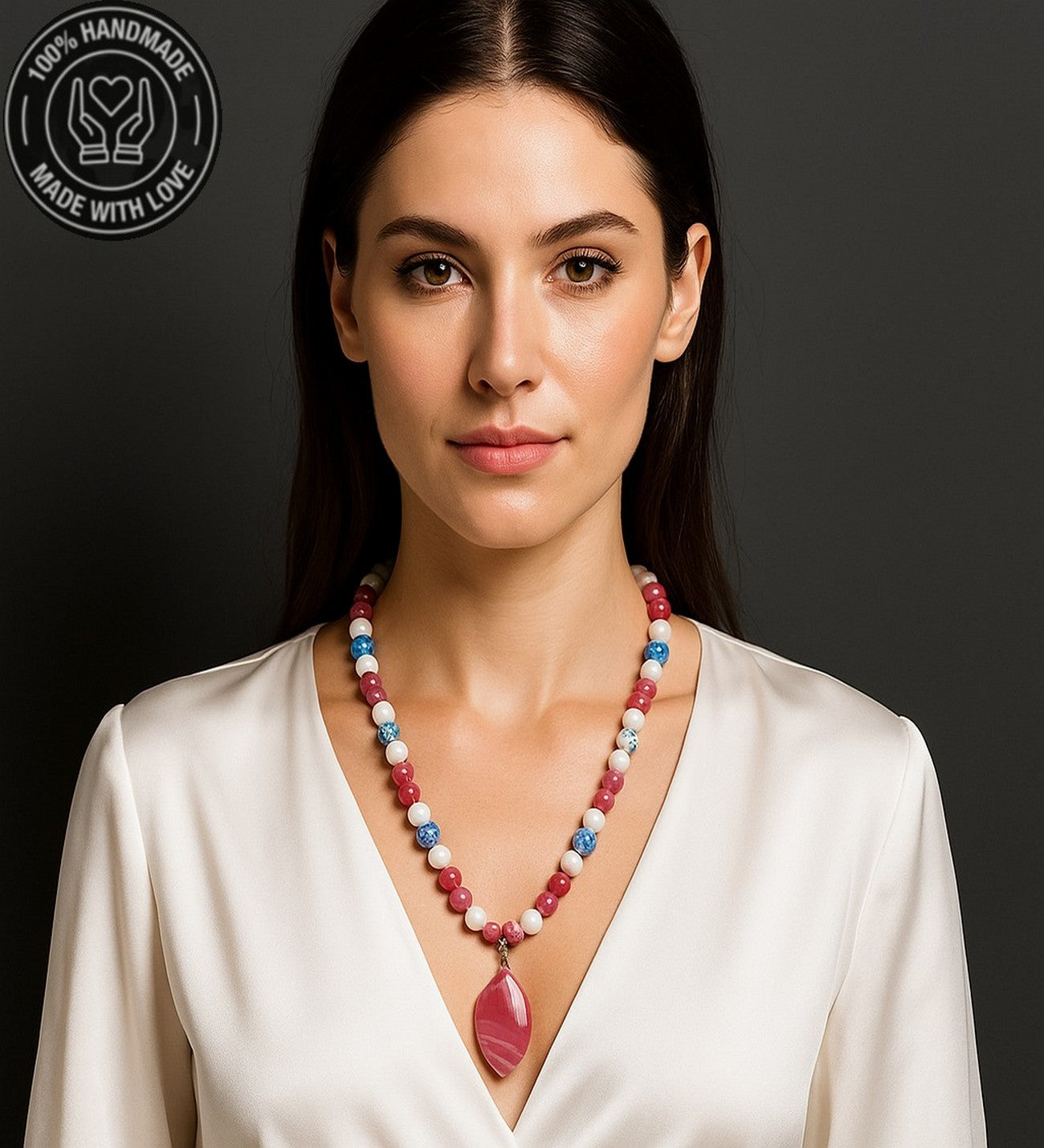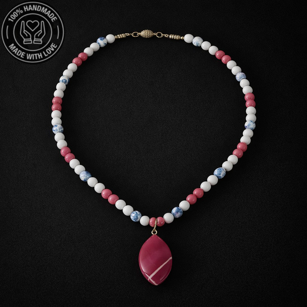 Bu kolye, pembe, beyaz ve mavi akik taşlarının enerjisiyle sevgiyi, huzuru ve iletişimi destekler. Taşların enerjisiyle hem burçlarınızla uyumu yakalayın, hem de günlük yaşamınızda sevgi ve huzura ulaşın.