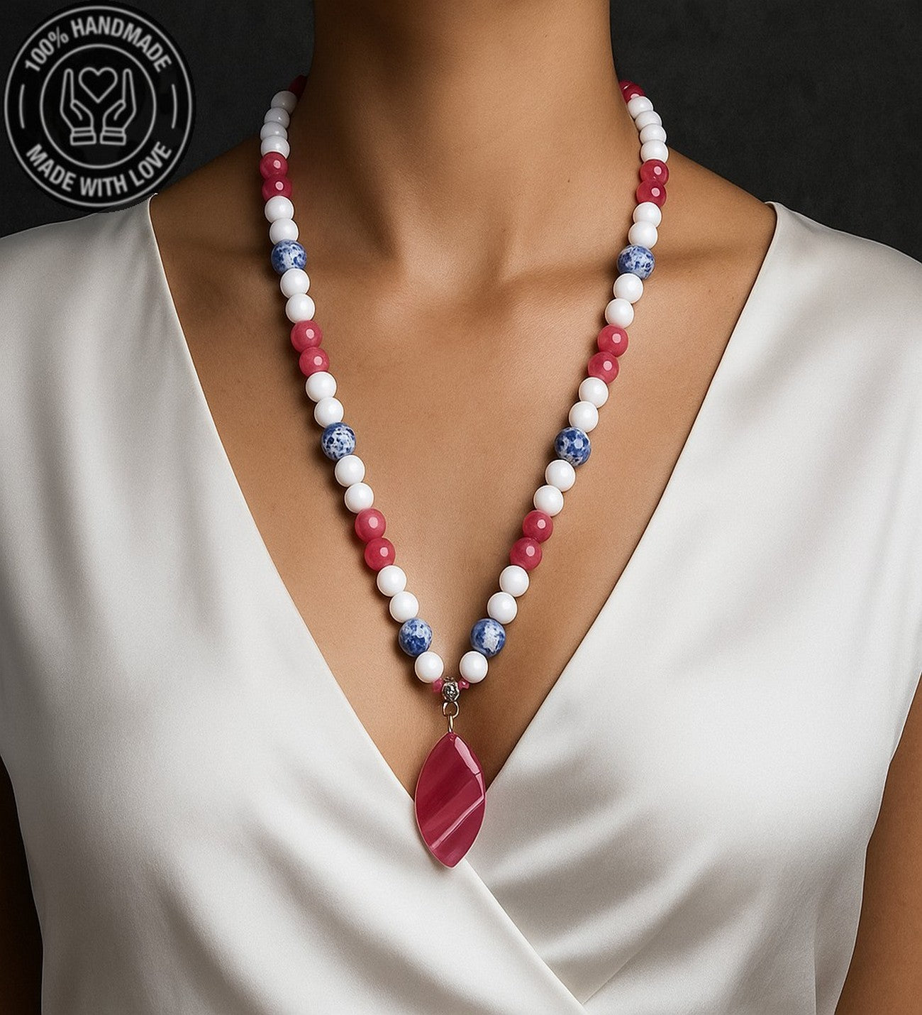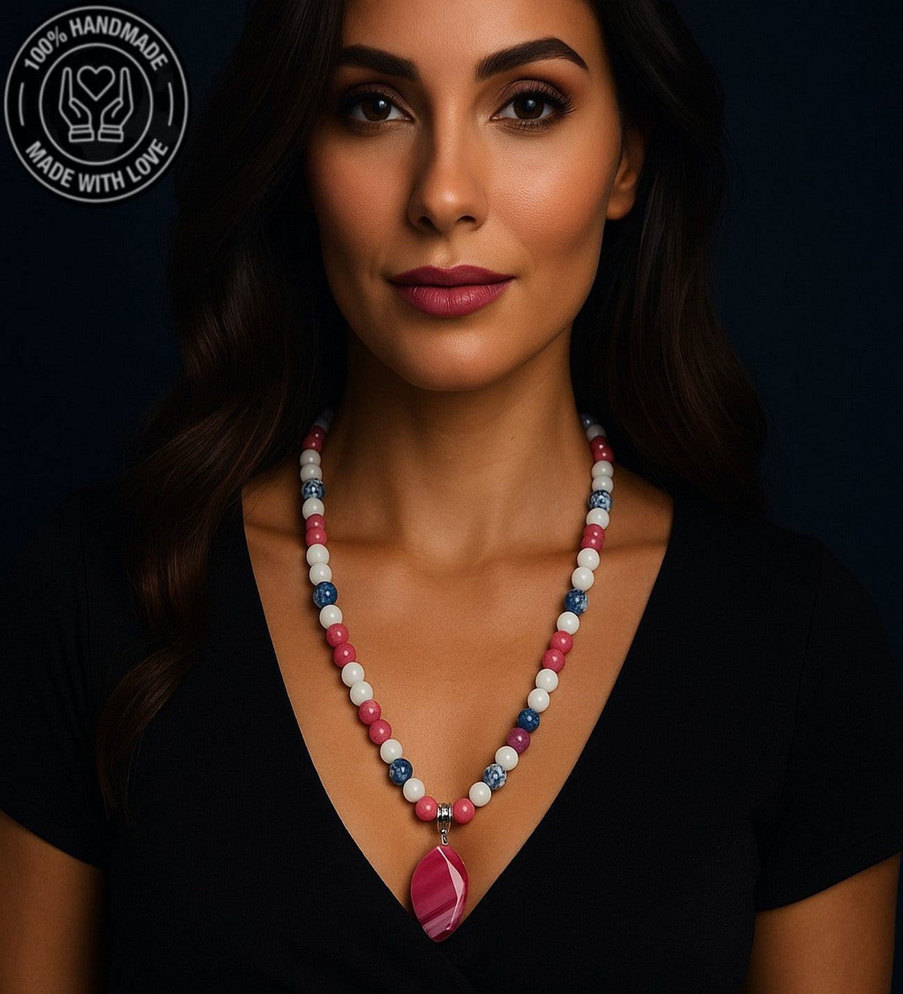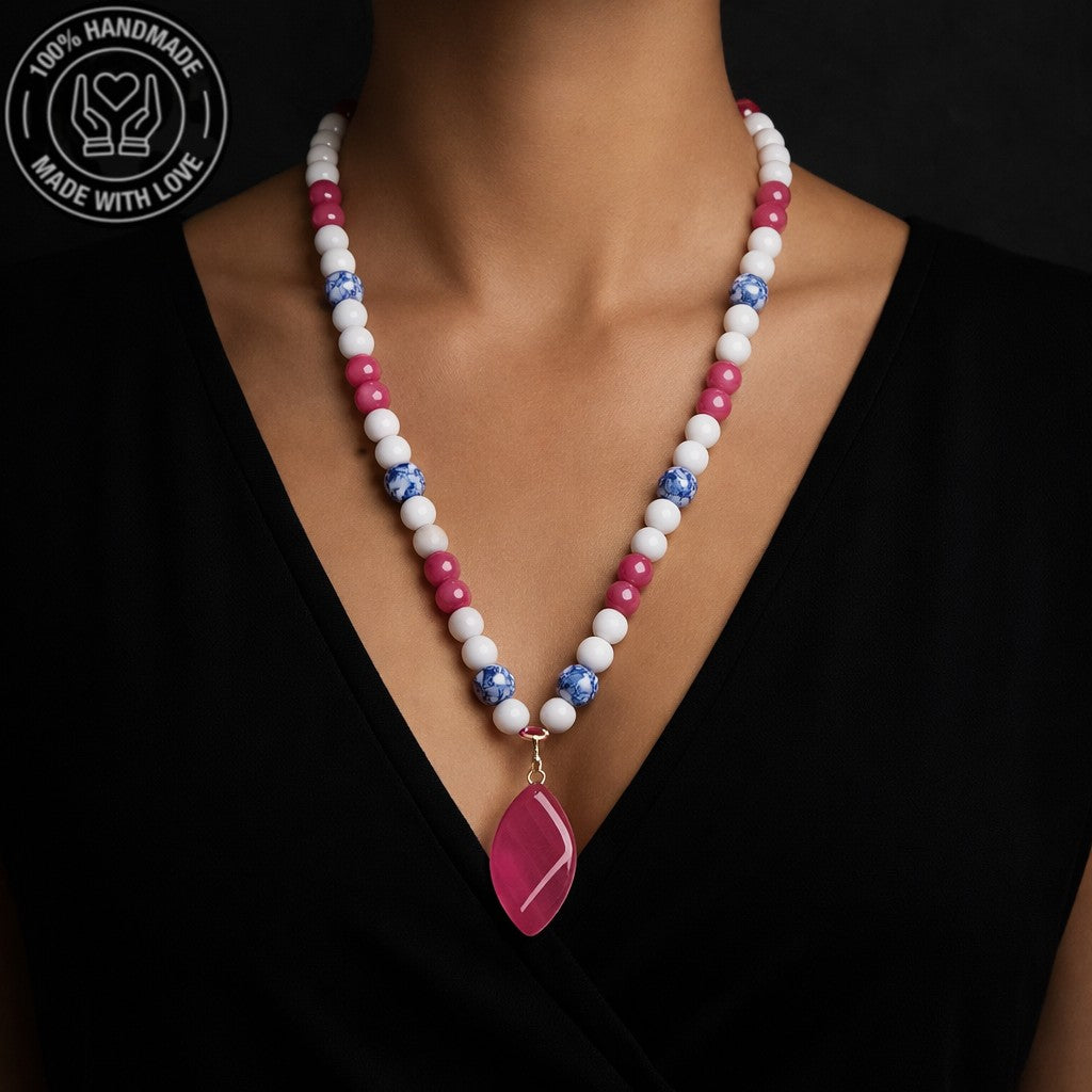 58-60 cm uzunluğundaki bu özel uzun kolye, pembe, beyaz ve mavi akik taşlarının eşsiz uyumuyla tasarlandı. Sevgi, huzur ve iletişim enerjilerini bir araya getiriyor. Farklı ölçü için not bırakın.
