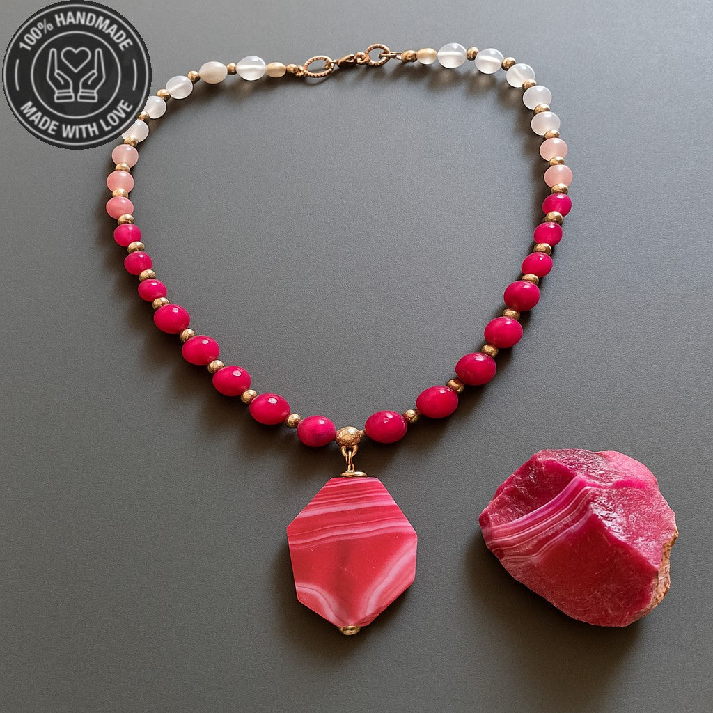 Özenle hazırlanan bu zarif kolye, pembe akik ve ceyt (yeşim) taşlarının nazik ve huzurlu enerjilerini bir araya getirir. Pembe akik sevgi ve duygusal dengeyi desteklerken, aynı zamanda nazara karşı etkili olduğuna inanılır. Ceyt taşı ise huzur ve uyum enerjisi sunar. Kolye uzunluğu yaklaşık 48-50 cm'dir. Farklı bir ölçü isterseniz lütfen bildirin.
