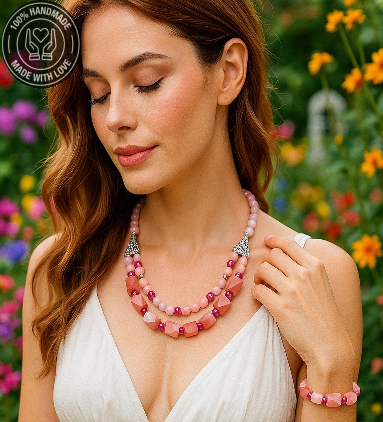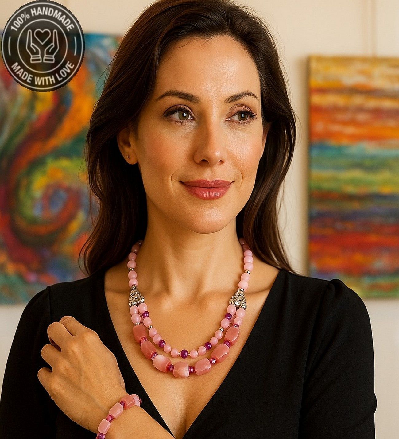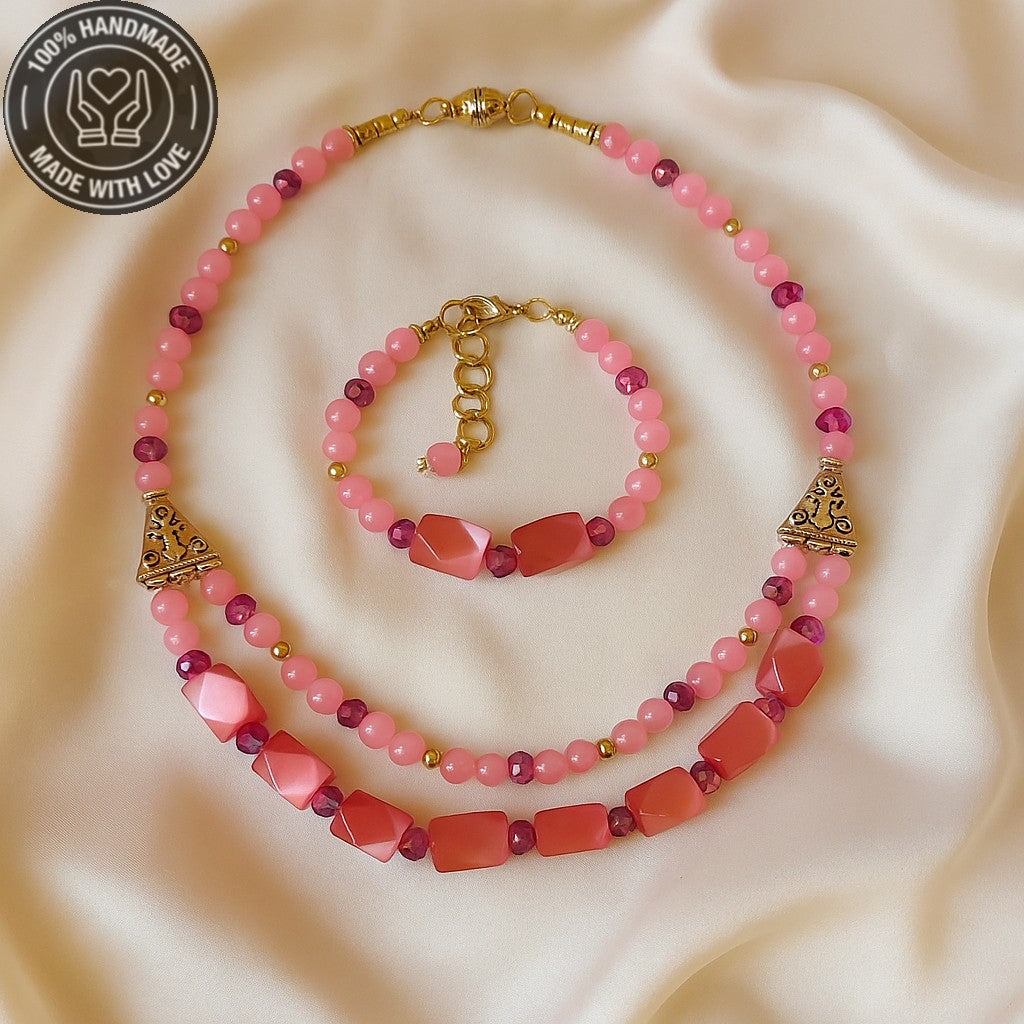 Özenle seçilmiş Pembe Sedef ve Pembe Kuvars taşlarıyla hazırlanan bu özel kolye bileklik seti, el emeğiyle hayat buldu. Ruhunuza denge katacak bu zarif tasarım, size özel bir enerji sunuyor.