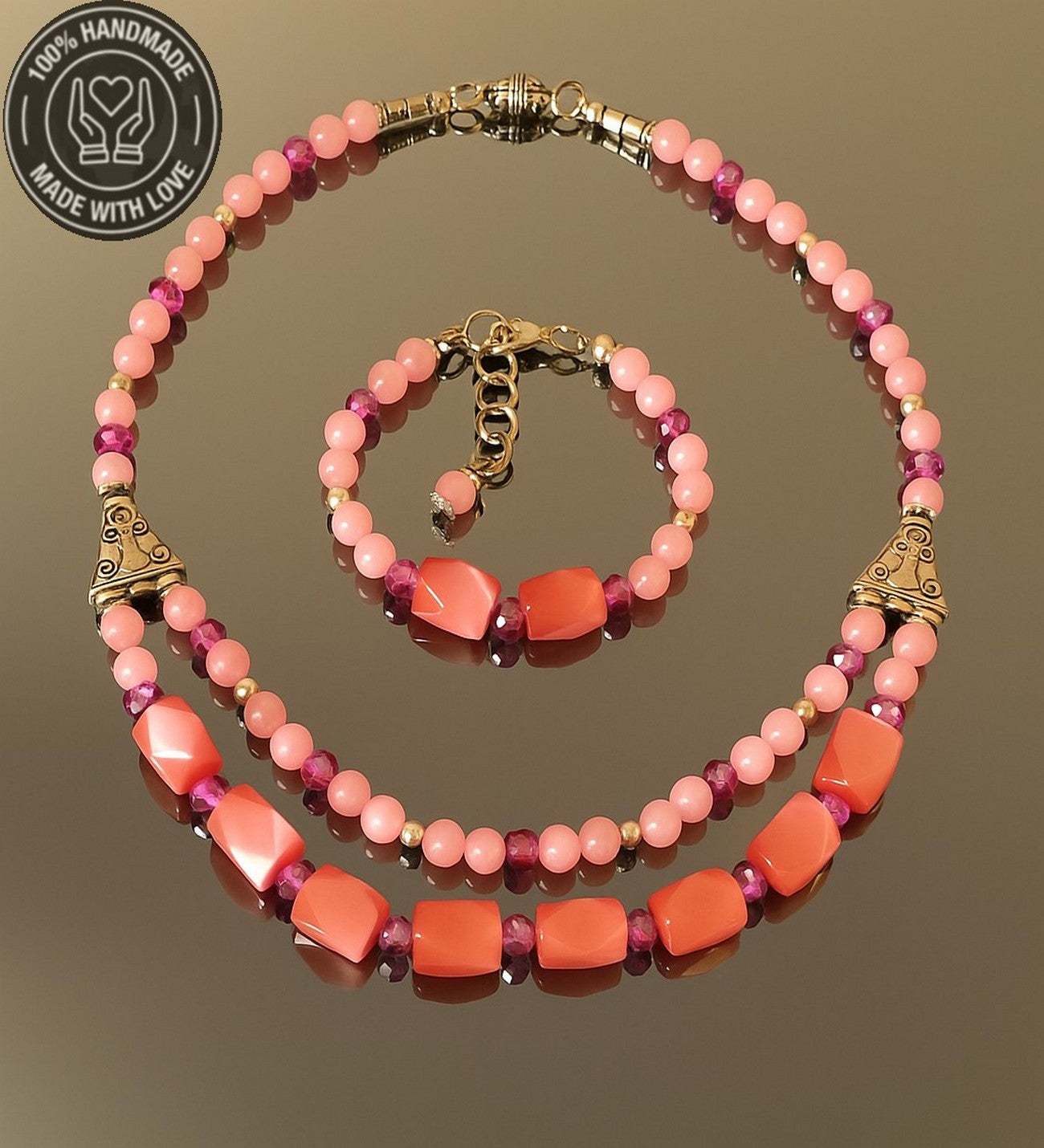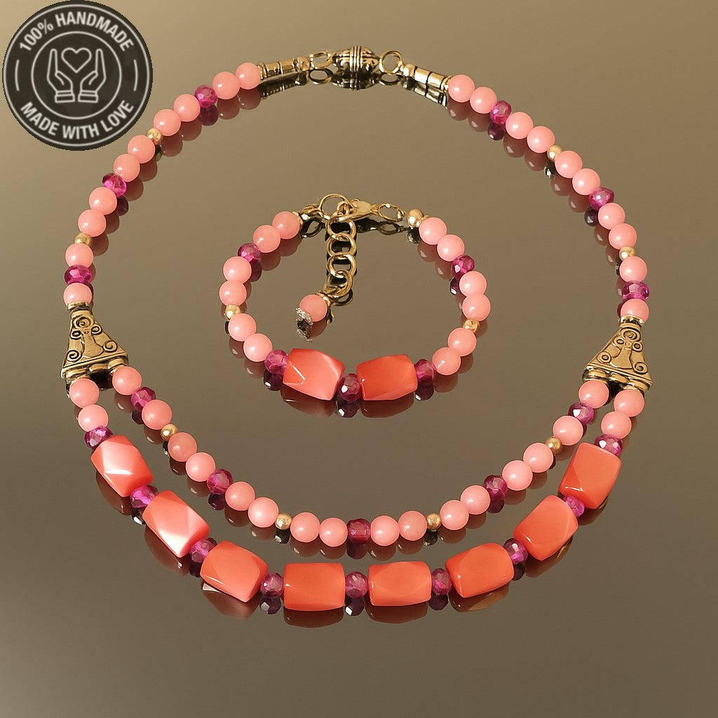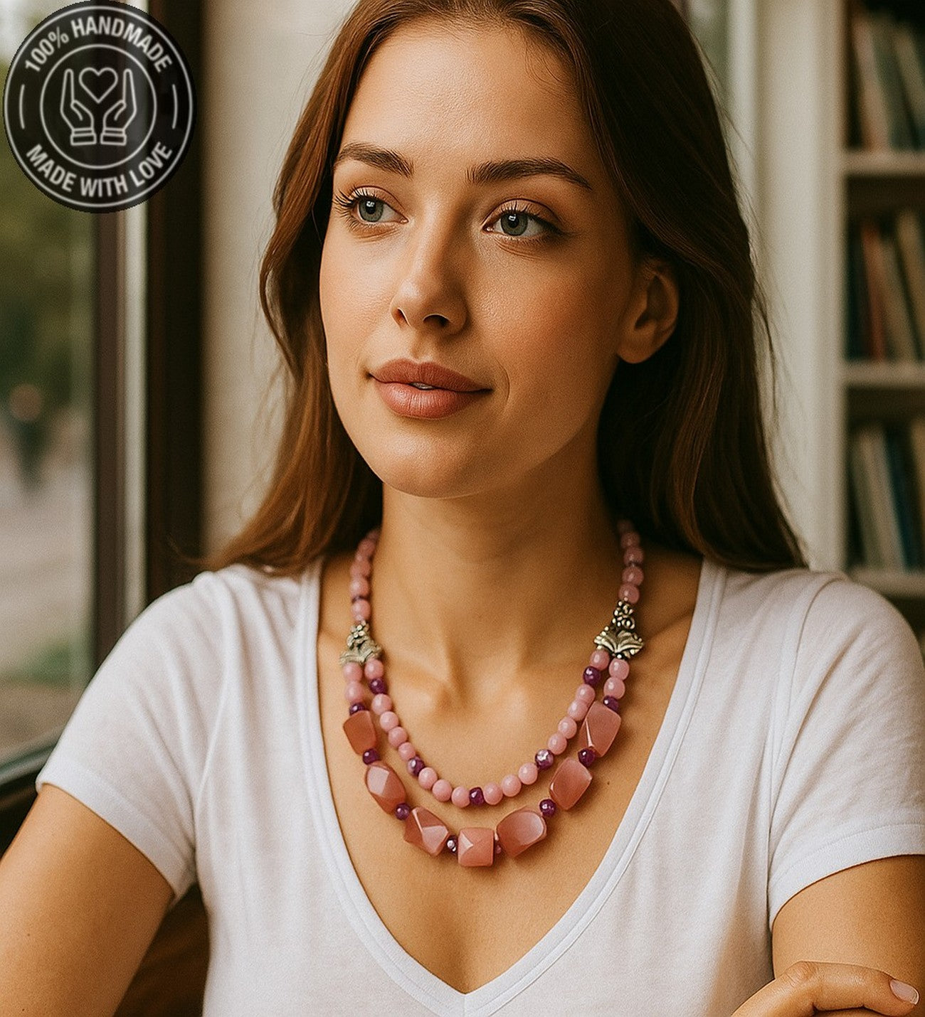 Özenle seçilmiş Pembe Sedef ve Pembe Kuvars taşlarıyla hazırlanan bu özel kolye bileklik seti, el emeğiyle hayat buldu. Ruhunuza denge katacak bu zarif tasarım, size özel bir enerji sunuyor.