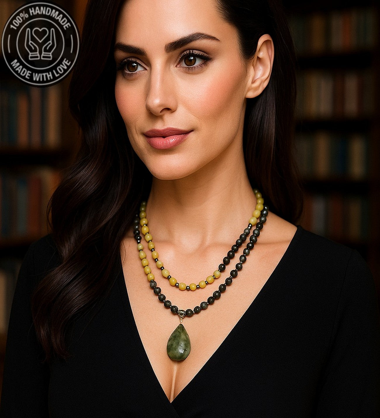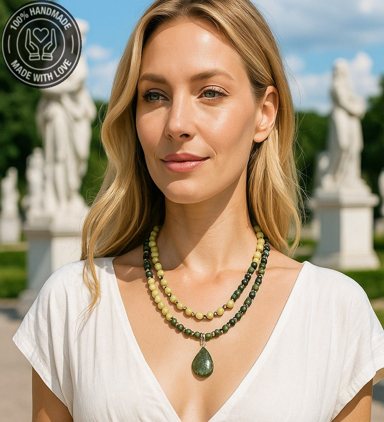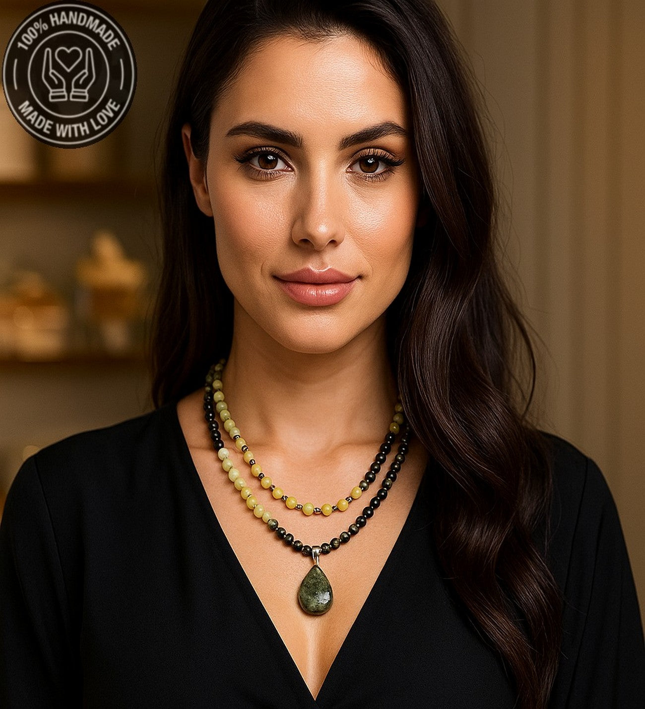 Kolye uzunluğu yaklaşık 48-50 cm'dir. Farklı bir ölçü vermek isterseniz lütfen bunu bize bildirin. El yapımı bu iki sıralı kolye, peridot ve yeşim taşlarının ışıltılı enerjilerini bir araya getirir. Peridot canlılık ve neşe verirken, yeşim huzur ve uyum enerjisi sunar. Bu pozitif kombinasyon, günlük yaşamınıza enerji ve mutluluk katmaya yardımcı olabilir.