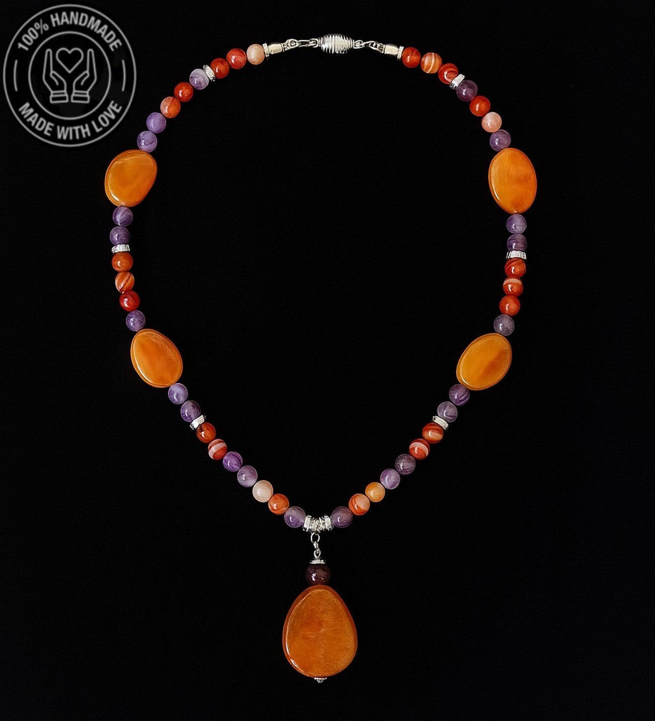 Özenle seçilmiş Ametist ve Akik taşlarından hazırlanan bu özel Premium seri uzun kolye, el emeğiyle hayat buldu. Ruhunuza denge katacak bu zarif tasarım, size özel bir enerji sunuyor.