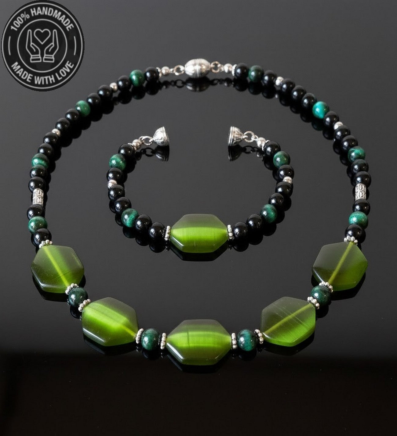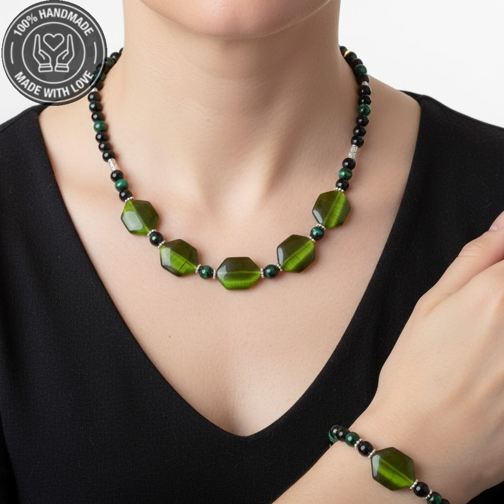 Sedef Oniks Yeşil Kaplan Gözü Güç, Odaklanma Ve Nazardan Korunma Kolye Bileklik Seti