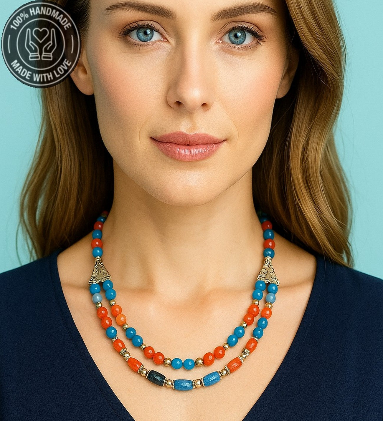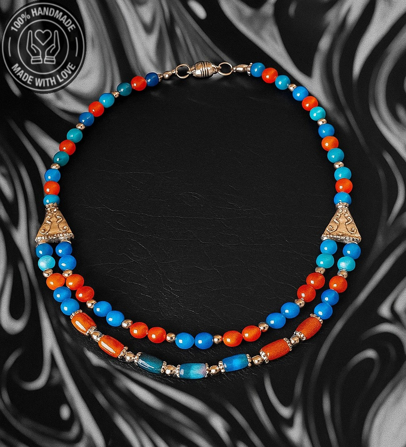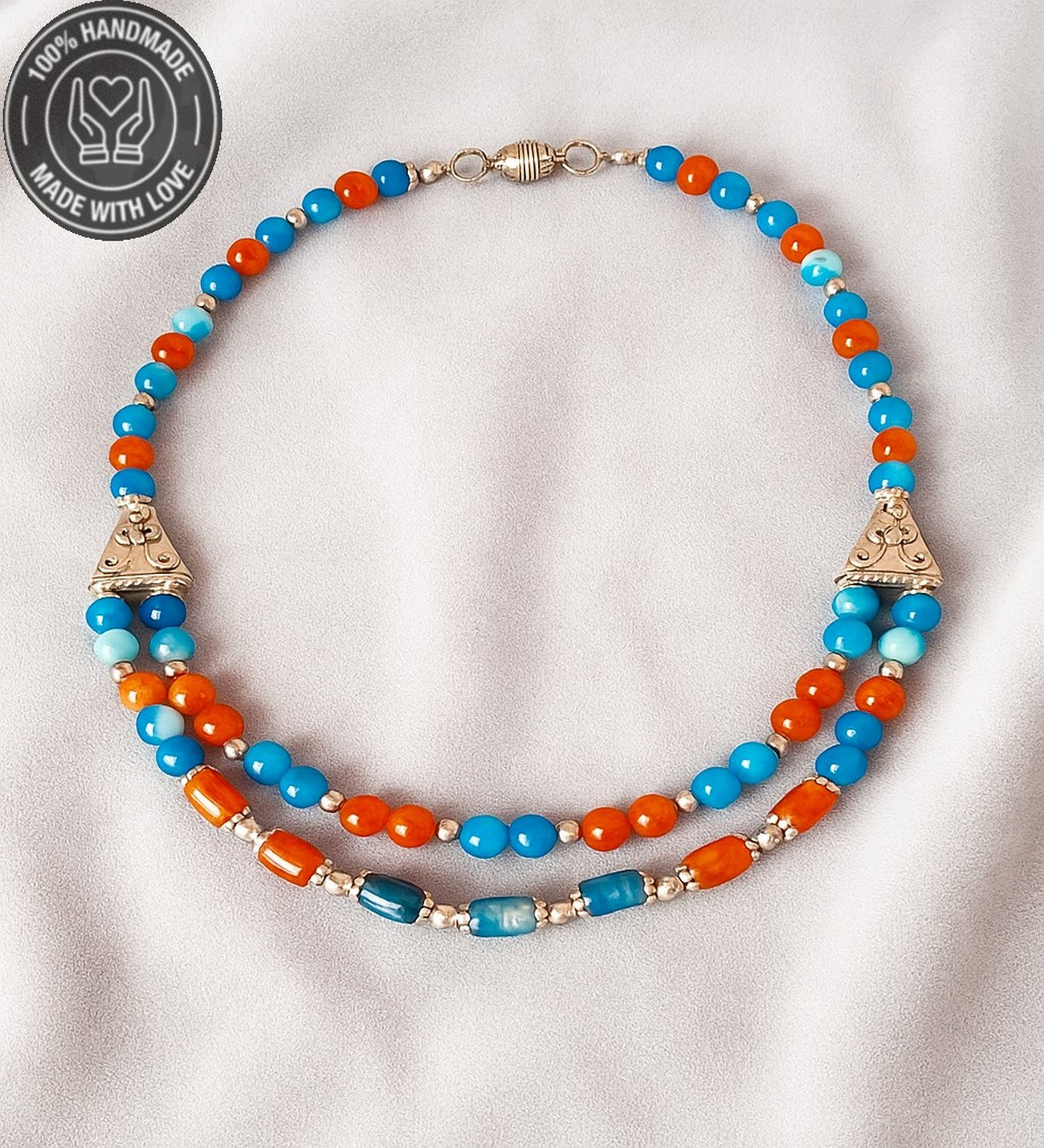 Özenle seçilmiş Turuncu ve Mavi Akik taşlarıyla hazırlanan bu özel 2 sıralı kolye, el emeğiyle hayat buldu. Ruhunuza denge katacak bu zarif tasarım, size özel bir enerji sunuyor.