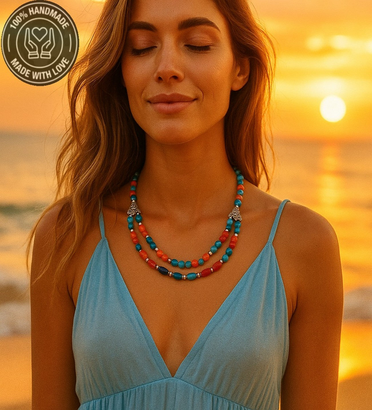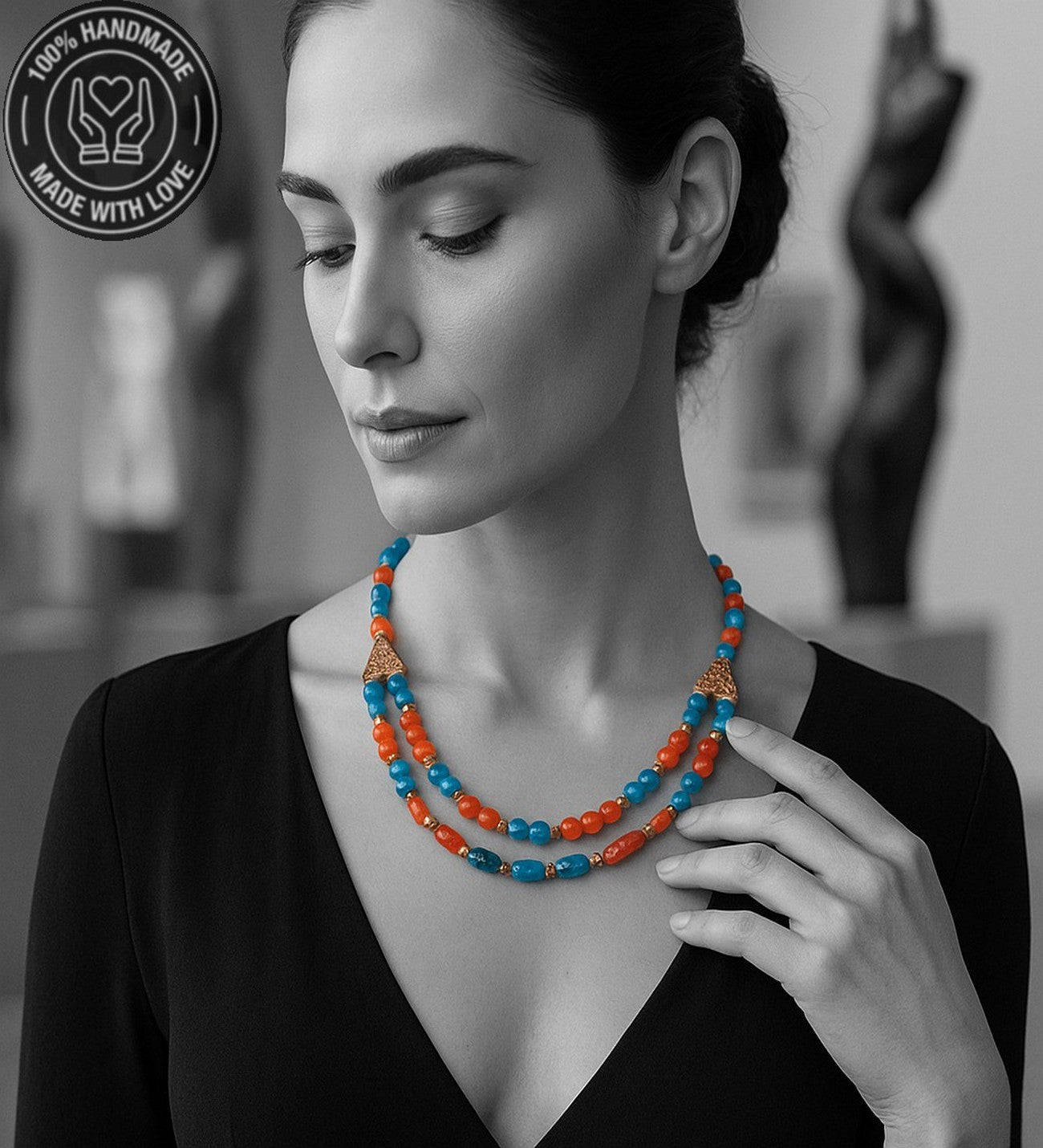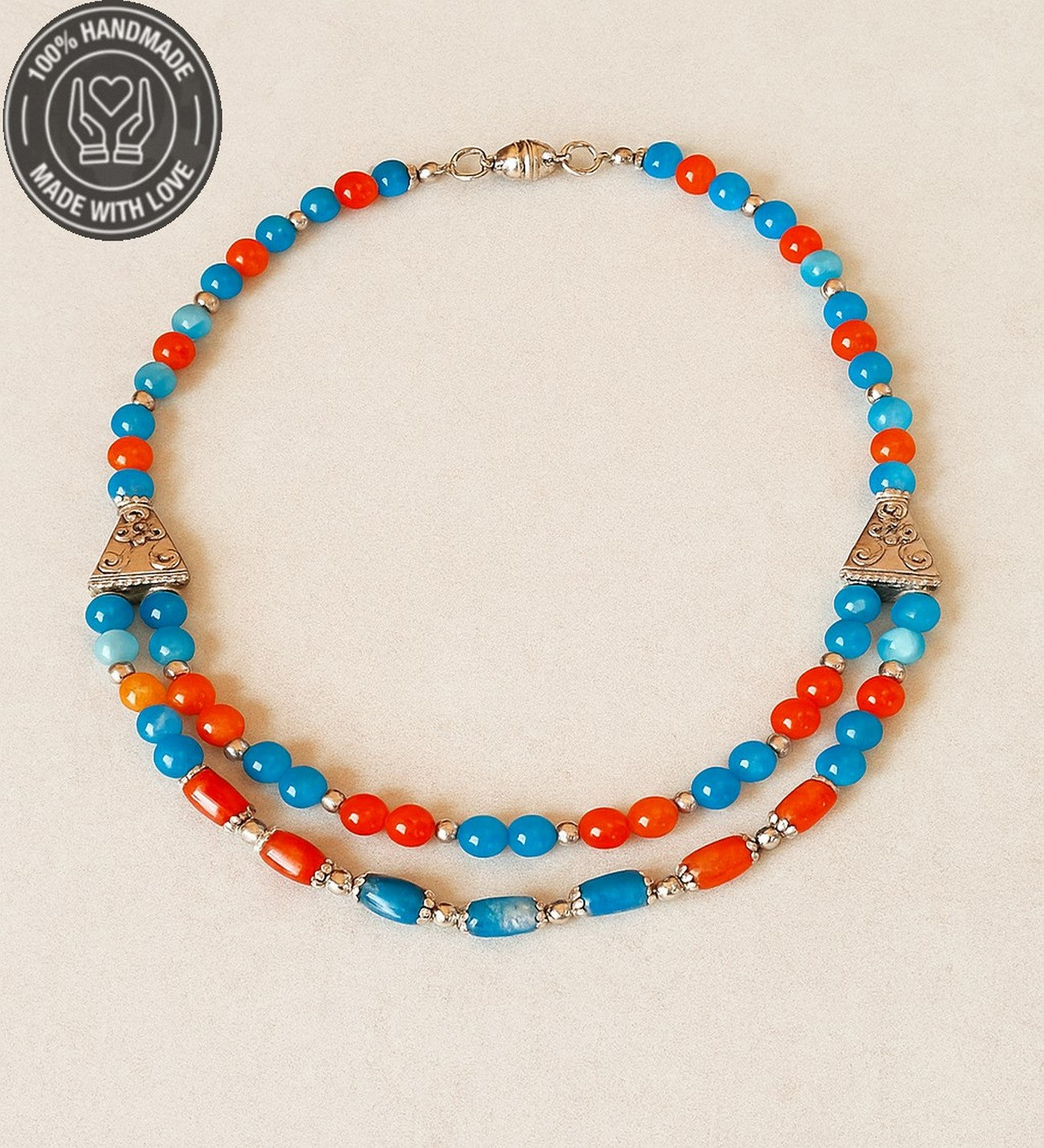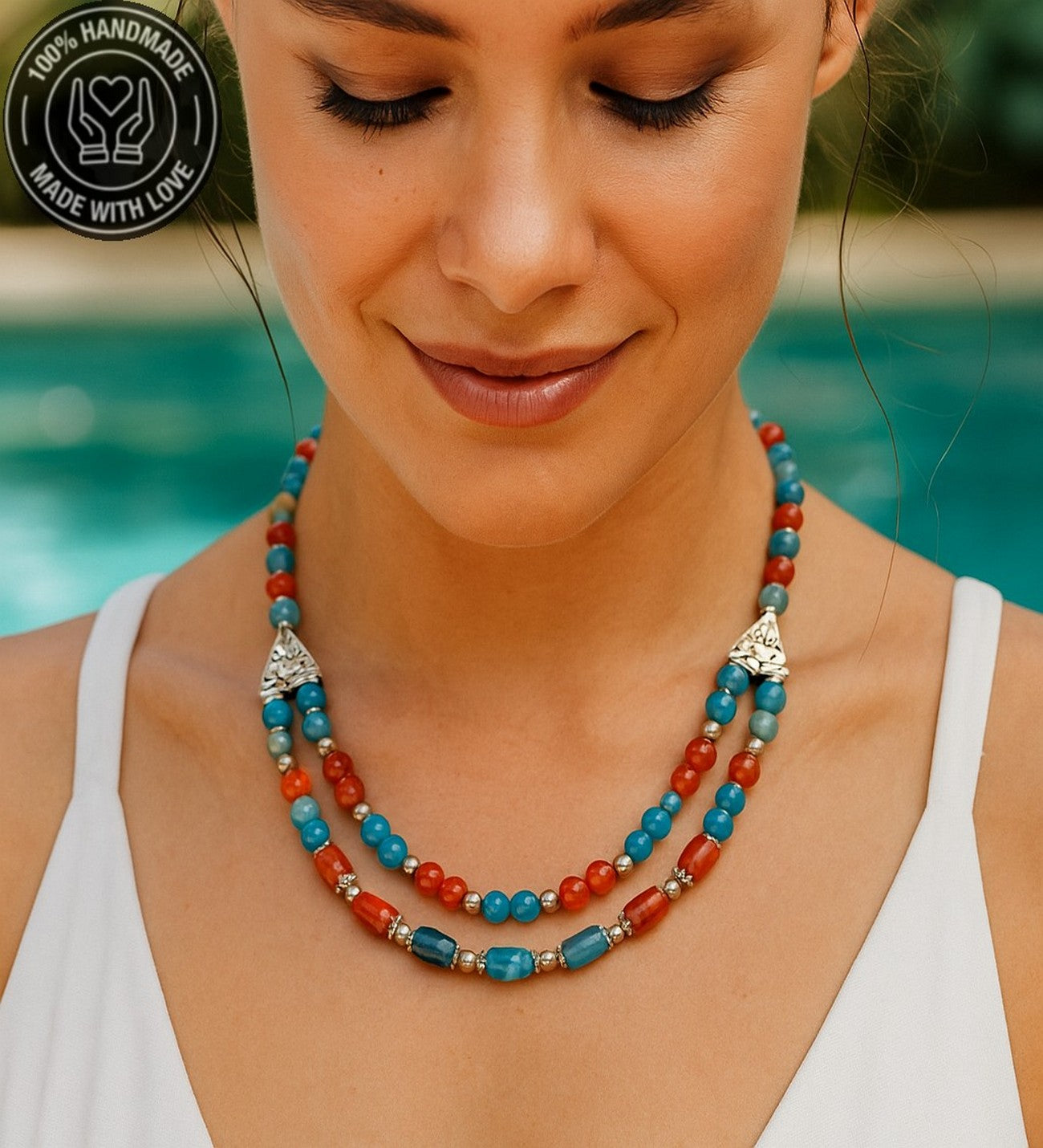 Özenle seçilmiş Turuncu ve Mavi Akik taşlarıyla hazırlanan bu özel 2 sıralı kolye, el emeğiyle hayat buldu. Ruhunuza denge katacak bu zarif tasarım, size özel bir enerji sunuyor.