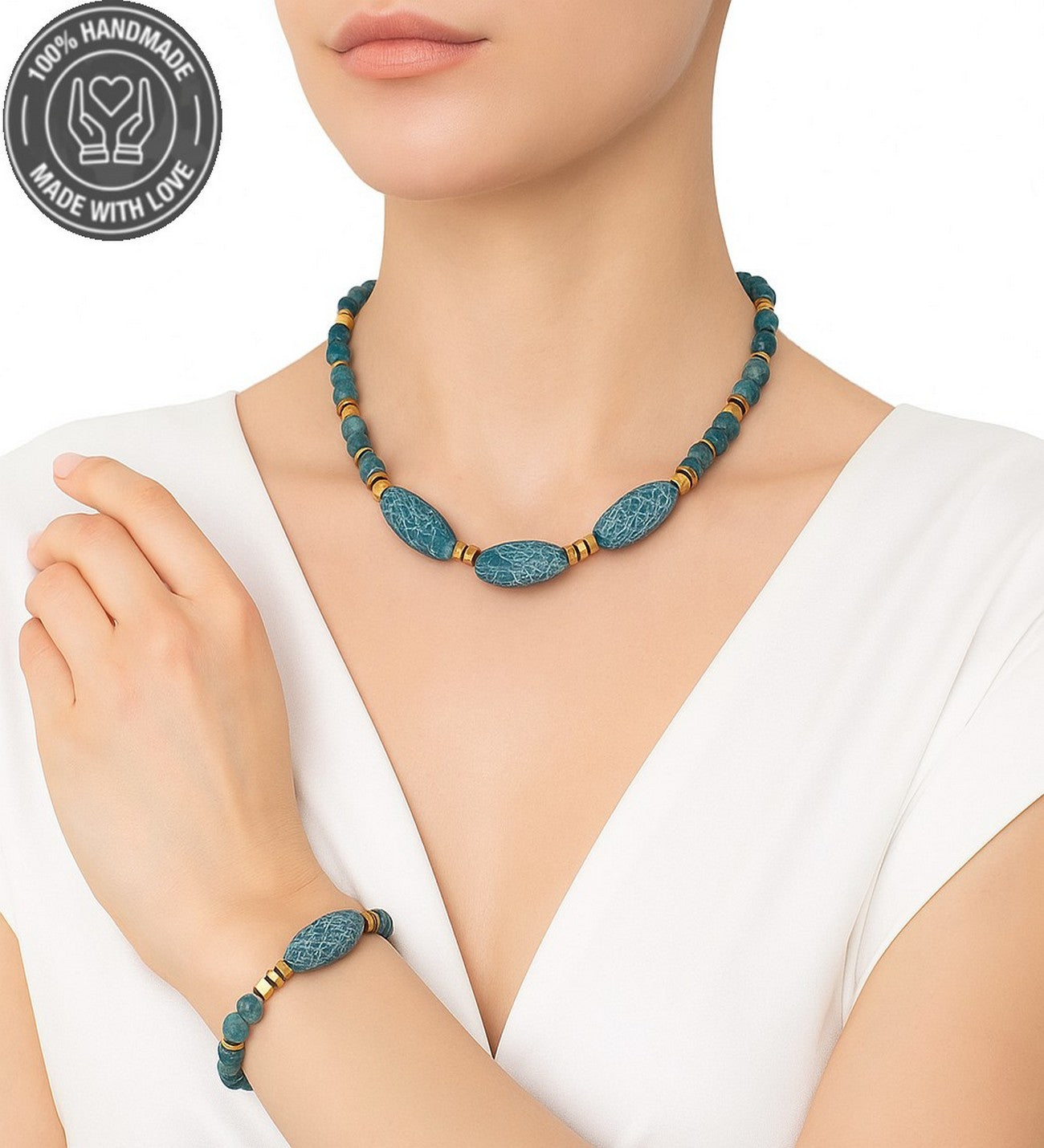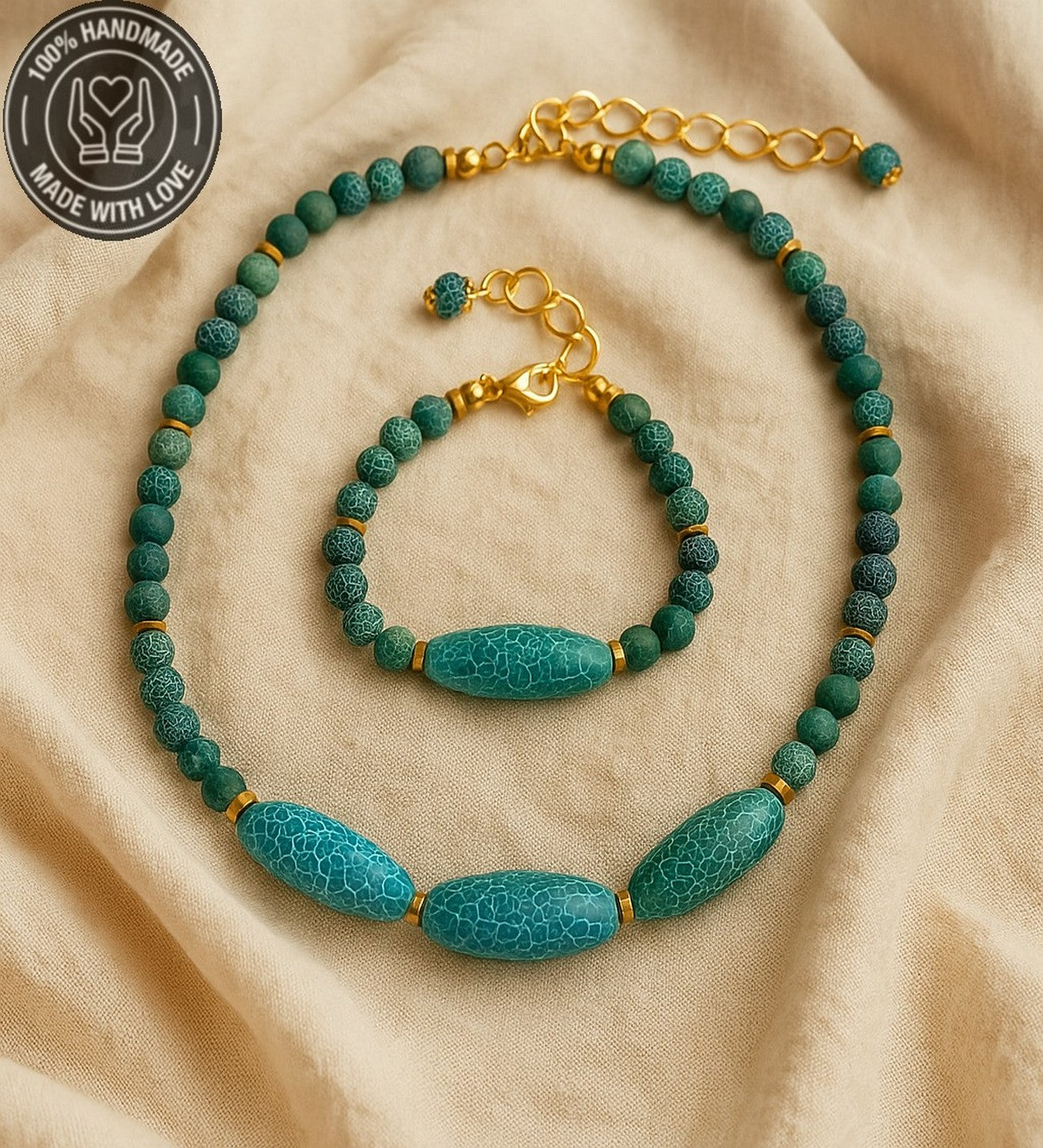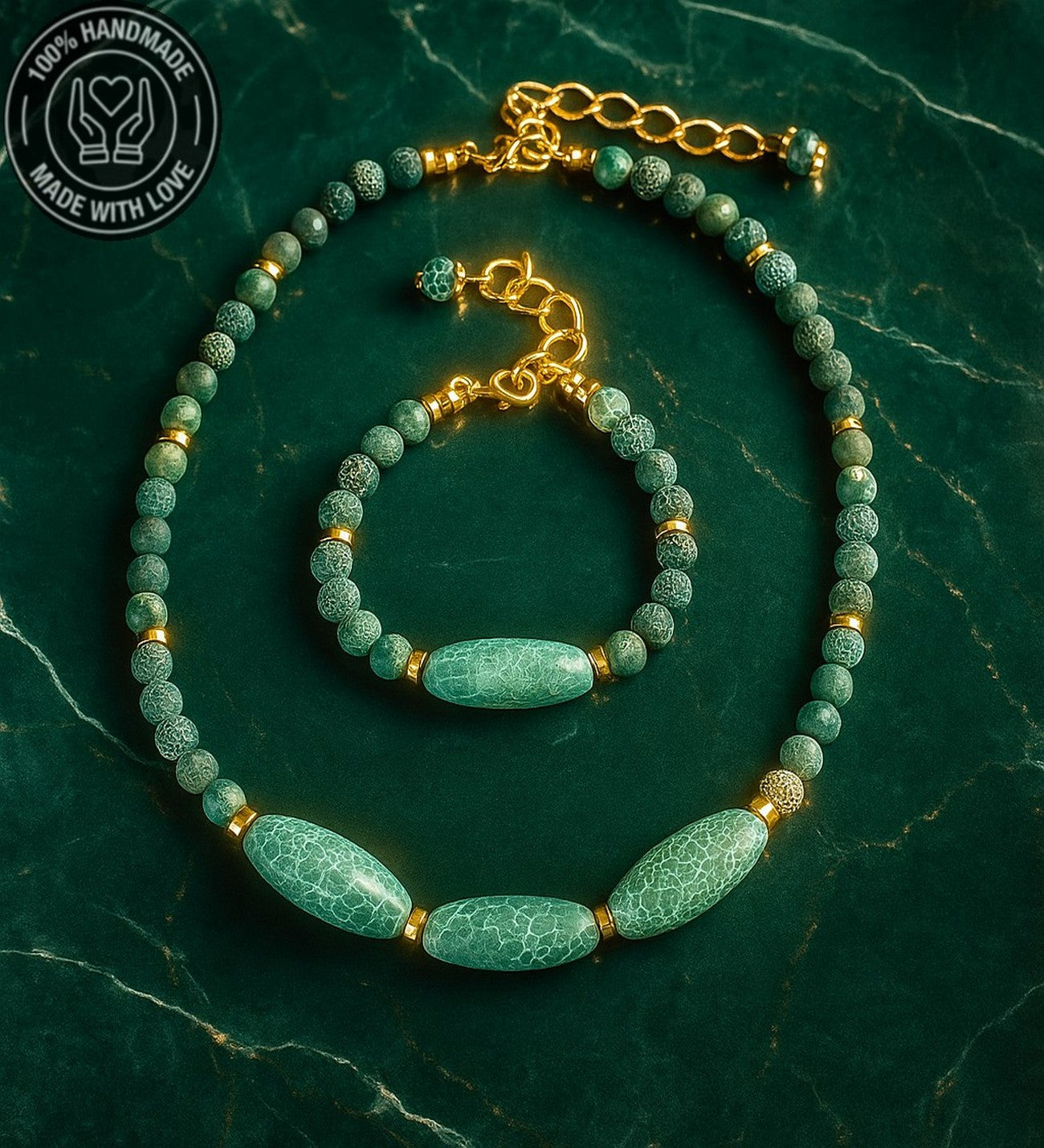 Yeşil akik taşının nazardan koruma ve denge enerjisi bu özel sette modern bir tasarımla buluşuyor. Doğal tonlarıyla günlük kullanımda hem şik bir görünüm sunar hem de sakinlik hissi verir.
