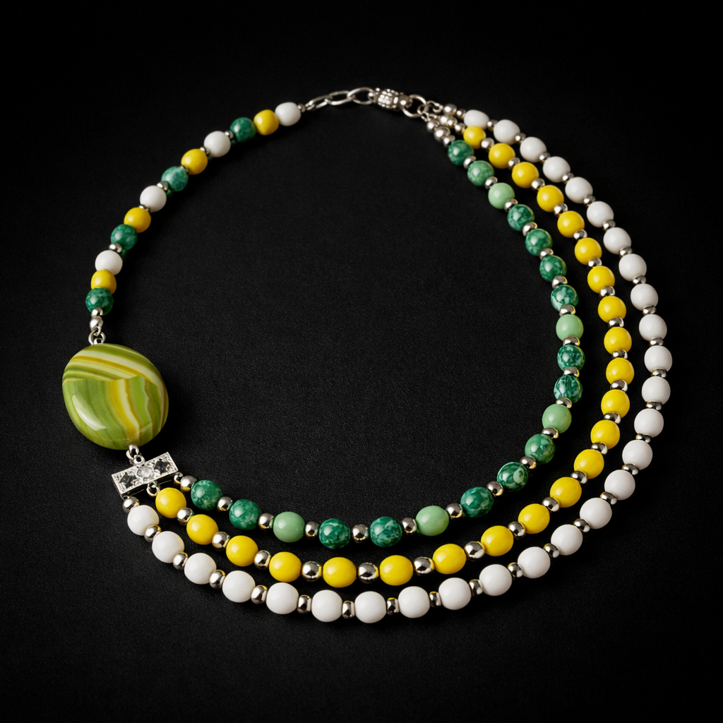 Özenle seçilmiş Yeşil Akik, Peridot (Zebercet) ve Havlit taşlarıyla hazırlanan bu özel 3 sıralı kolye, el emeğiyle hayat buldu. Ruhunuza denge katacak bu zarif tasarım, size özel bir enerji sunuyor.