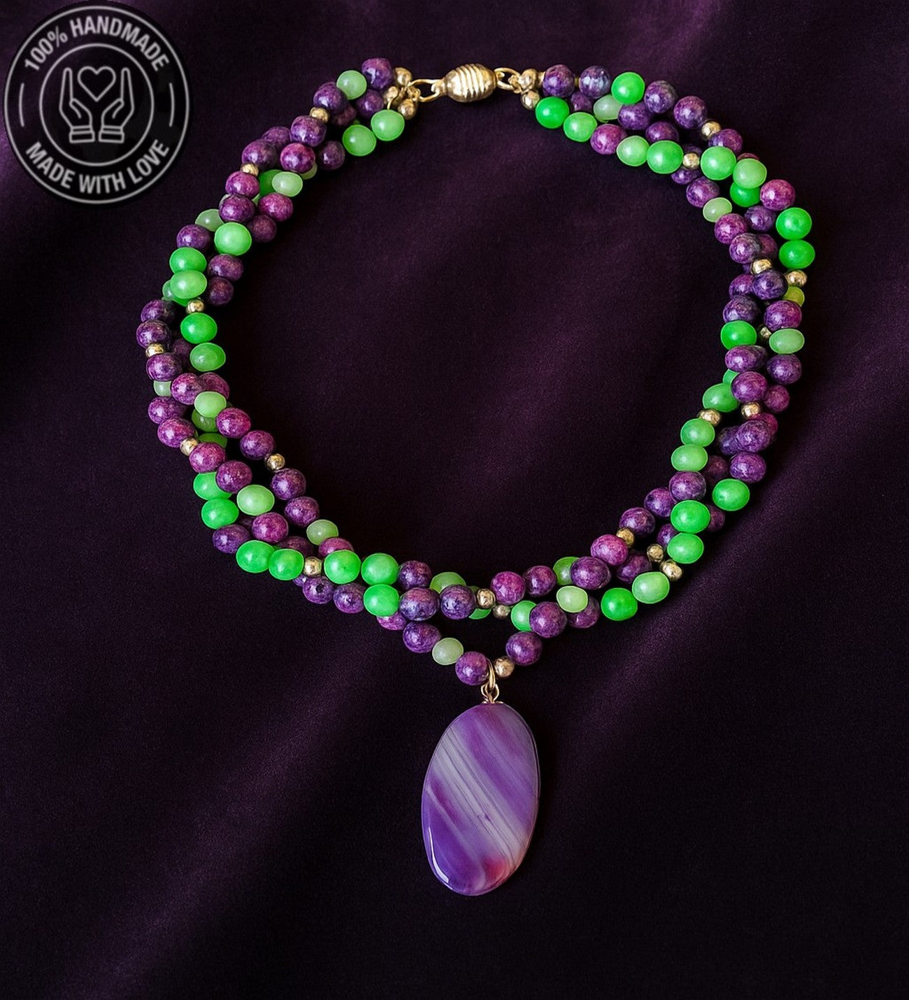 El yapımı bu özel tasarım üç sıralı kolye, doğal yeşil ceyt ve bordo kırçıllı ceyt taşlarının güçlü enerjilerini bir araya getirerek negatif enerjilere karşı koruma ve cesareti desteklemeyi amaçlar. Yeşil ceyt huzur, denge ve iyileşme enerjisi sunarken, bordo kırçıllı ceyt canlılık, güç ve cesaret verdiğine inanılır. Üç farklı uzunluktaki sıra, bu değerli taşların benzersiz renk tonlarını ve enerjilerini vurgulayarak stilinize hem anlamlı hem de etkileyici bir dokunuş katar.